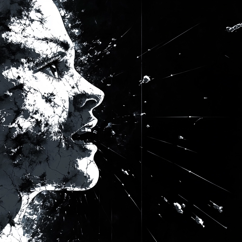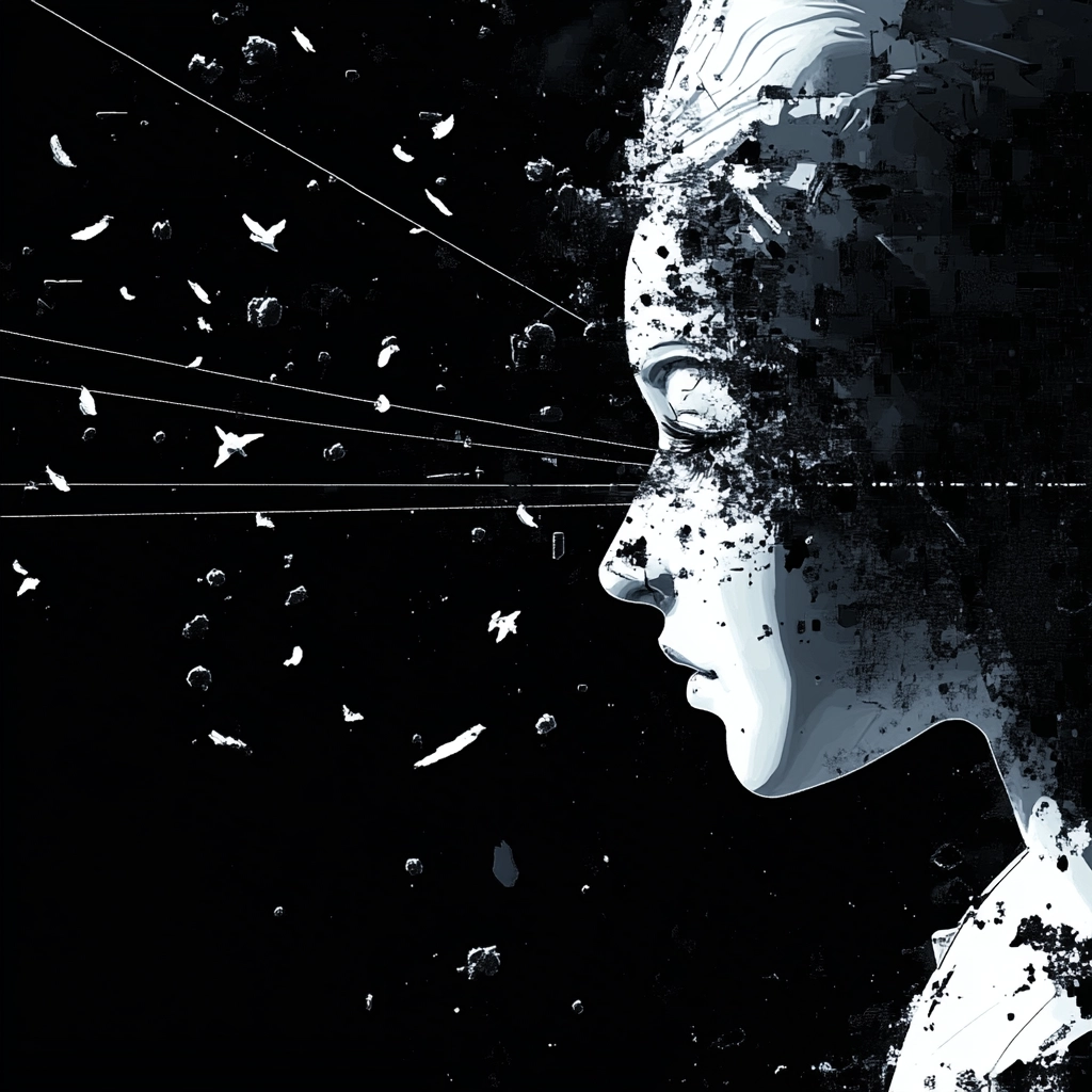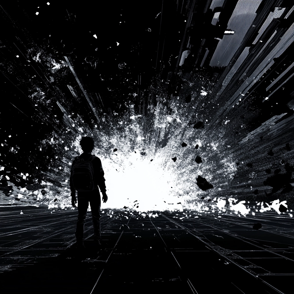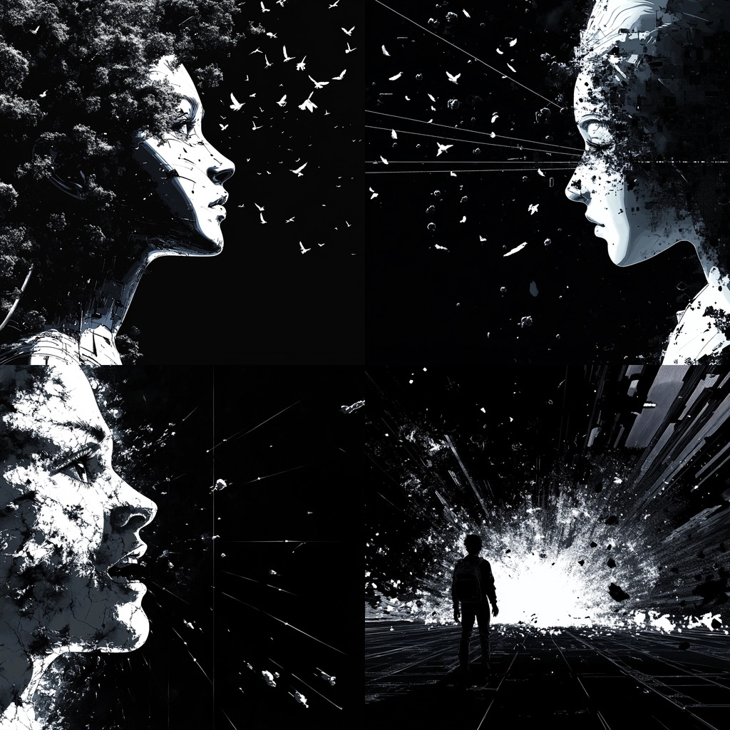 Intense lighting effects highlight the stark contrasts between black and white. The spatial arrangement creates a sense of depth and fragmentation, while the textures appear smooth for digital precision against more chaotic compositions. Light splinters and lines add dynamism and energy.