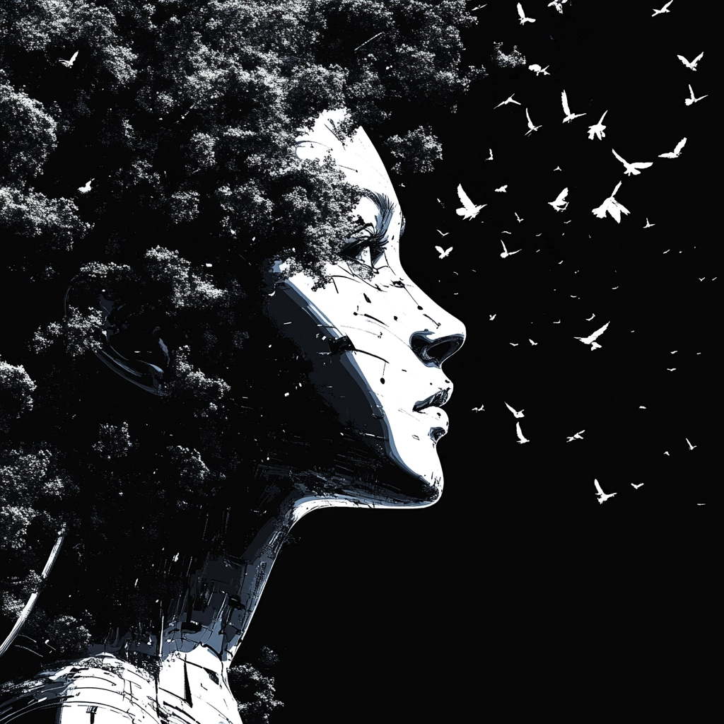 A sharp juxtaposition of black and white elements, creating strong visual contrasts.