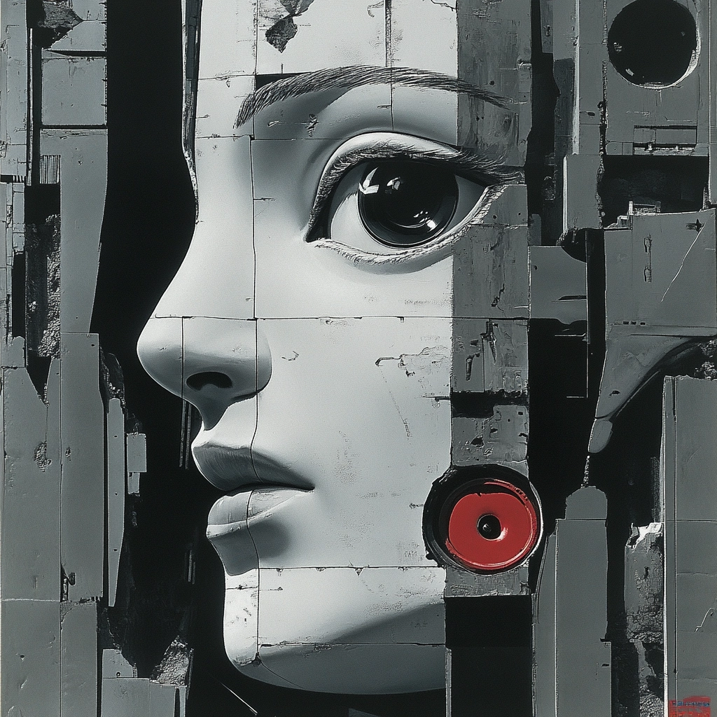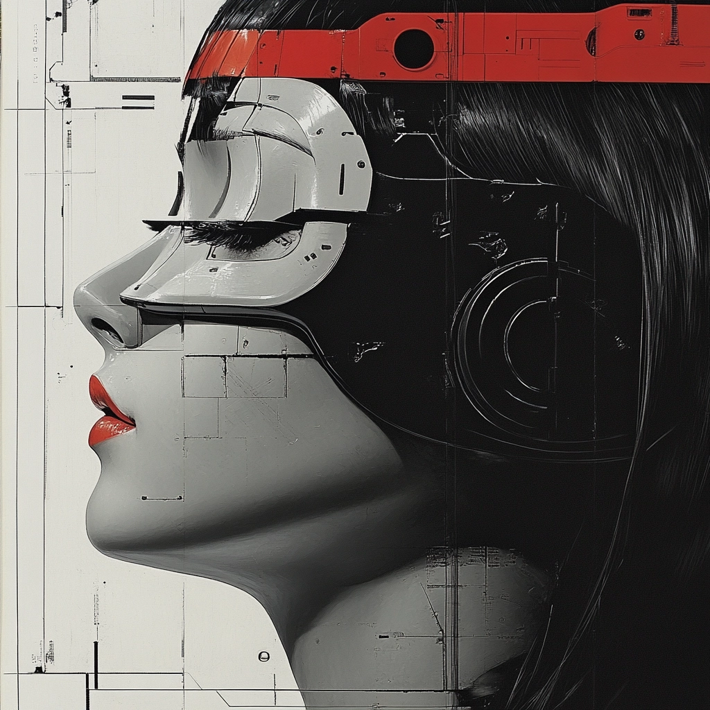 Intense lighting enhances the stark contrast between black and white elements, while red accents emphasize futuristic design. The texture is smooth and polished, evoking technological sophistication. A sense of depth is created through the interplay of light and shadow.