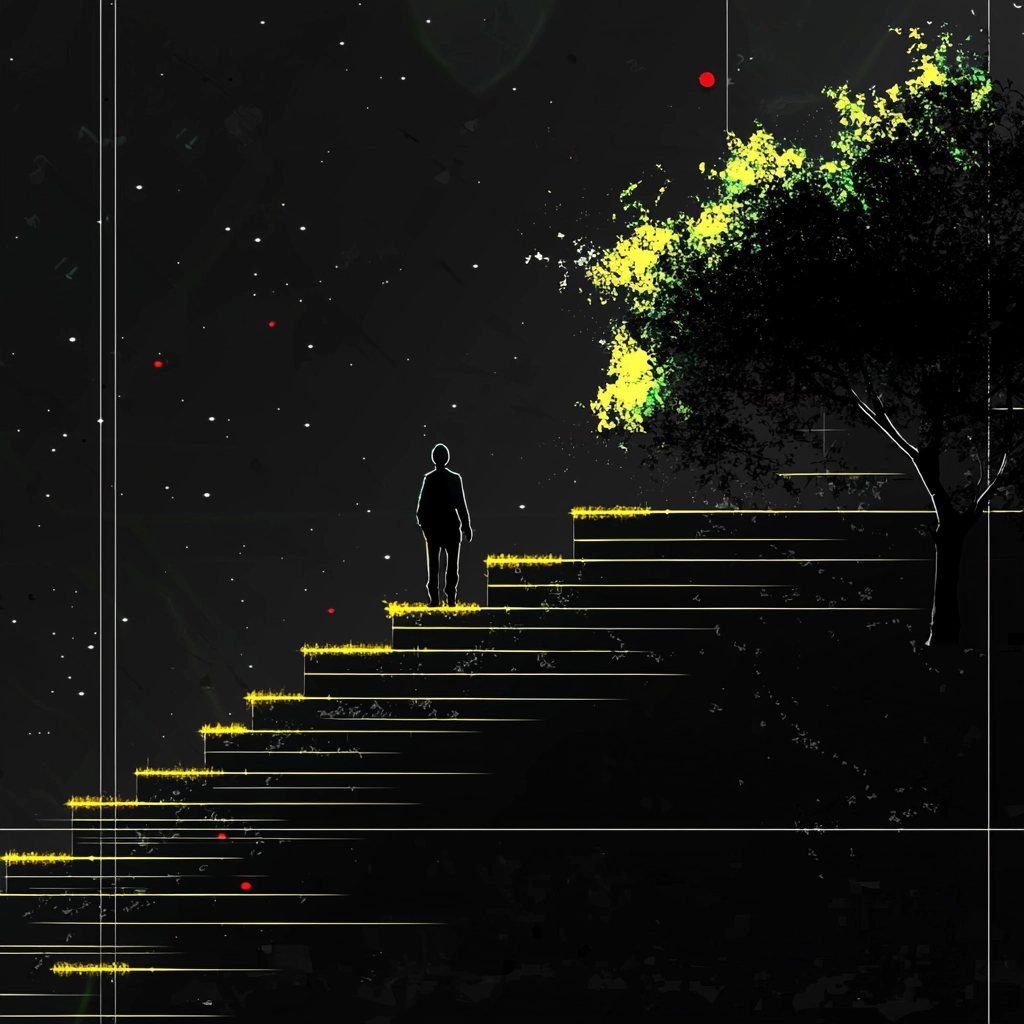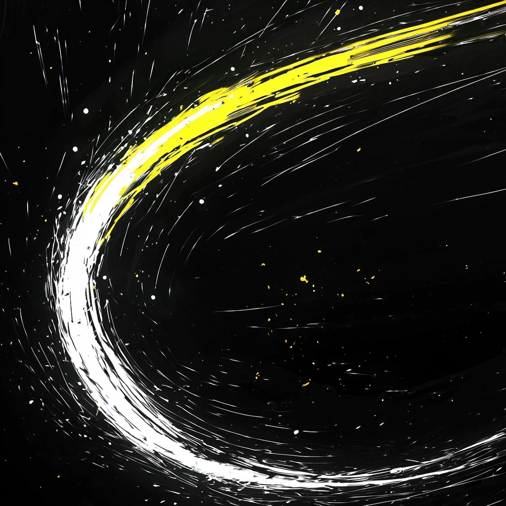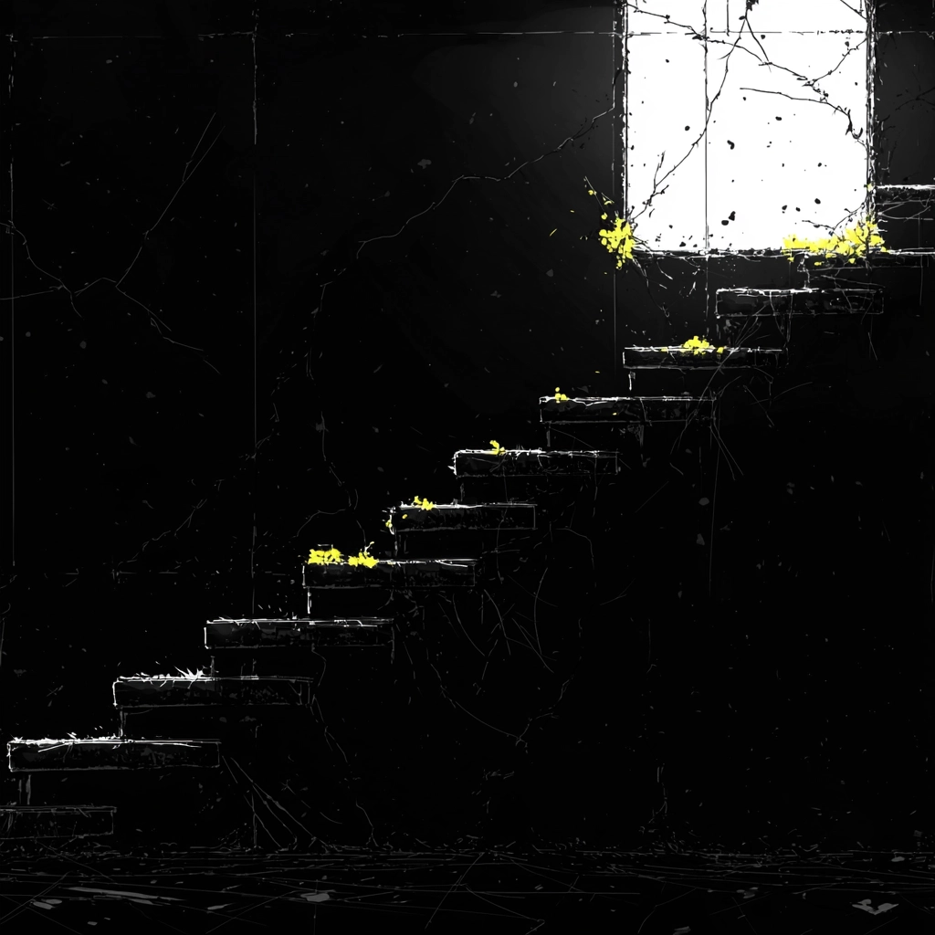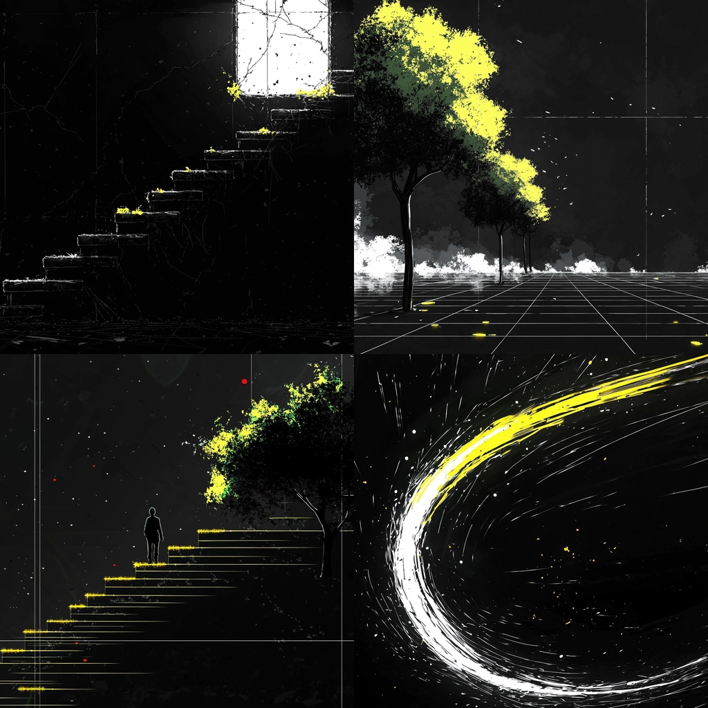 The lighting effects emphasize stark contrasts, with bright yellows and whites set against deep blacks. The spatial arrangement uses sharp lines to define perspectives while textured strokes add a sense of movement. Light sources dramatically punctuate otherwise shadowy spaces.