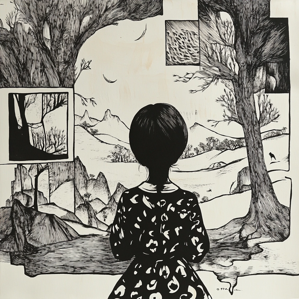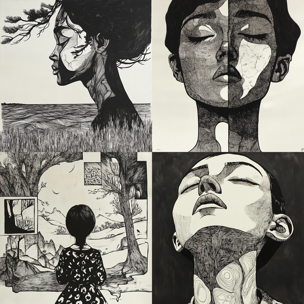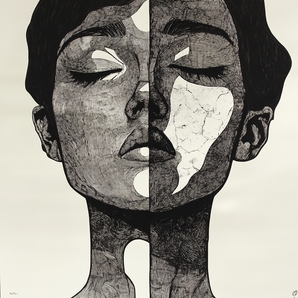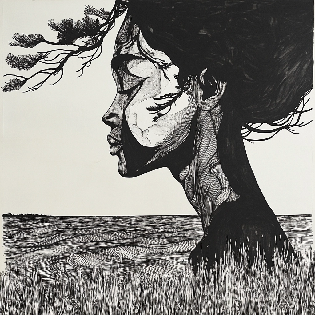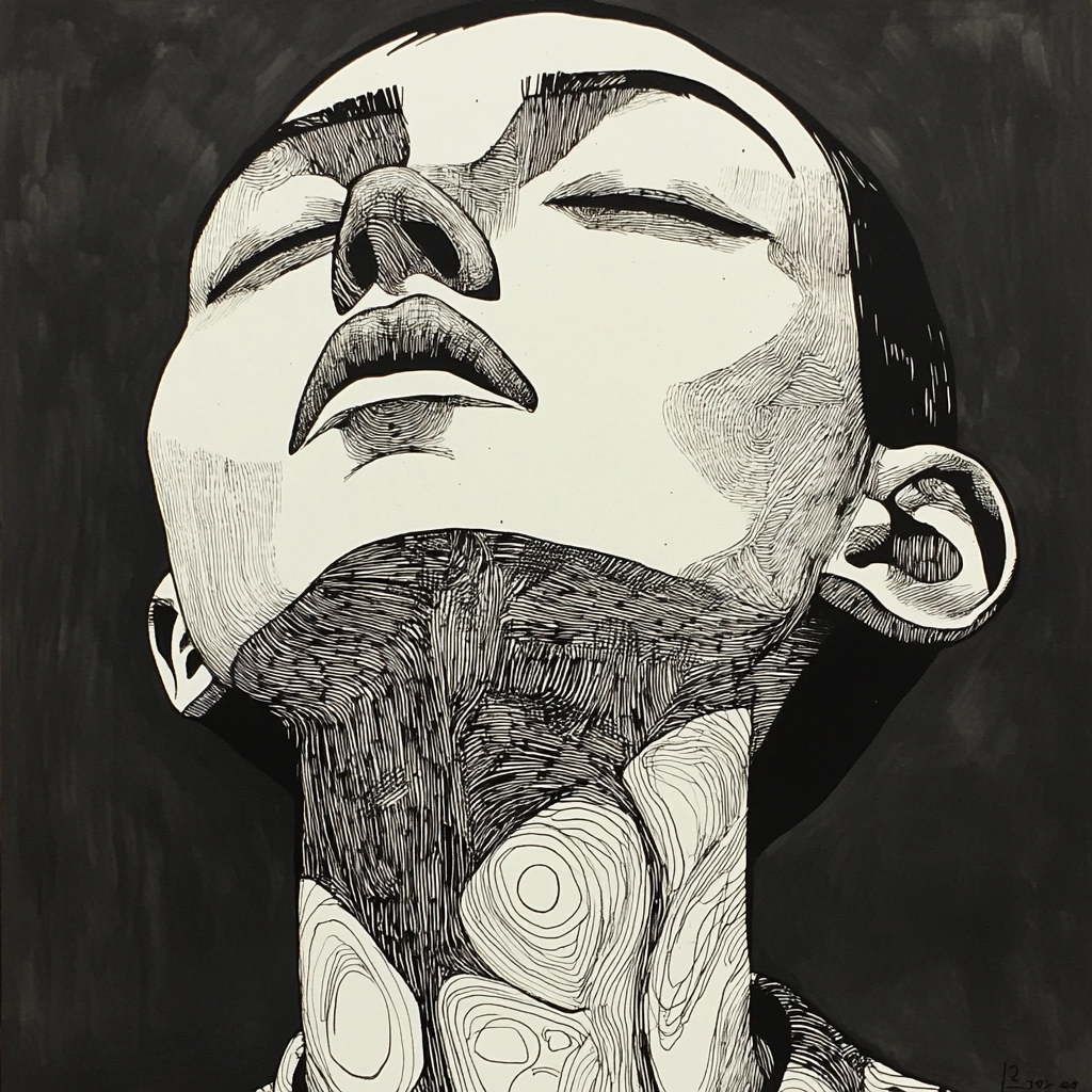 The high contrast between black ink and white background emphasizes the sharp, detailed lines and the intricate patterns. There's a strong sense of depth created through the use of negative space, and the texture is vividly expressed through meticulous linework.