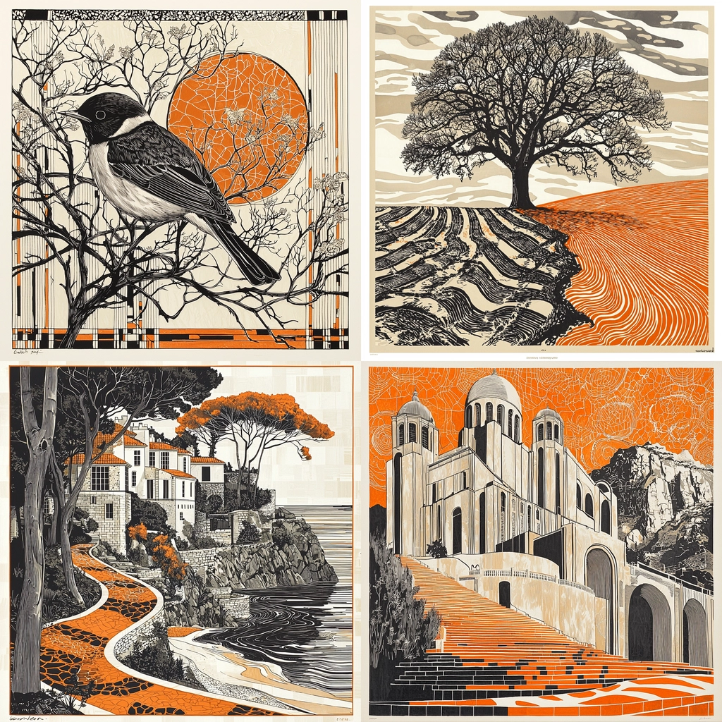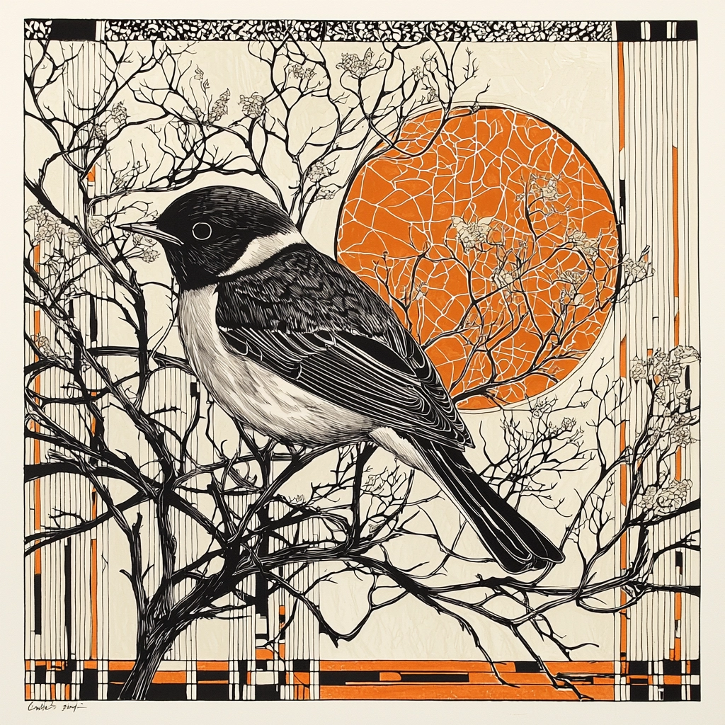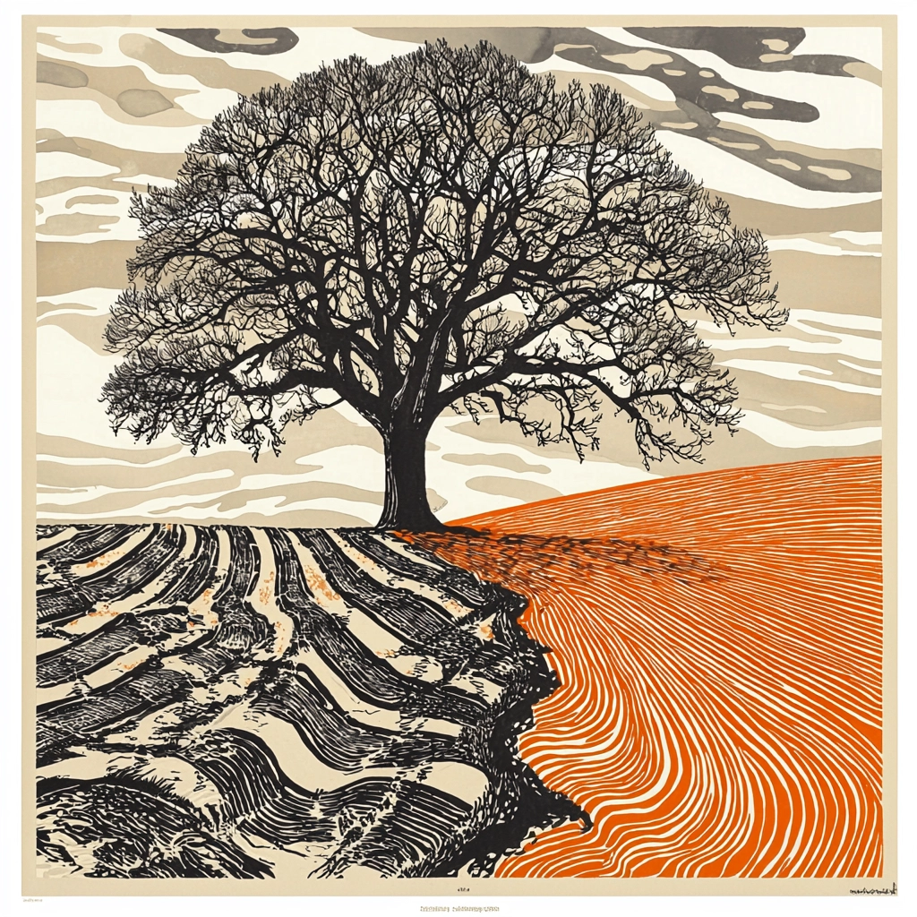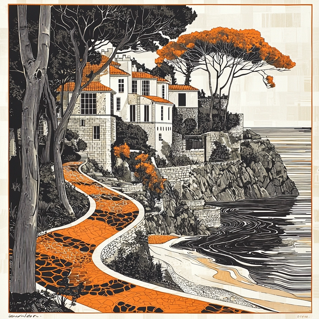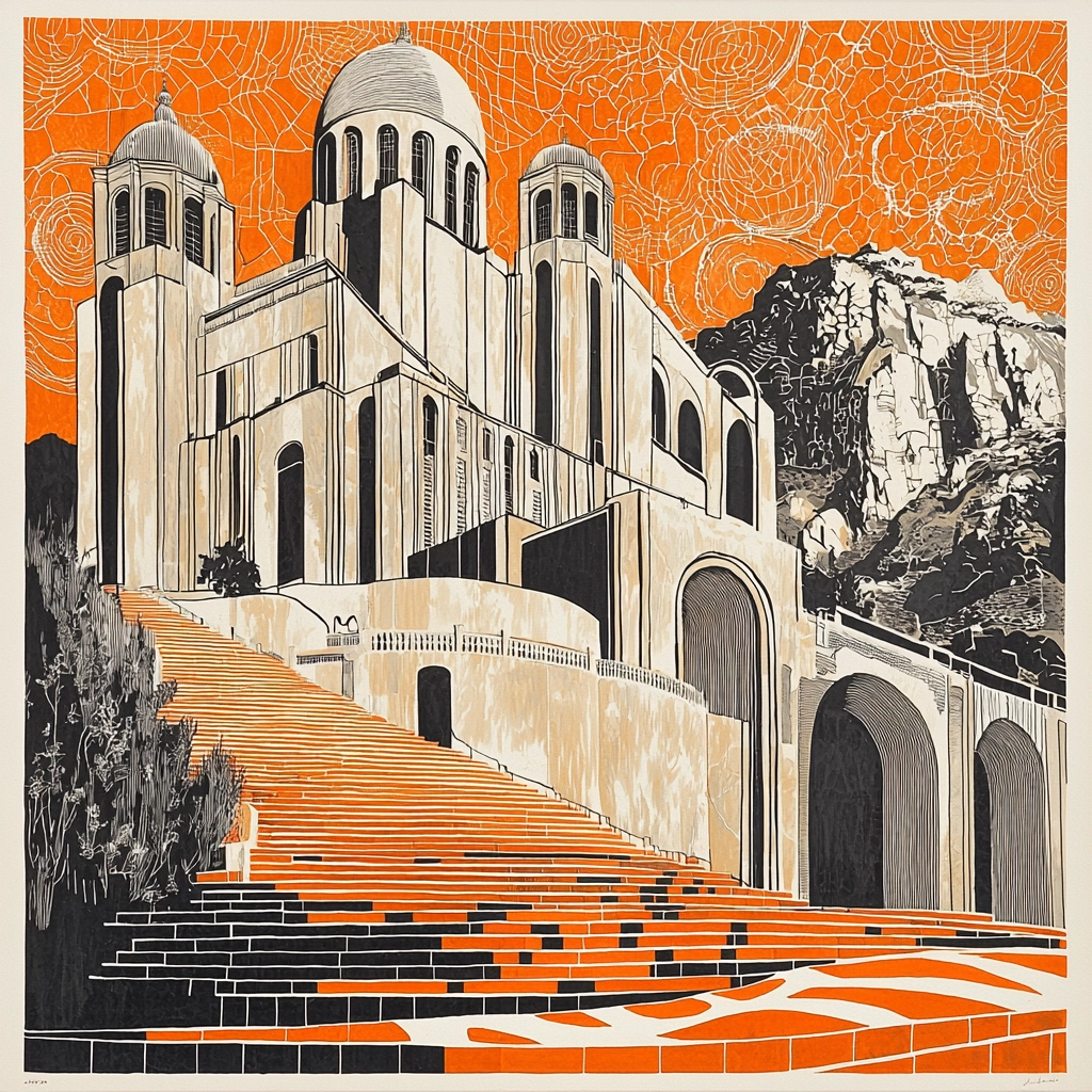 The artwork incorporates sharp, well-defined lines with strong contrast between black and orange, set against a muted beige. The intricate line work creates a deep sense of texture, while the strategic use of color emphasizes spatial depth and detail.