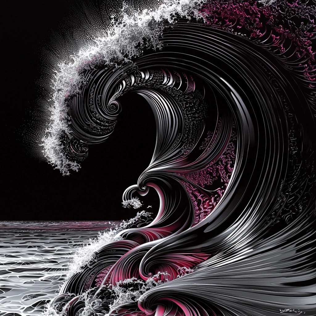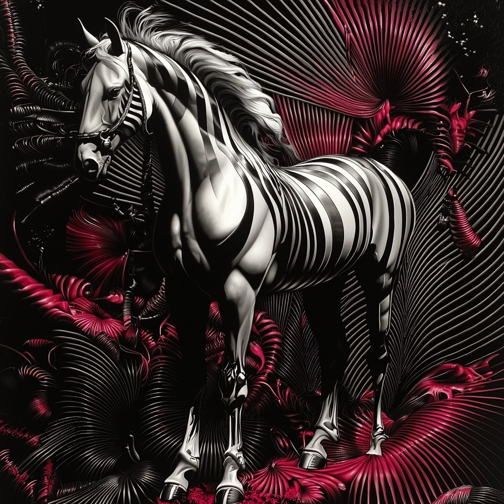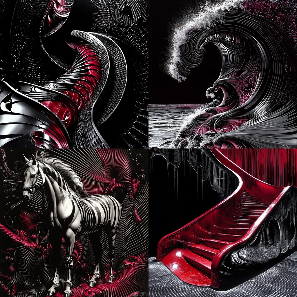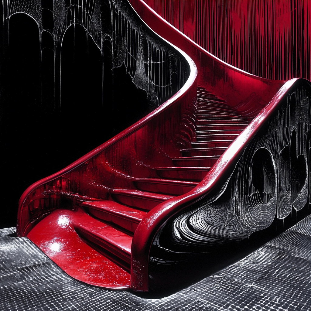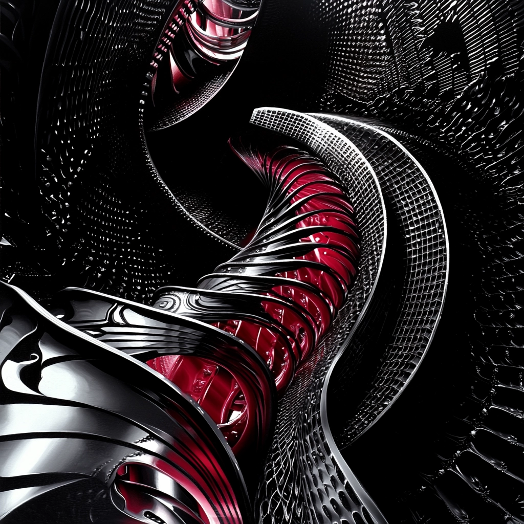 The lighting effects emphasize metallic textures, producing a high contrast with deep shadows. The colors are vivid and intense, with reds and blacks dominating. The sense of space is tightly controlled, giving a feeling of intricate depth and movement through repeated striations and fluid forms.