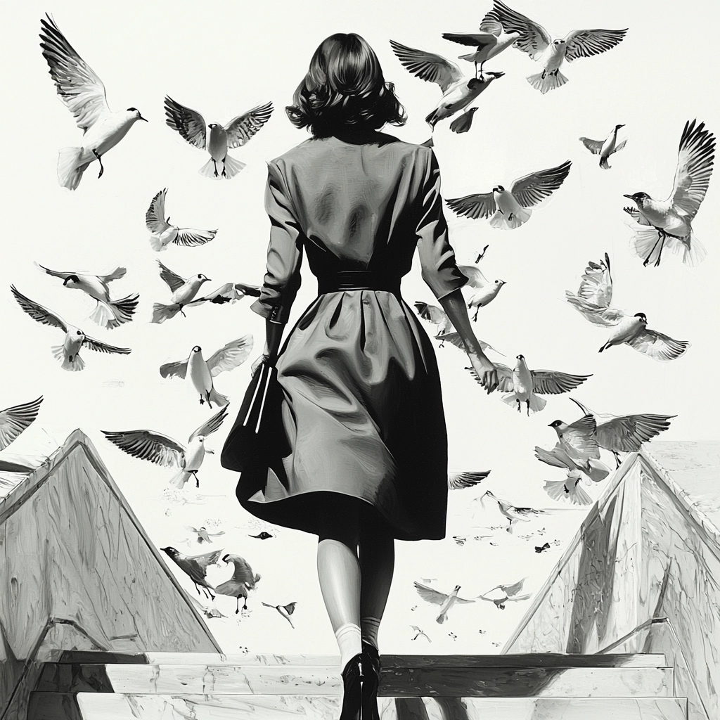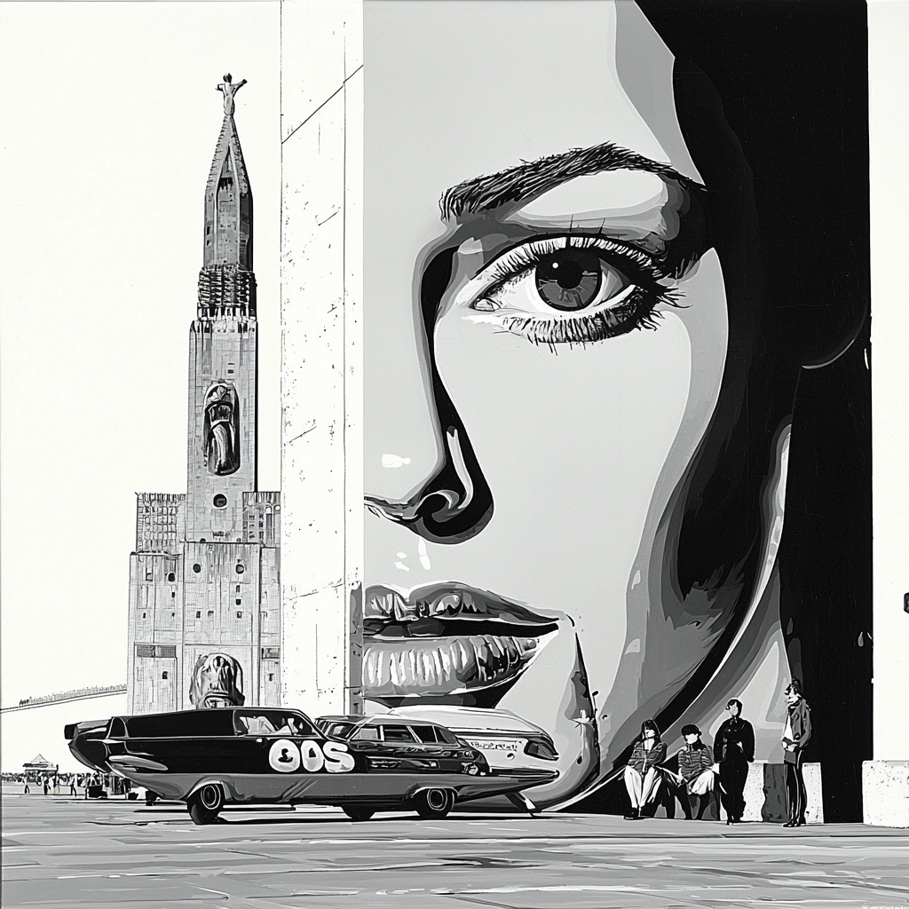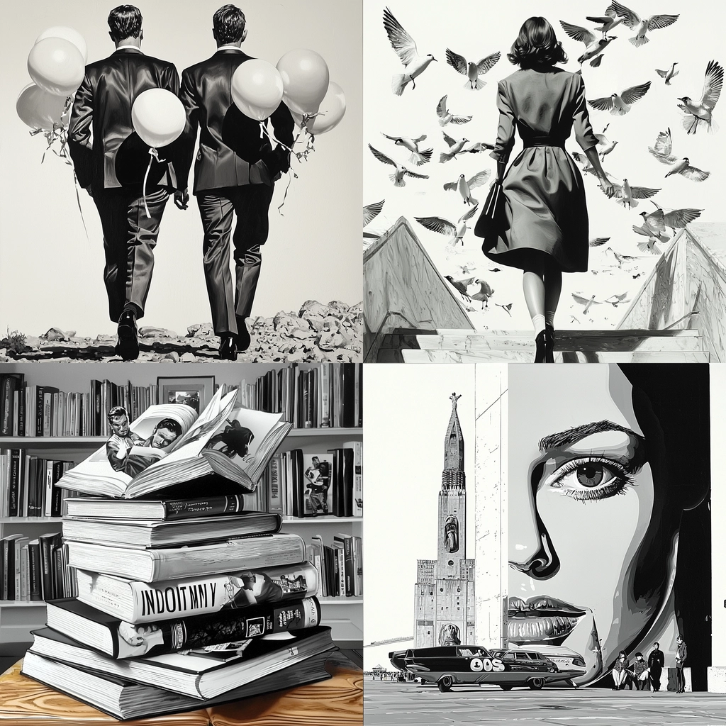 The lighting creates stark contrasts, emphasizing the details and textures through clean, sharp lines. Shades of gray moderate the transitions between black and white, contributing to a crisp, well-defined spatial sense and highlighting various textures present in the scene.