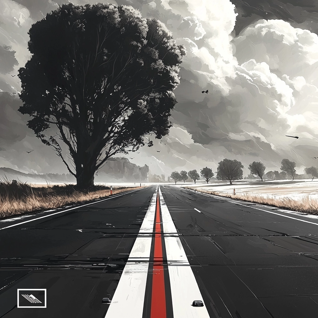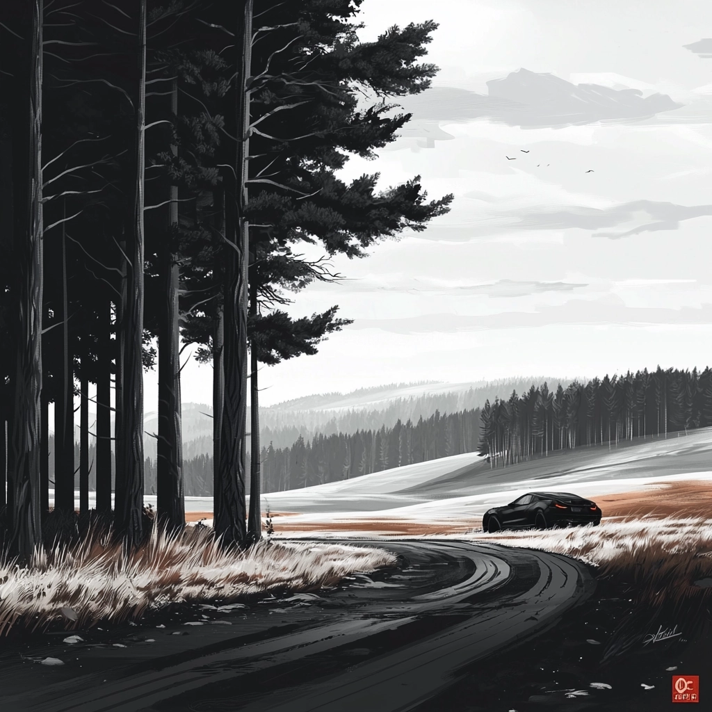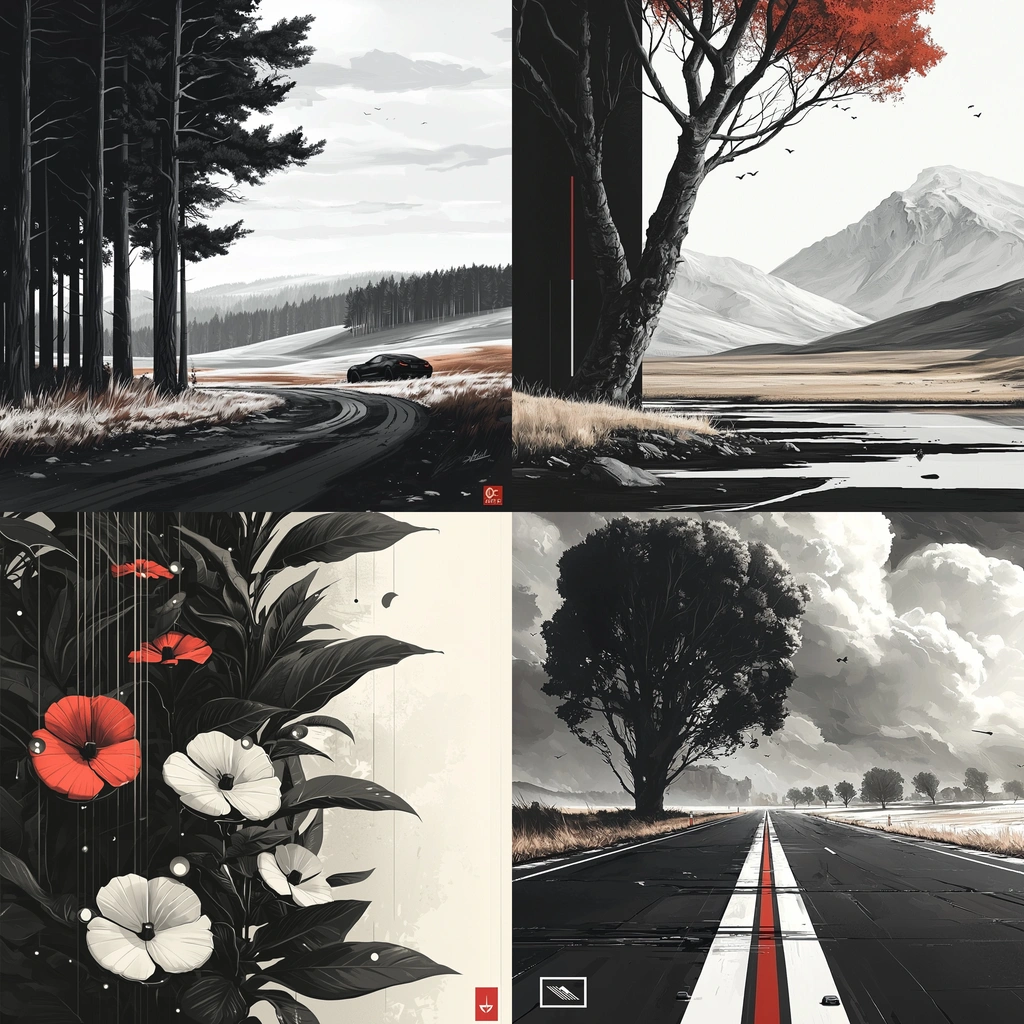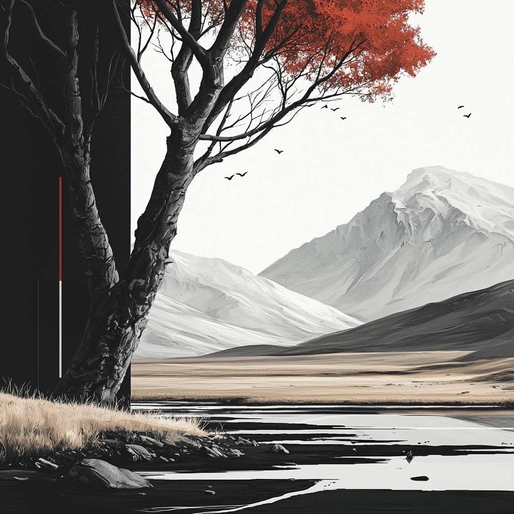 Natural lighting highlights stark black and white contrasts, with textured detail in the landscapes. The use of red enhances focal points, creating a sense of depth. Smooth transitions between light and shadow contribute to a strong sense of space.
