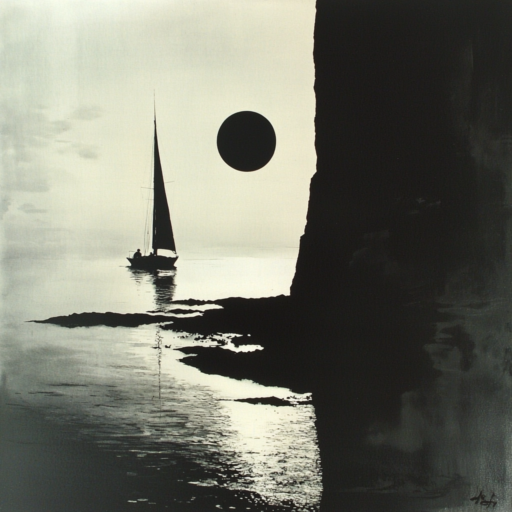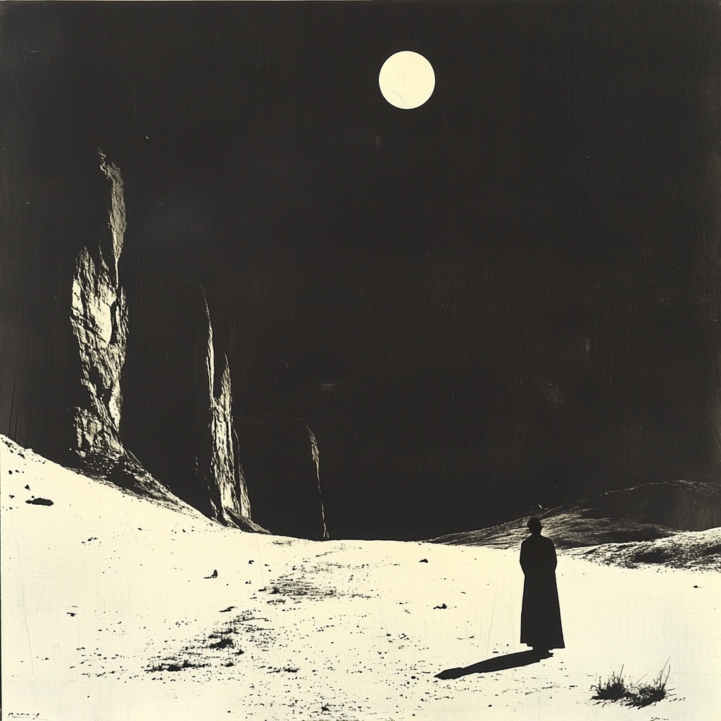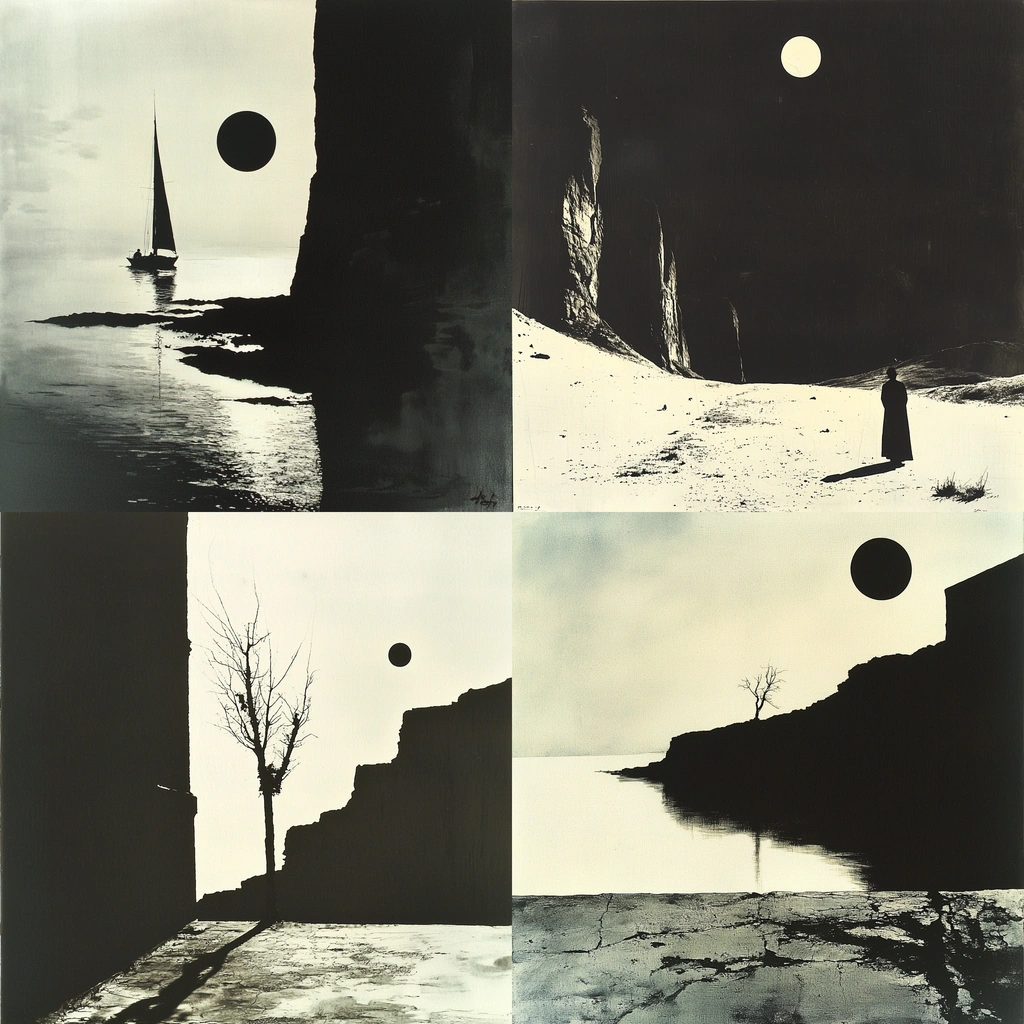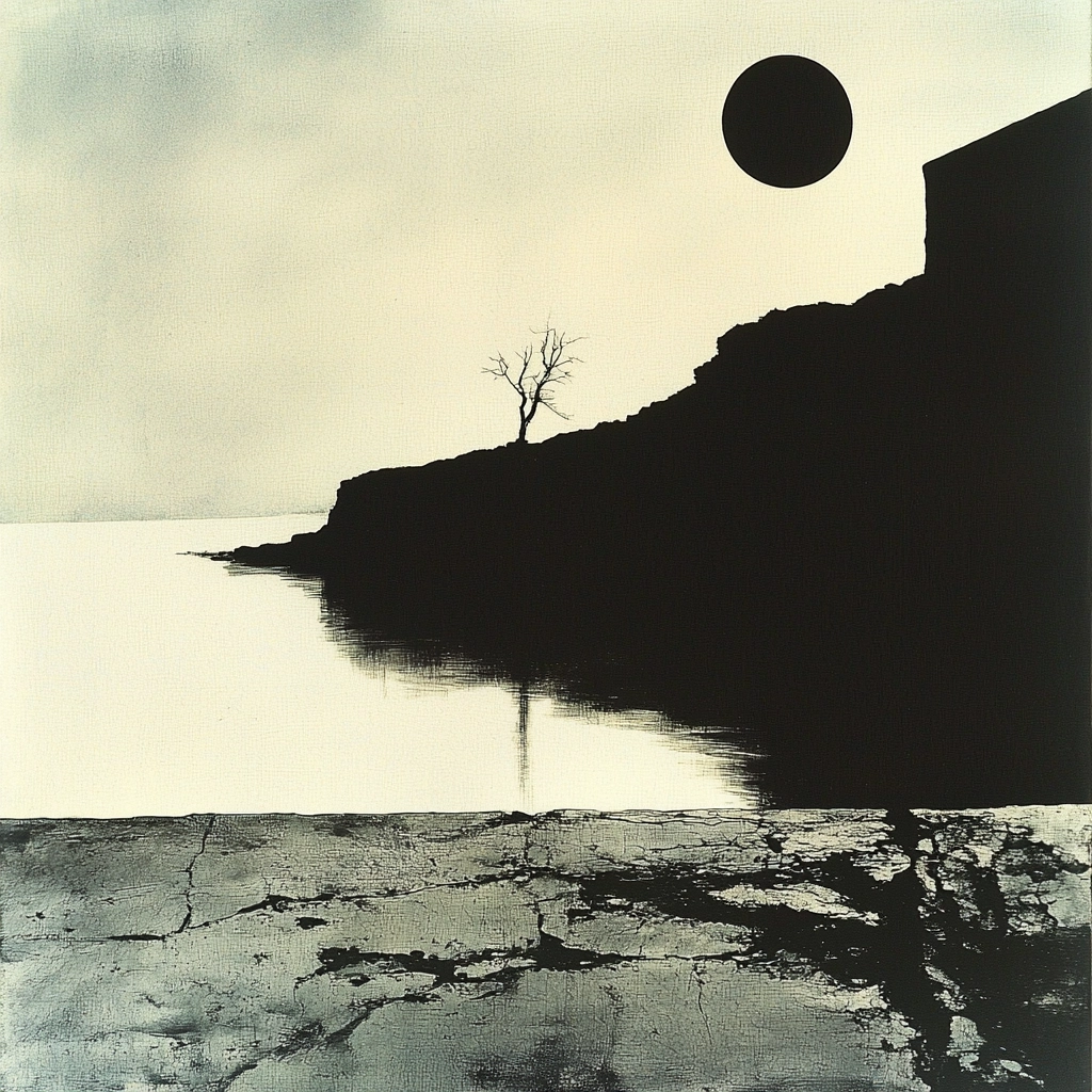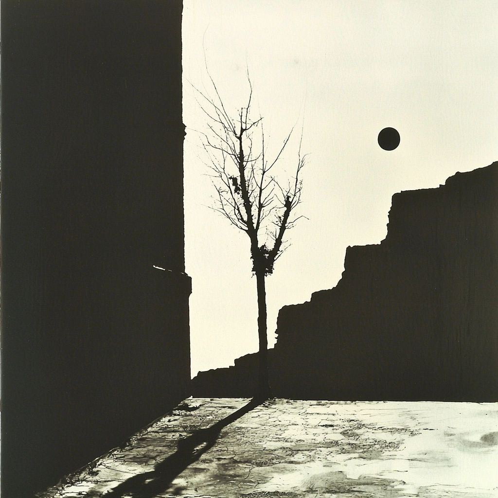 The lighting creates stark contrasts, emphasizing the profound interplay between light and darkness. The textures range from smooth to rough, and the spatial composition draws attention to differing depths and contours.