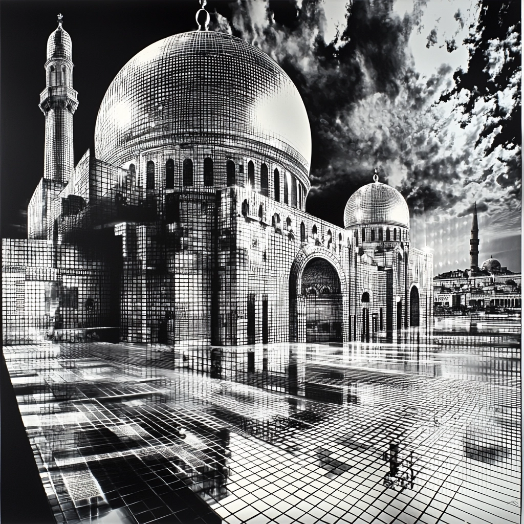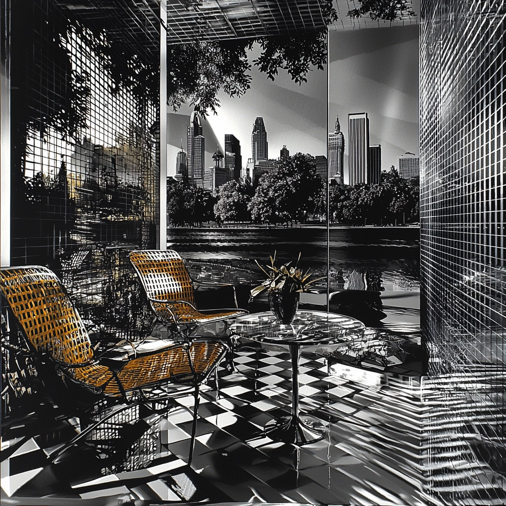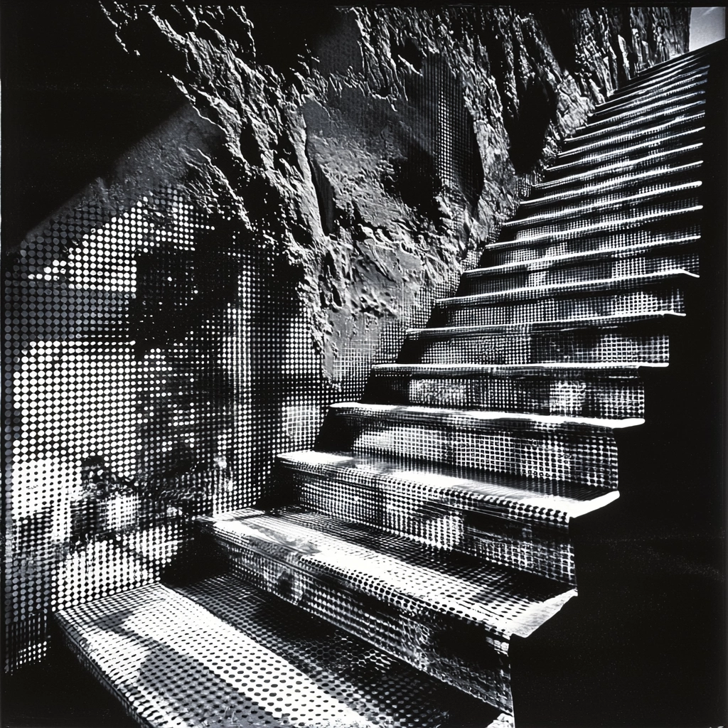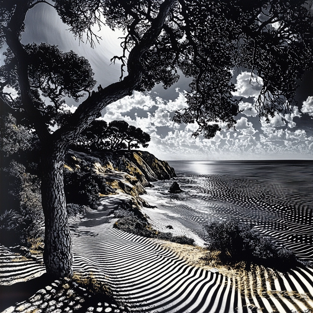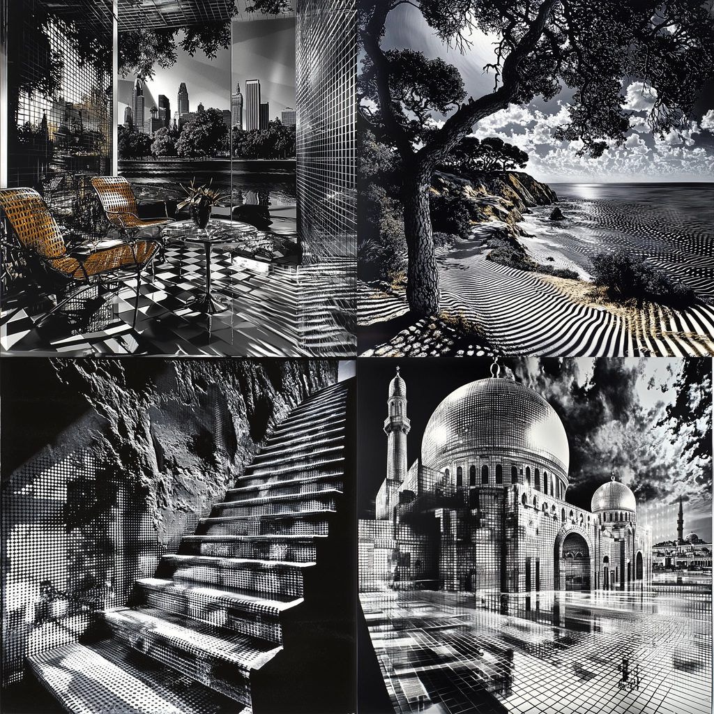 Strong contrast highlights intricate patterns and creates a bold dynamism. The patterns traversing surfaces introduce an unexpected rhythm that challenges spatial perspective. The sharp texture suggests a tactile, elaborate feel across the depicted scenes.