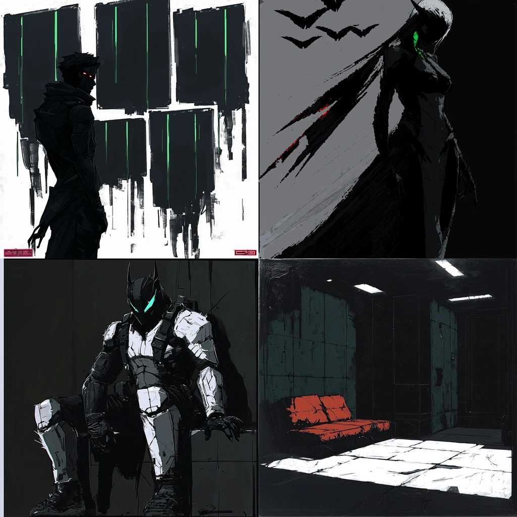 Bold contrast with sharp lines and stark color divides, accented by vivid neon elements.