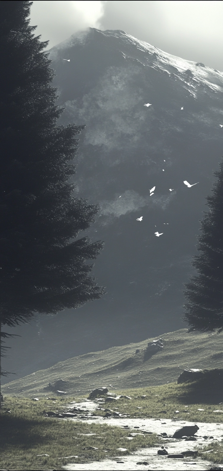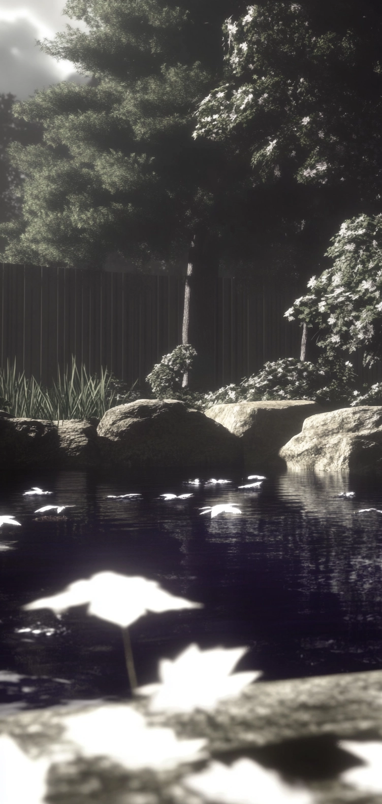 Illuminated areas juxtaposed with deep shadows create a strong visual contrast. The natural scenery is enriched by textures that add depth, and the spatial arrangement fosters a sense of vastness. The lighting effects highlight the contrasts between light and dark, adding a dramatic touch to the environment.