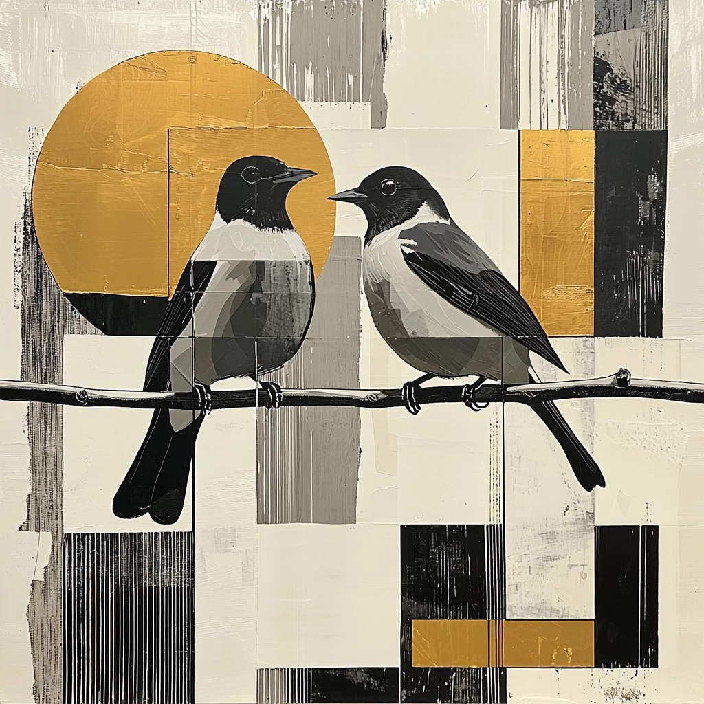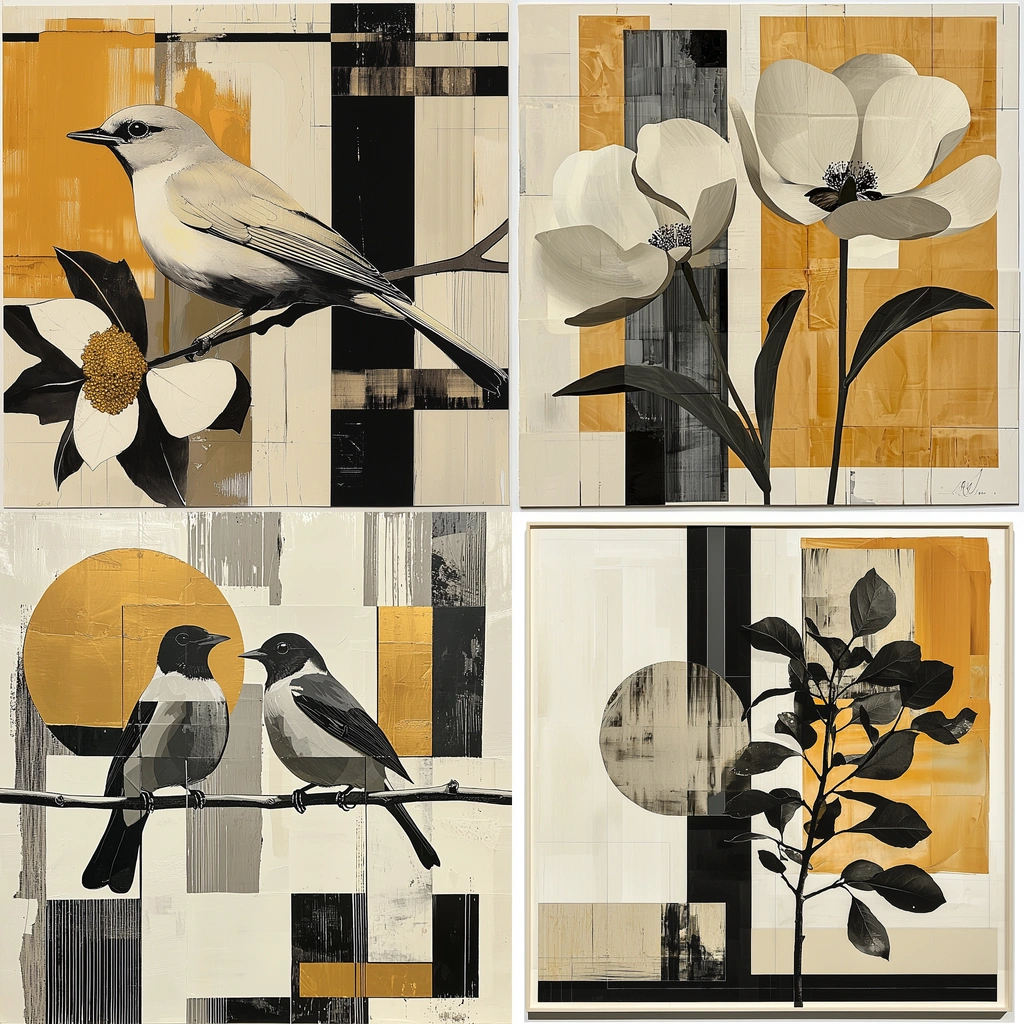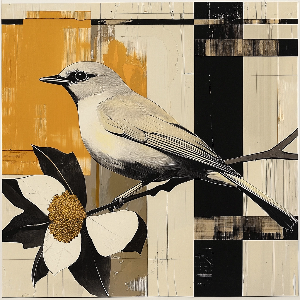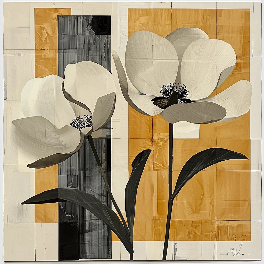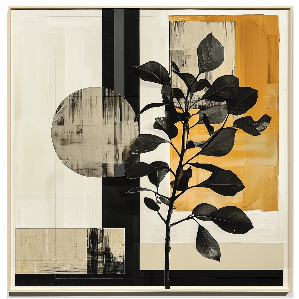 The composition features a geometric interplay of high contrast elements with nature-inspired motifs.
