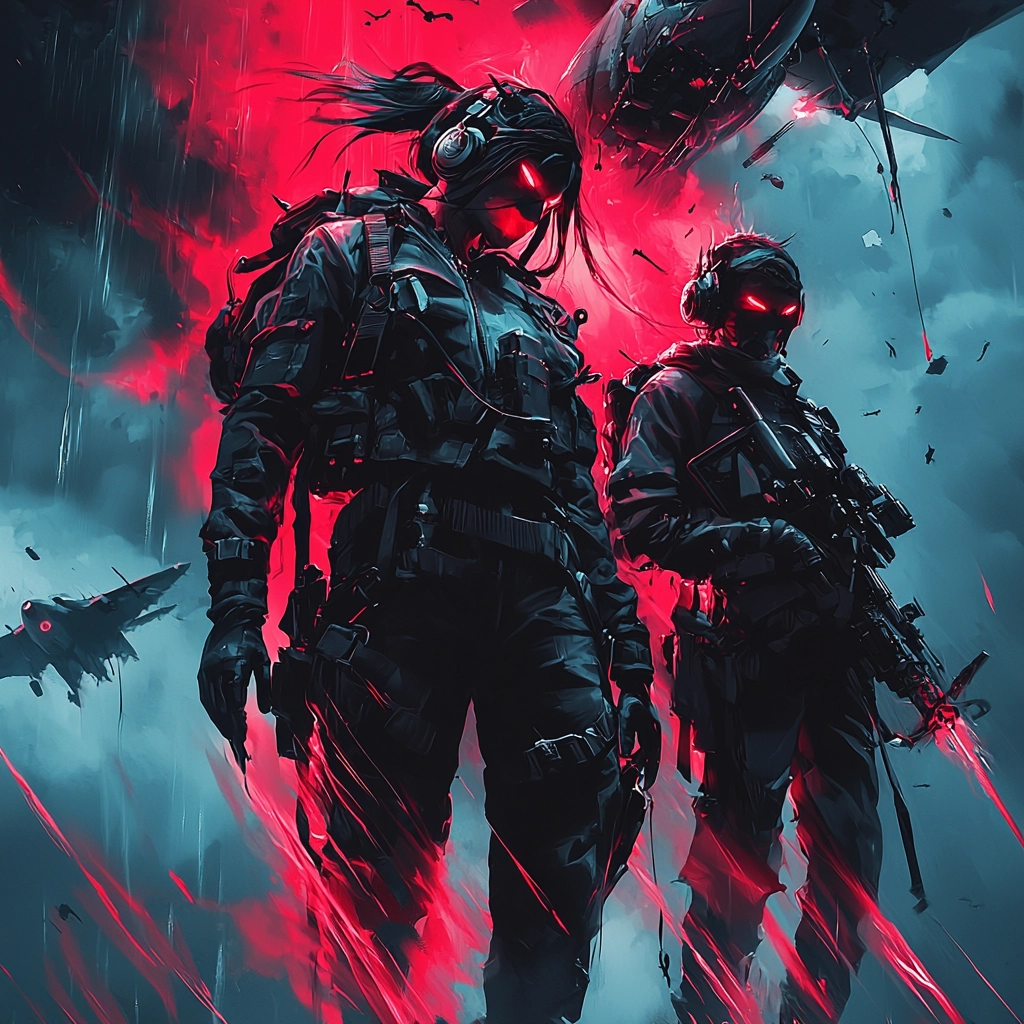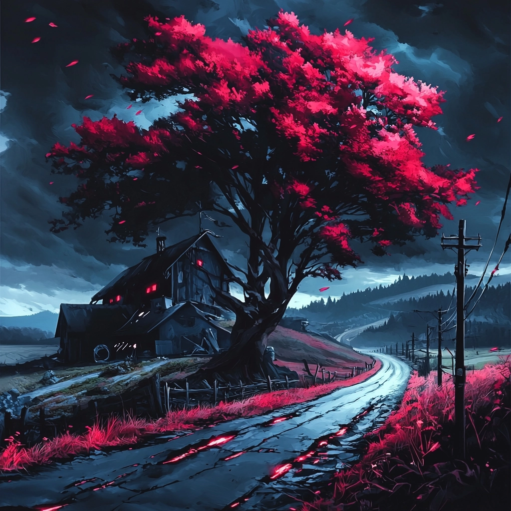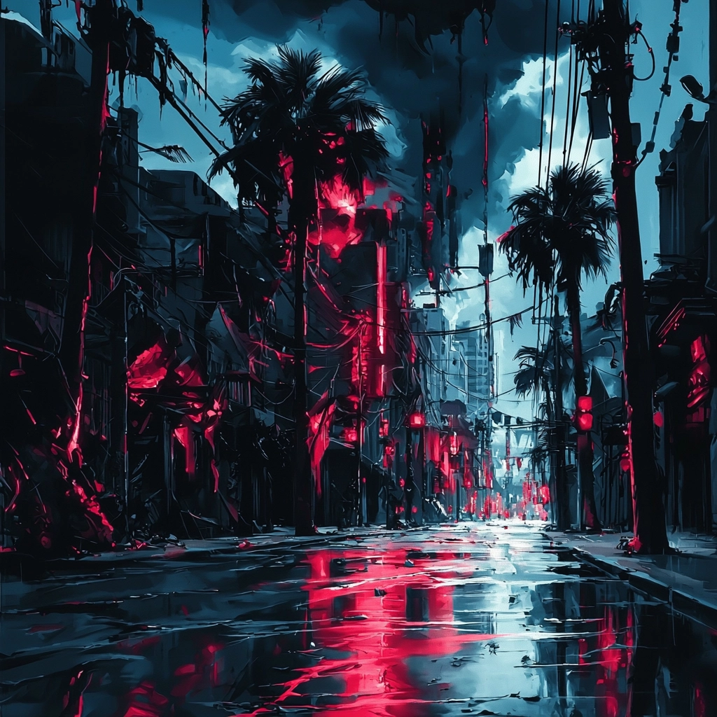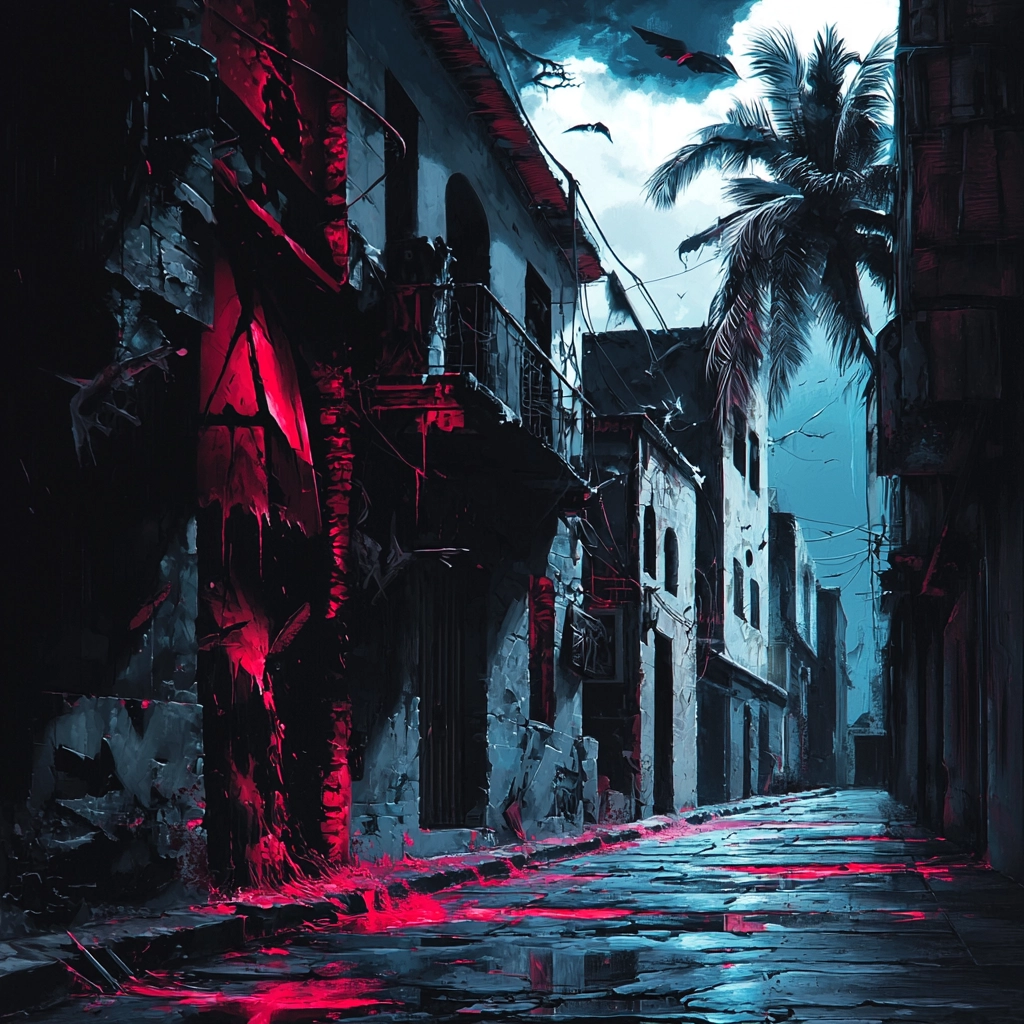 The lighting creates dramatic shadows, with vivid red and deep dark blue emphasizing sharp contrasts. The texture of surfaces enhances depth, while the spatial arrangement suggests expansive, layered dimensions.