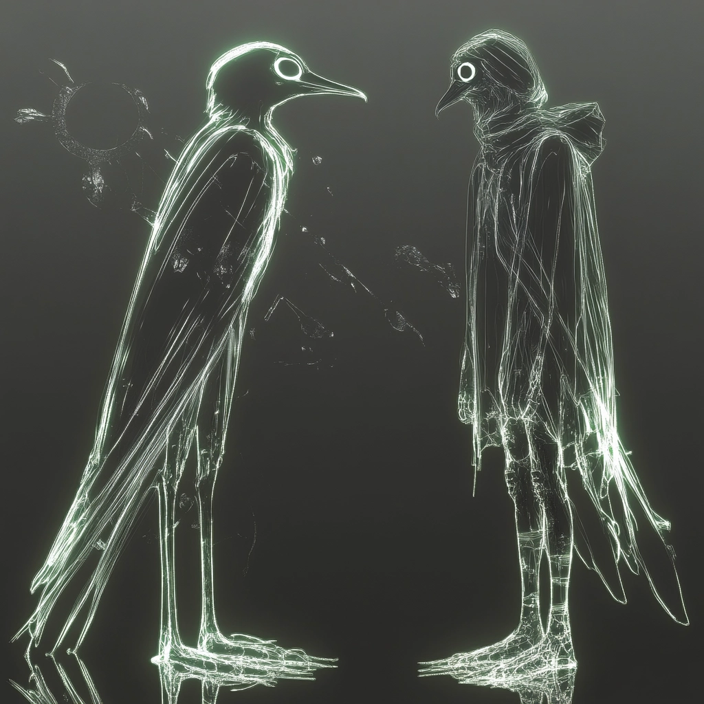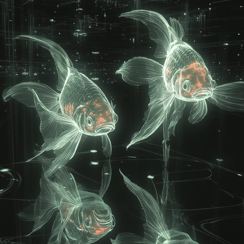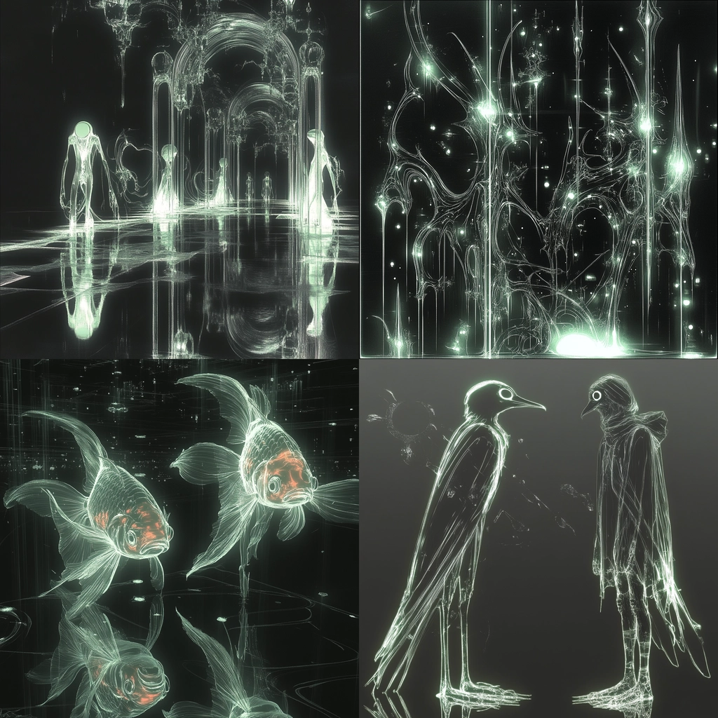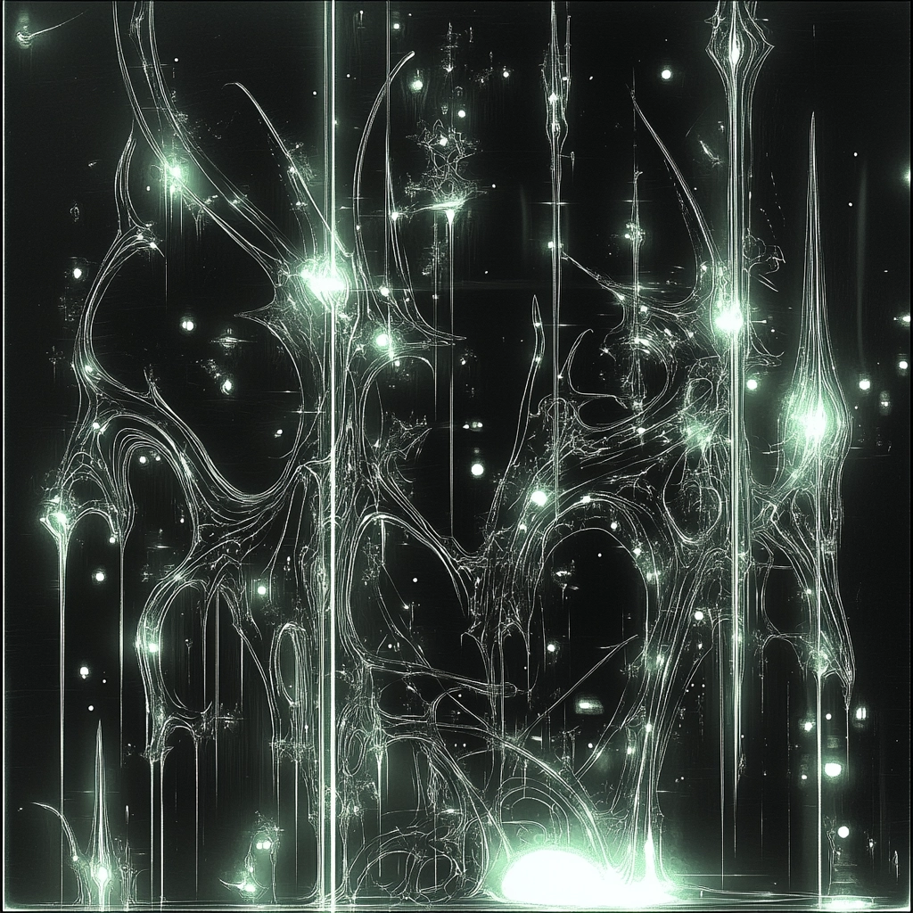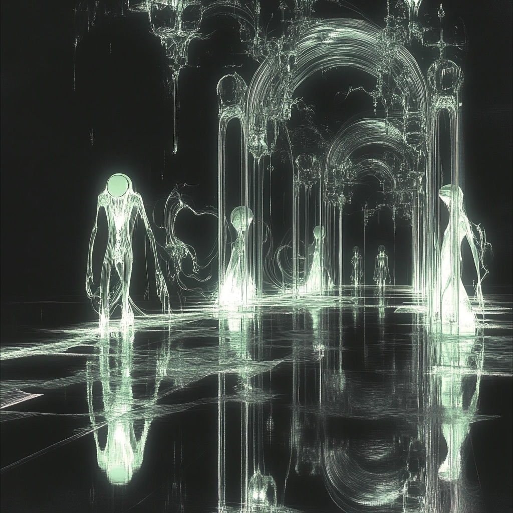 The scene exhibits striking luminosity achieved by neon lighting effects against a dark atmosphere. The spatial depth is created through clear reflections and intricately glowing lines, suggesting a seamless and fluid sense of space.
