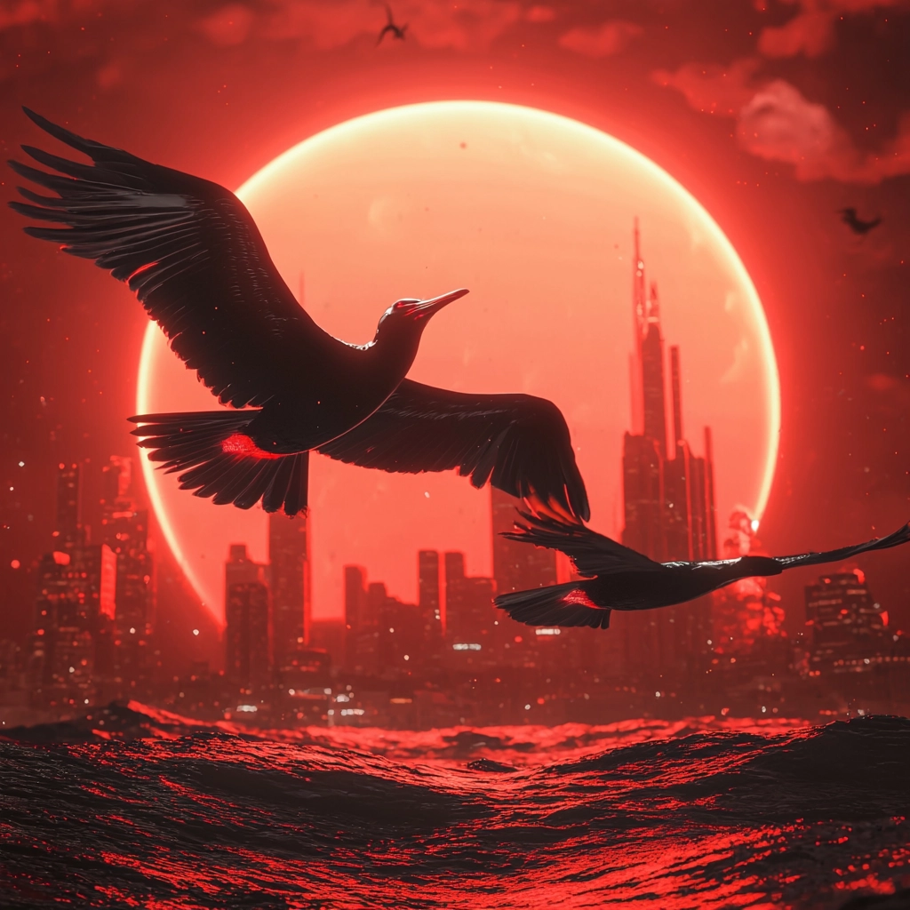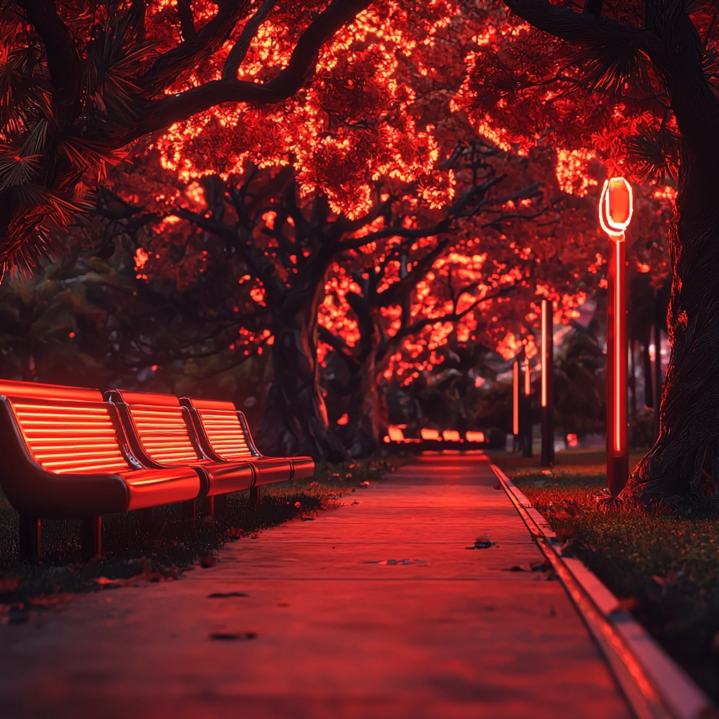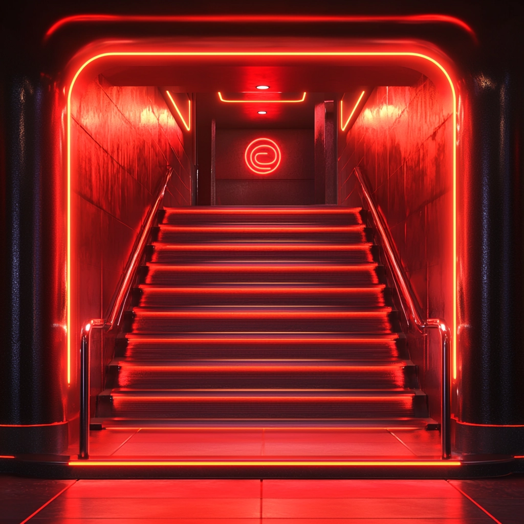 The lighting is vivid, casting sharp highlights and deep shadows. Colors are predominantly red against a black backdrop, creating a dramatic tension. The spatial sense is confined yet clearly defined, while textures are smooth with glossy surfaces.