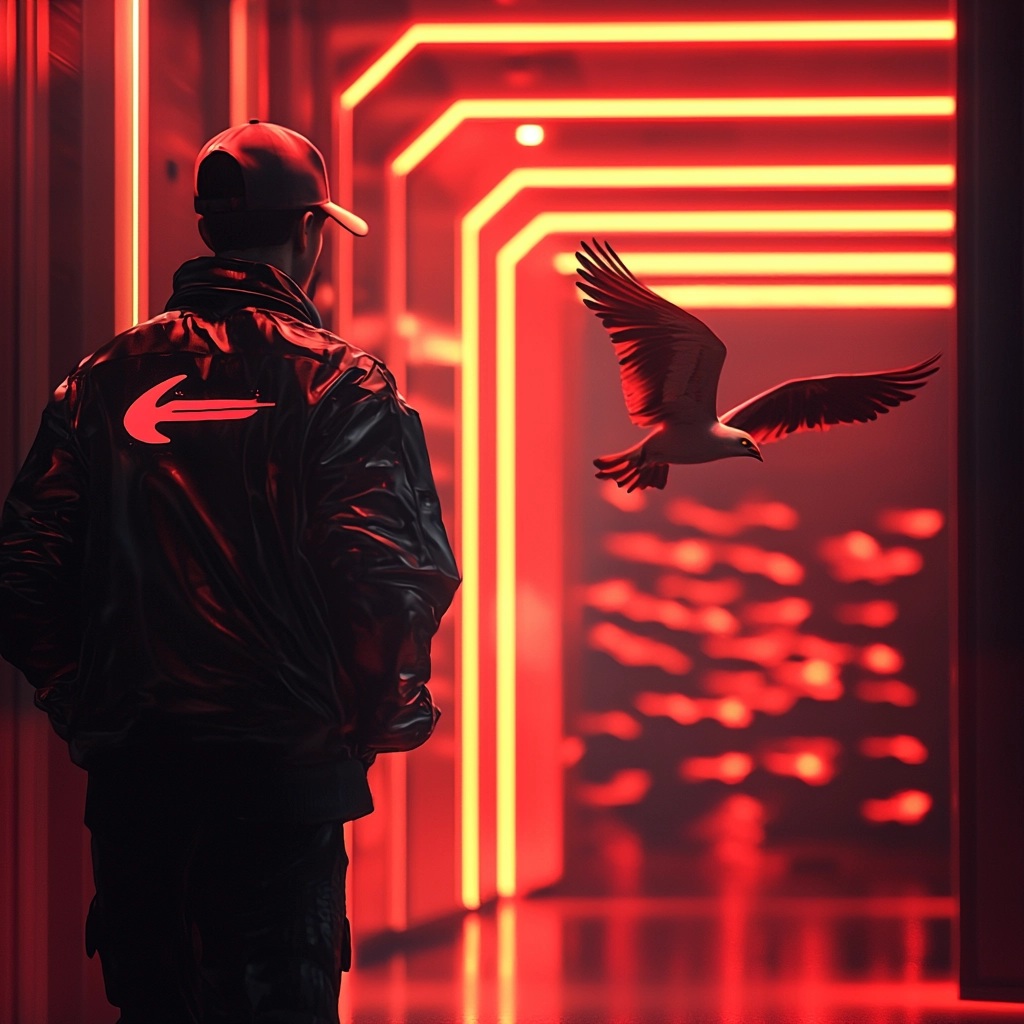 A striking use of intense illumination among dark spaces, emphasizing bold contrasts.