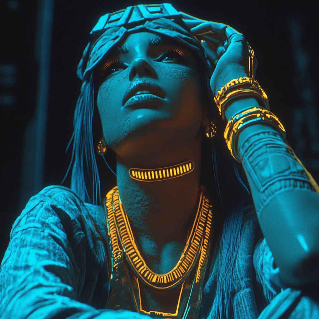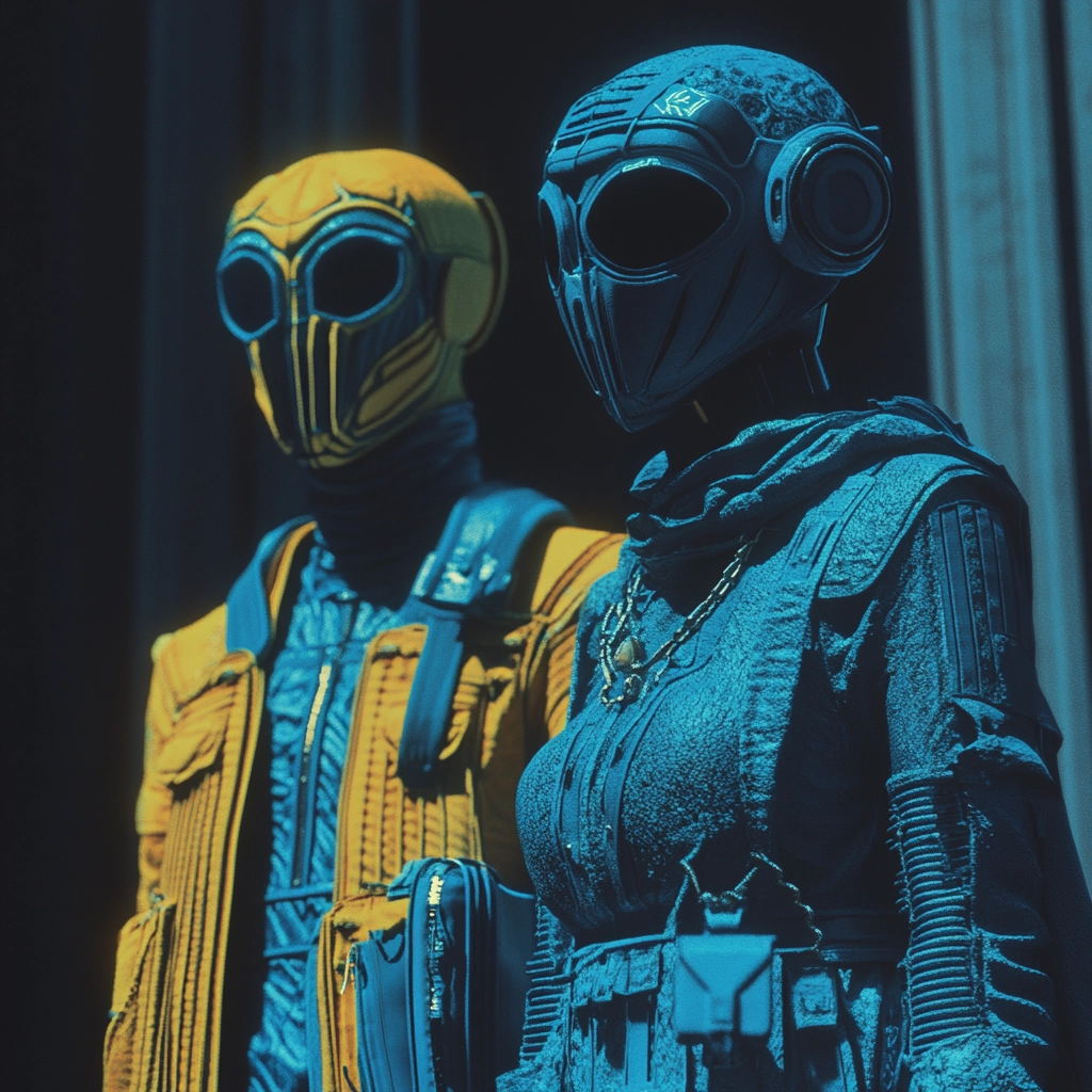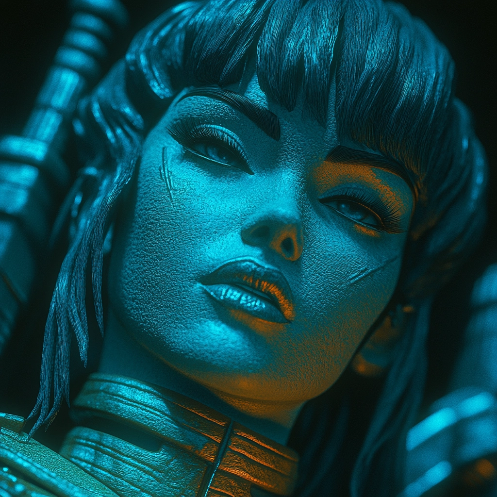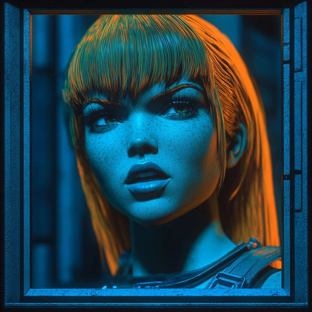 Strong use of contrasting colors and sharp details emphasizing a futuristic aesthetic.