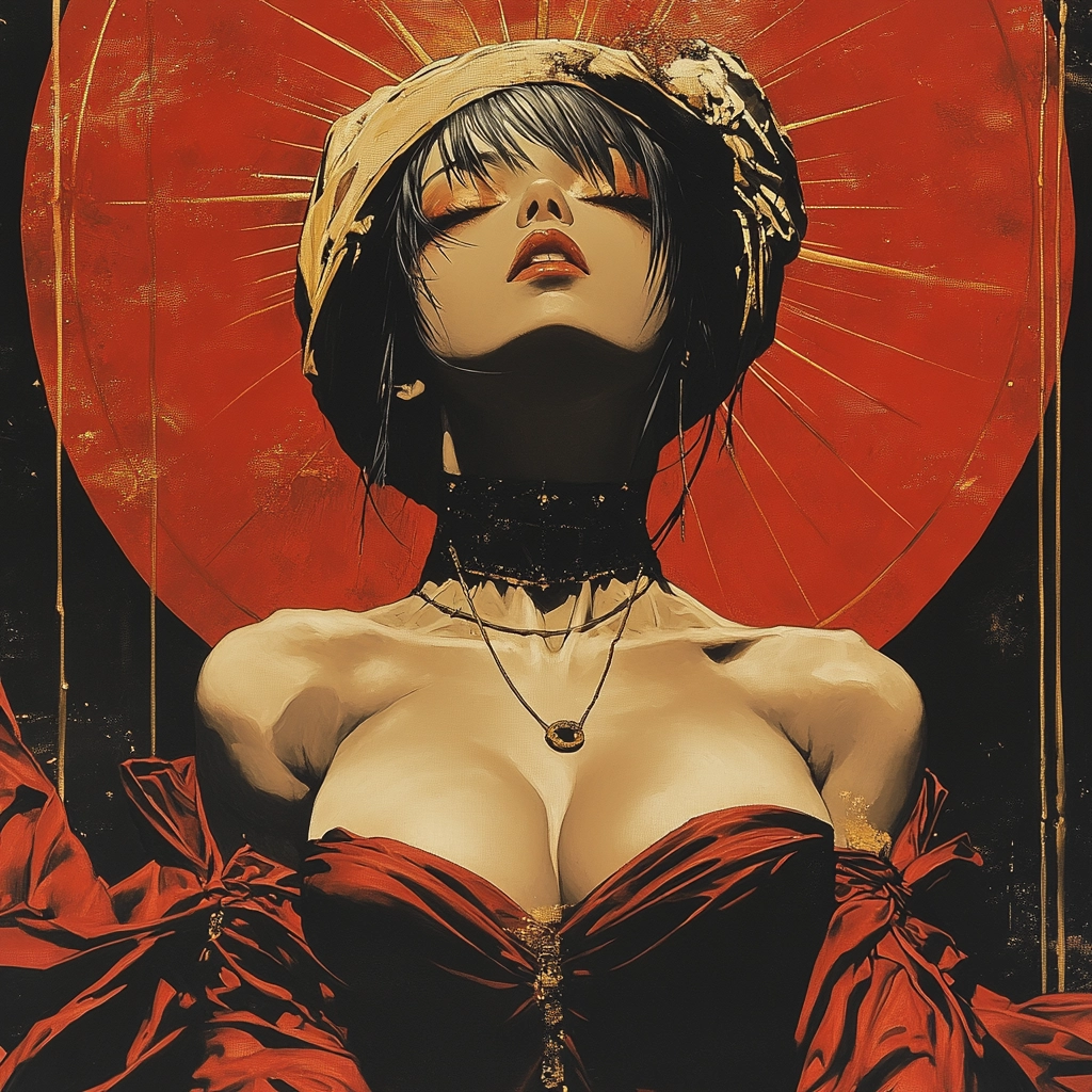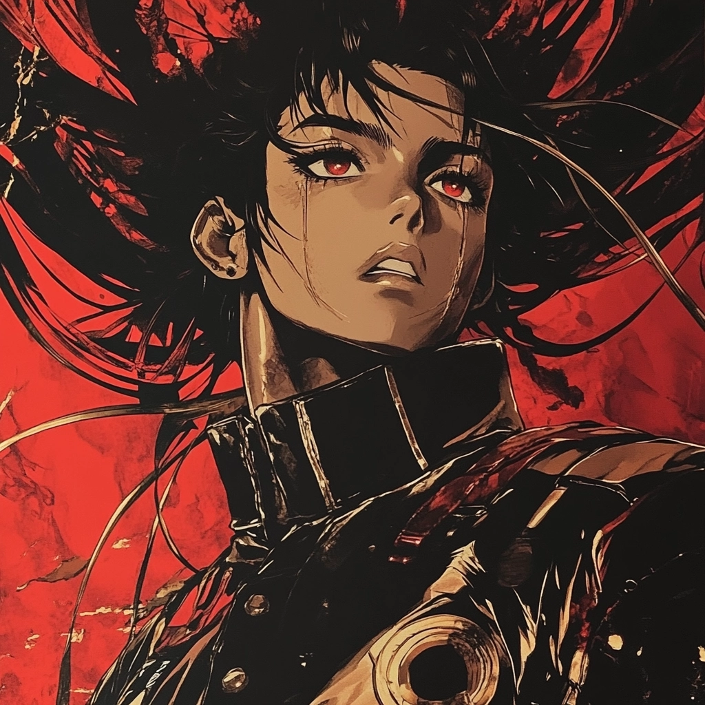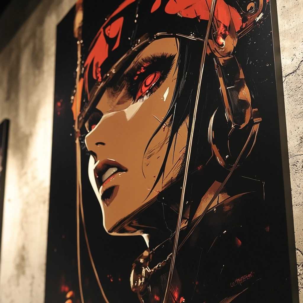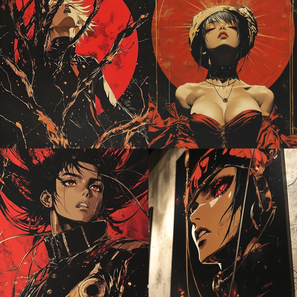 The lighting is sharp with dramatic contrasts between red and black. The colors are vibrant and saturated, giving depth and energy to the visual elements. There is a strong sense of spatial depth with detailed textures that highlight the intricate aspects of the illustrations.