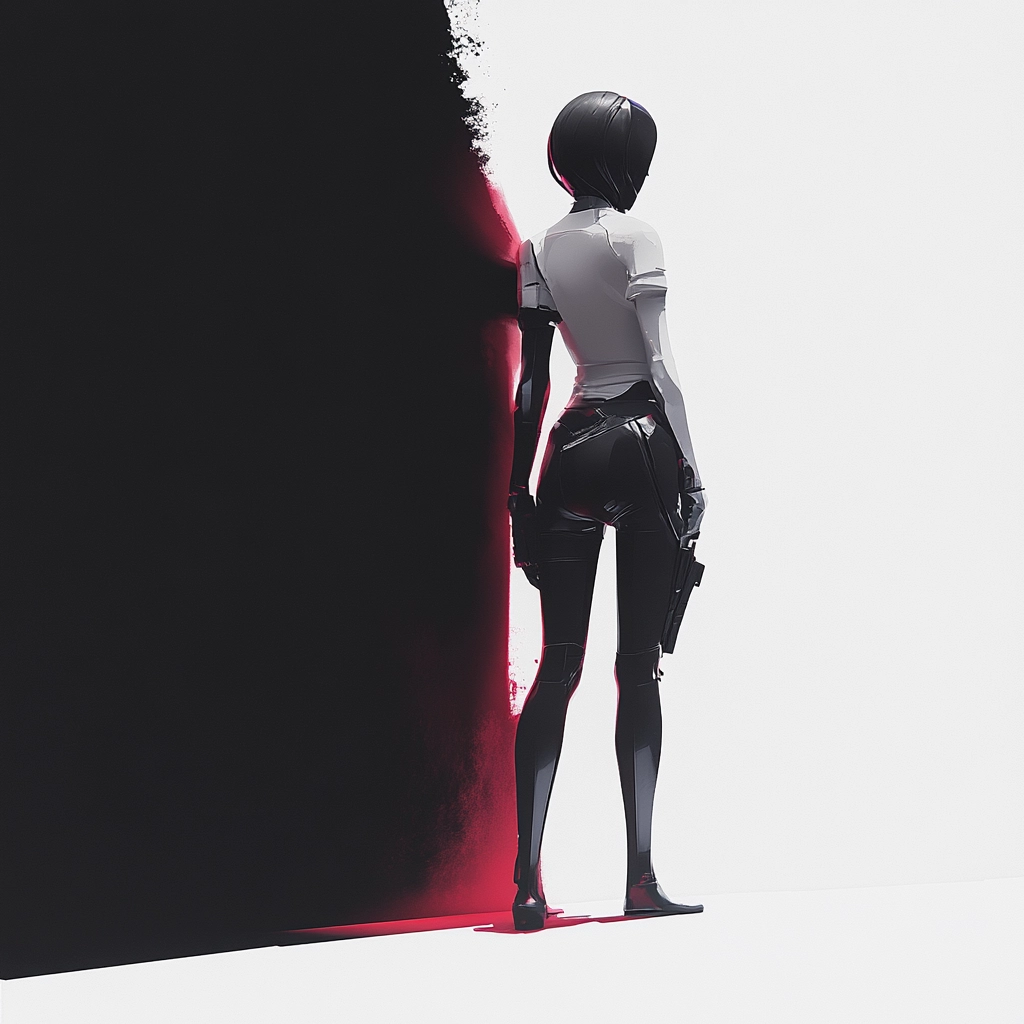The composition employs stark contrasts with bold reds against a monochromatic palette, focusing on sleek forms and futuristic contours.
