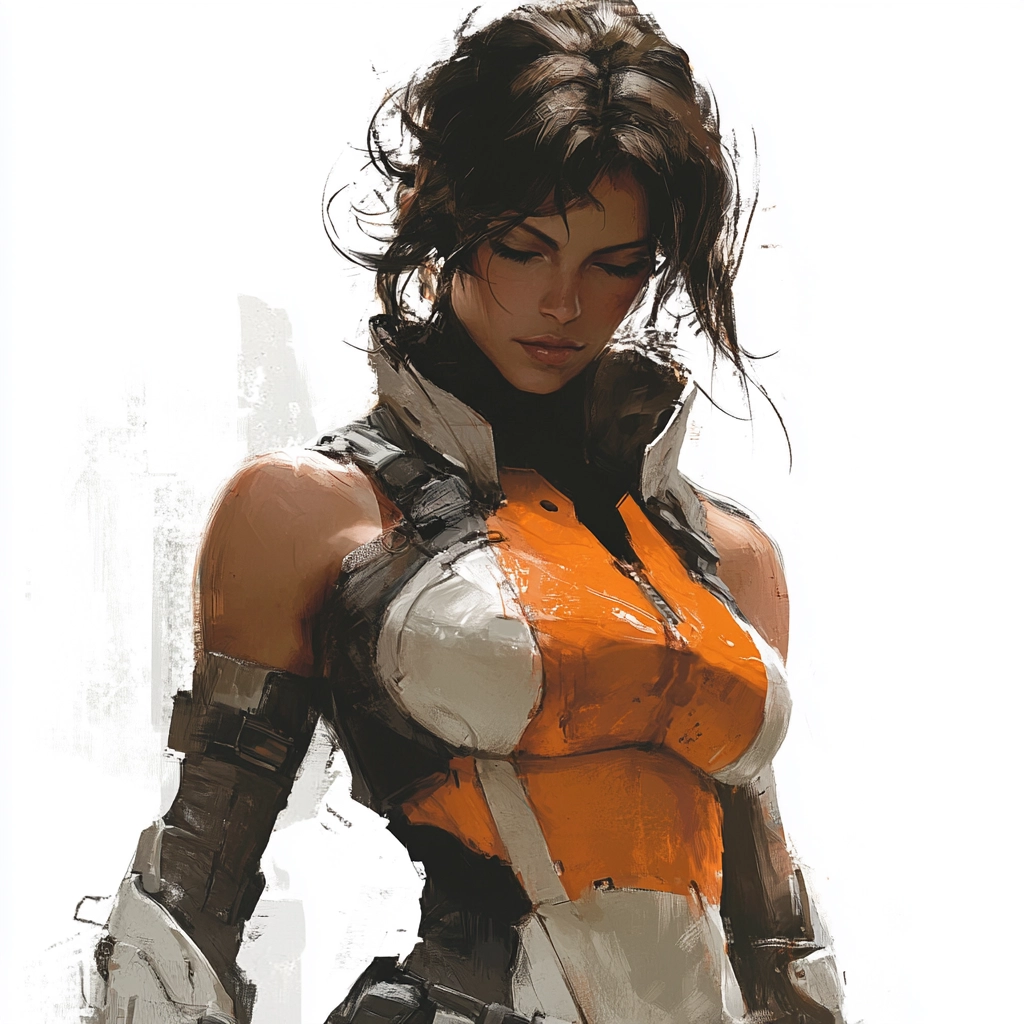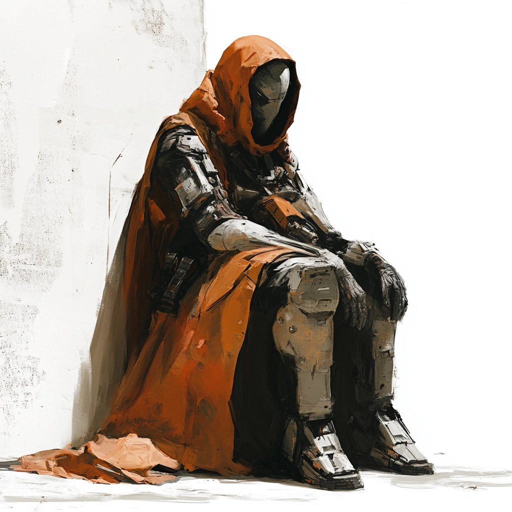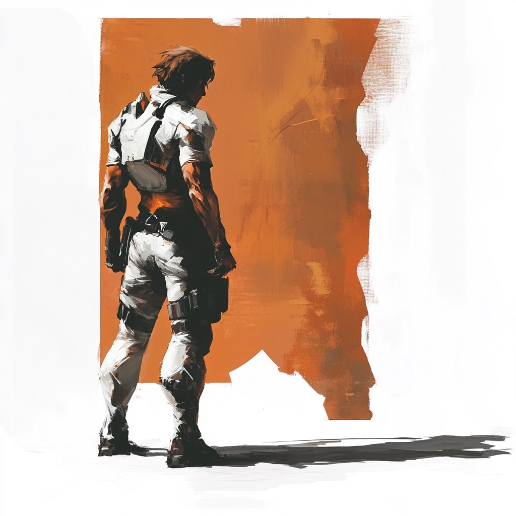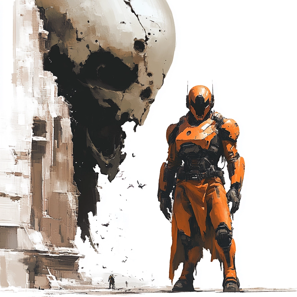 Vivid use of orange contrasts against blacks and whites, creating a bold sci-fi visual impact.