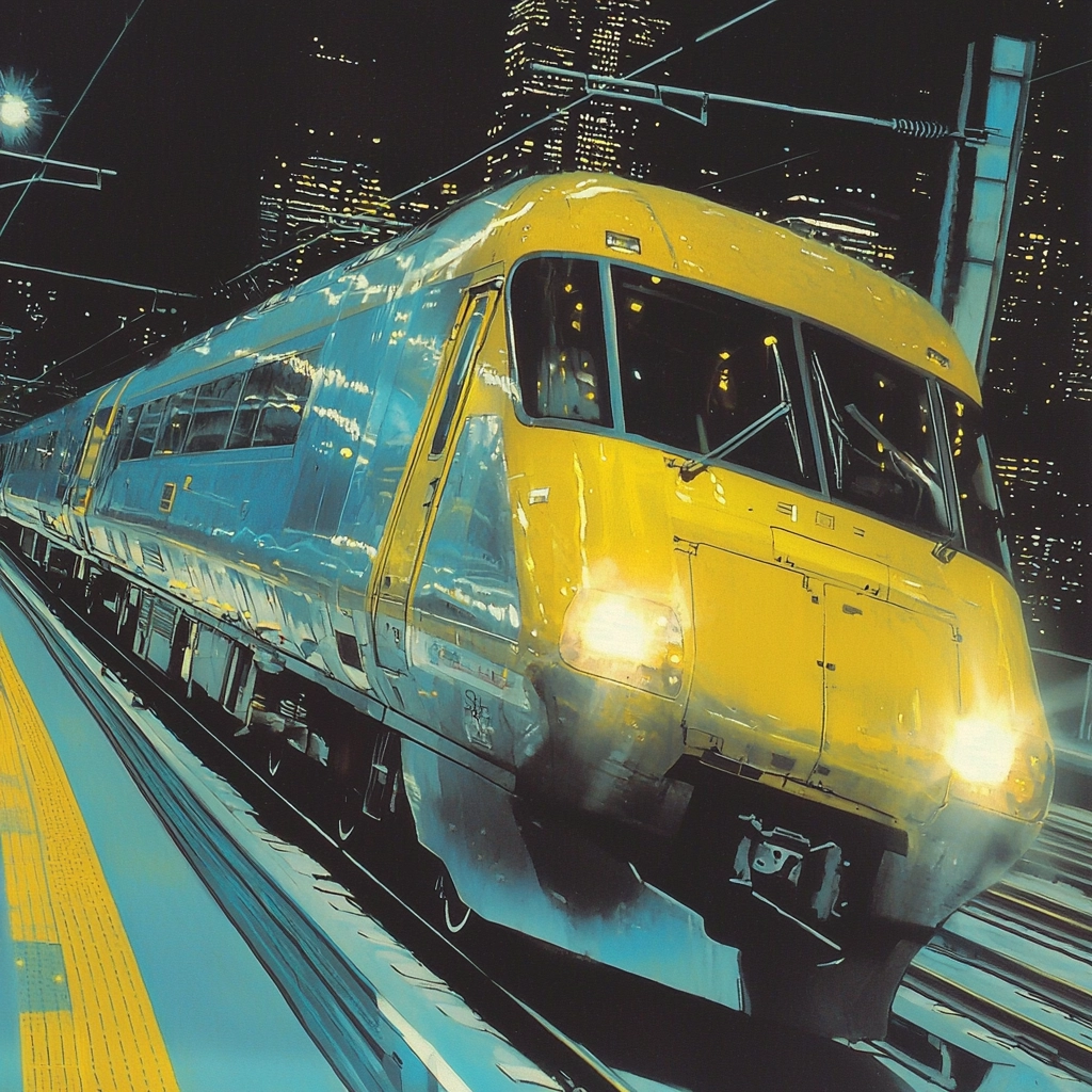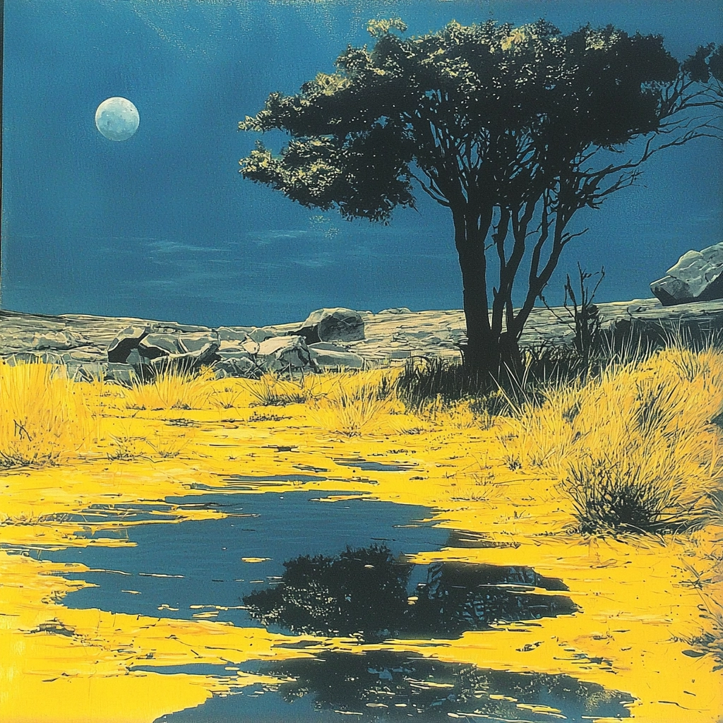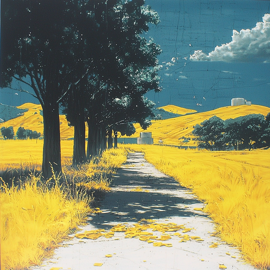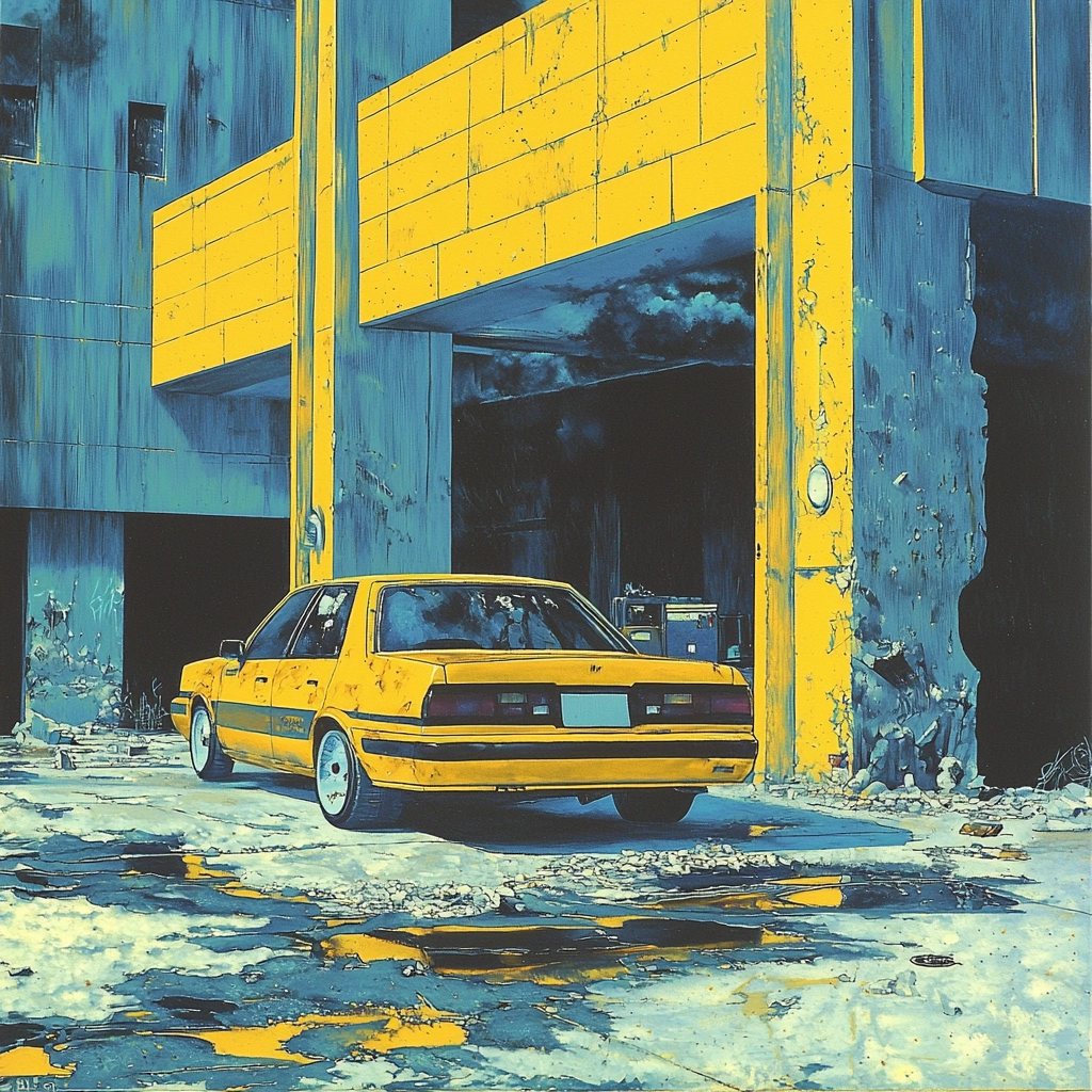The usage of lighting is impactful, emphasizing high contrast between light and shadow. Yellow is used boldly to punctuate the compositions, presenting dynamic spatial depth and an urban aesthetic; textures suggest industrial surfaces and natural growth.