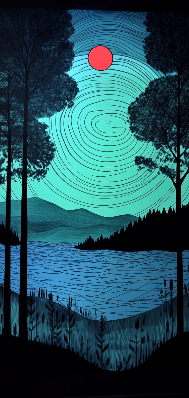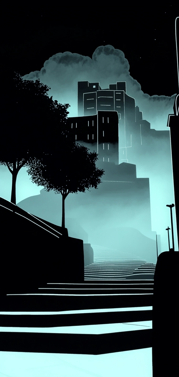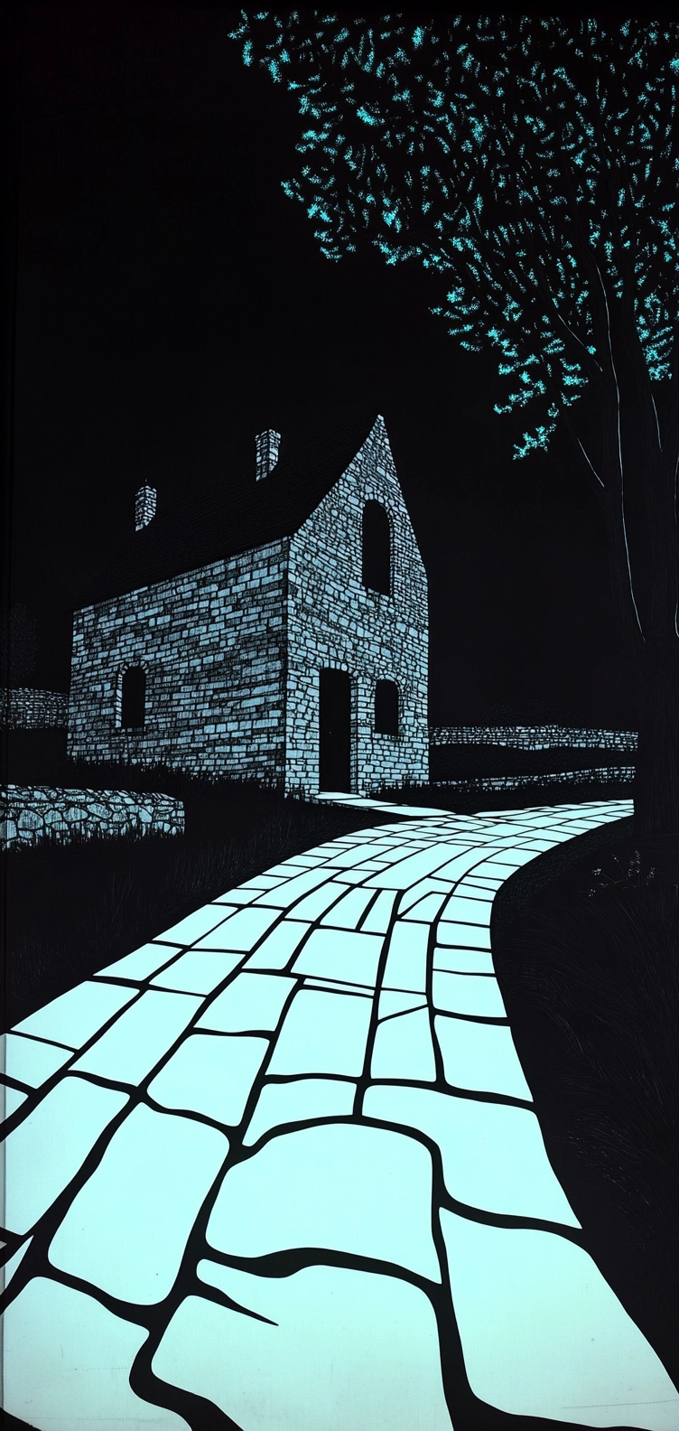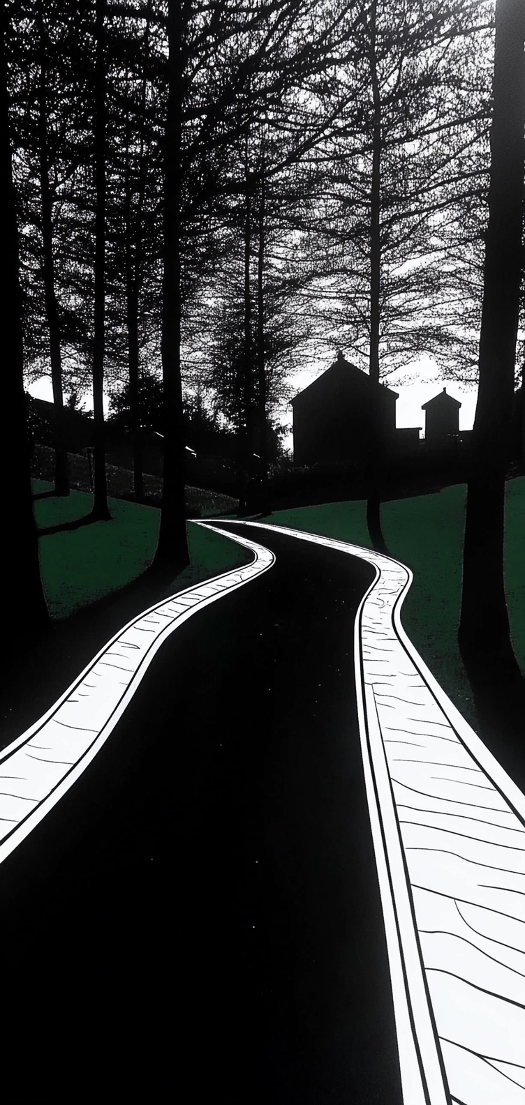 The use of lighting creates stark contrasts, with paths and structures highlighted against a predominantly dark background. Green and white are utilized to guide the viewer鈥檚 eyes through the composition, enhancing the sense of direction and space. Textures are sharply defined, contributing to a crisp visual experience.