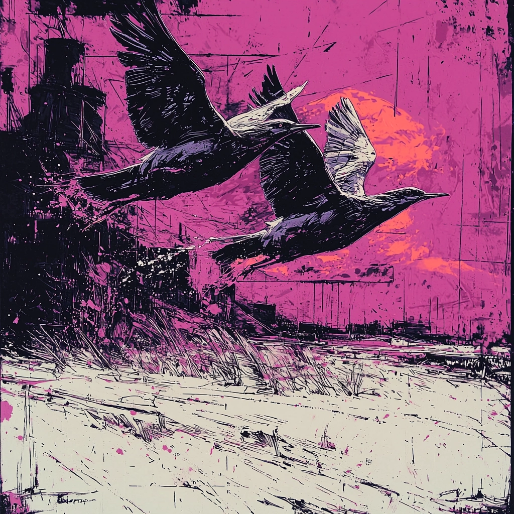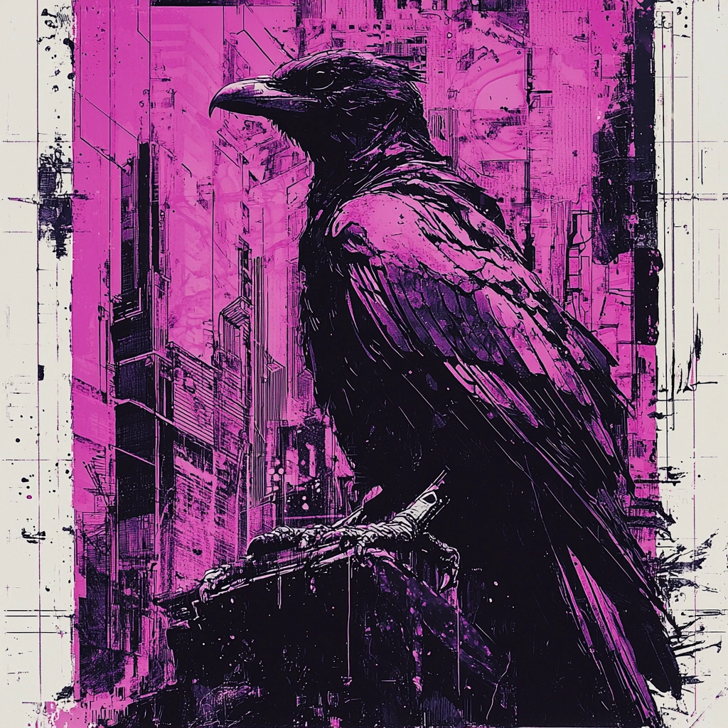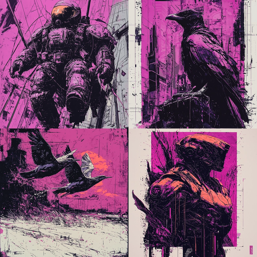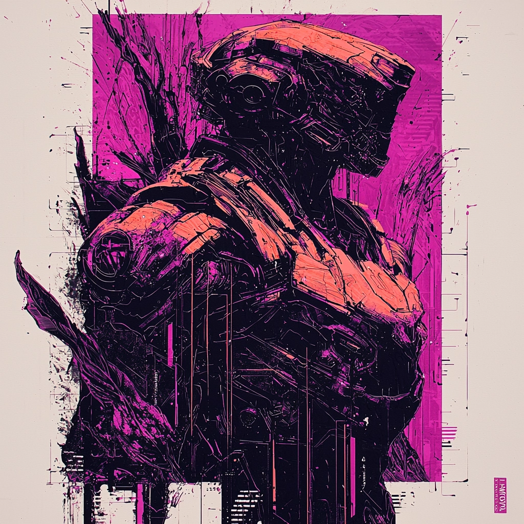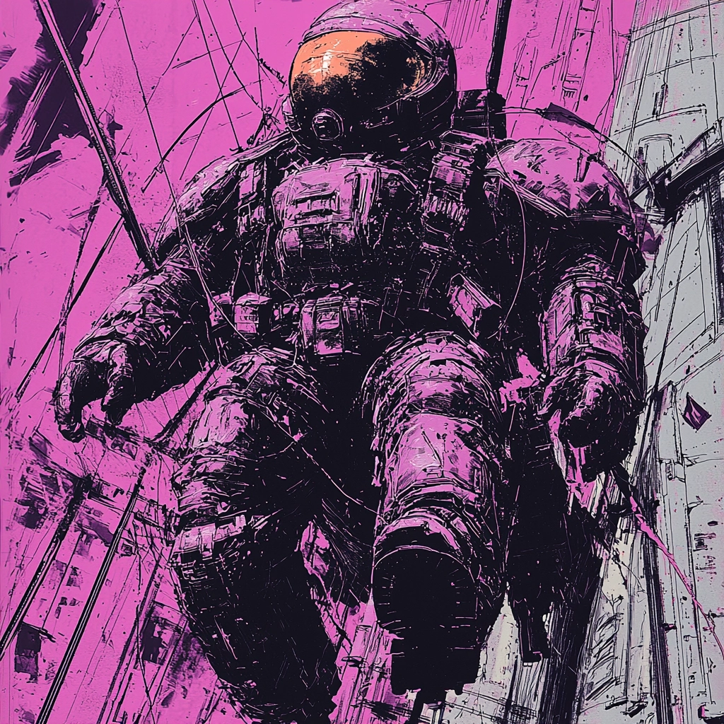 The use of lighting creates stark contrasts that highlight intricate details and depth. The color palette is vibrant, dominated by intense pinks and oranges. The texture is rich, with visible fine lines providing a sketch-like quality that enhances spatial awareness.