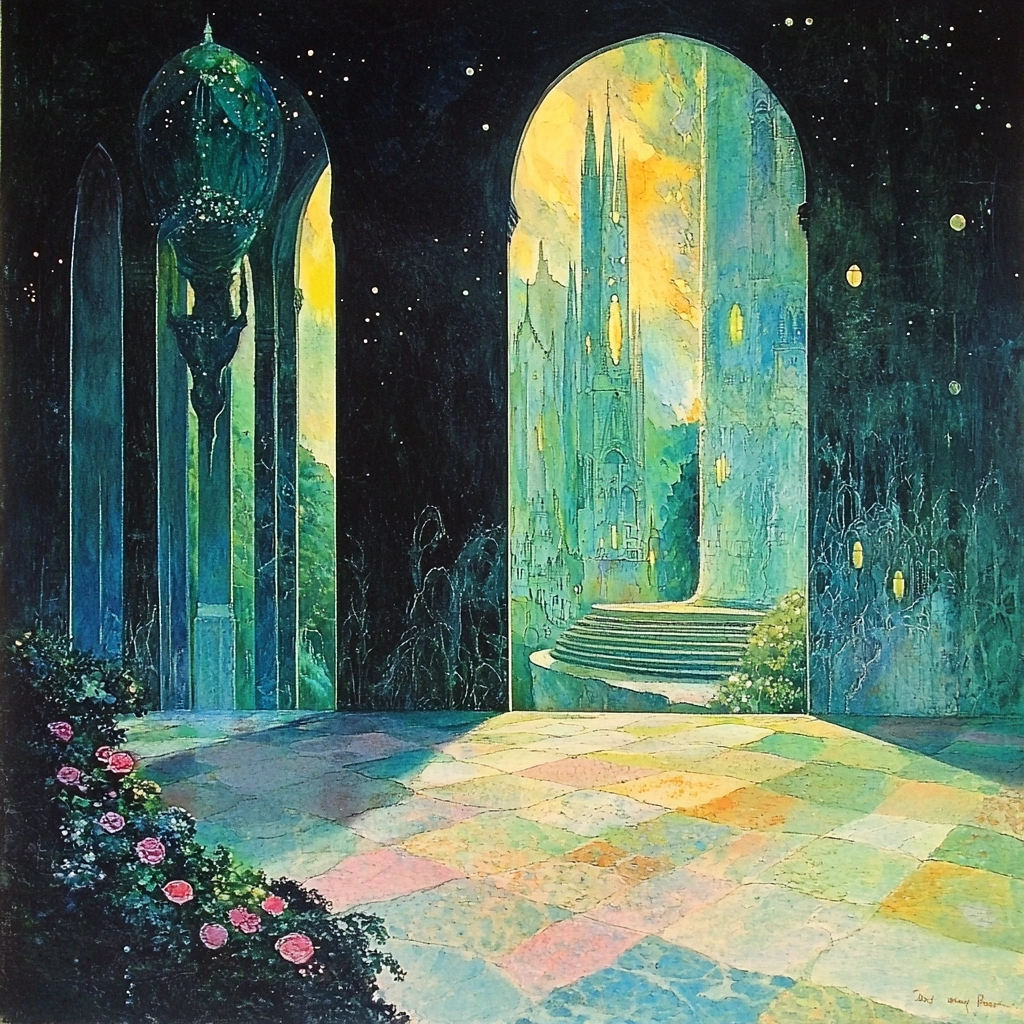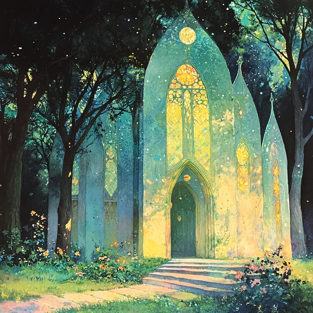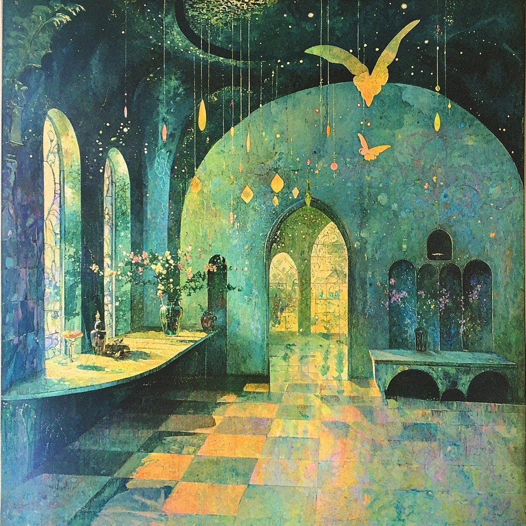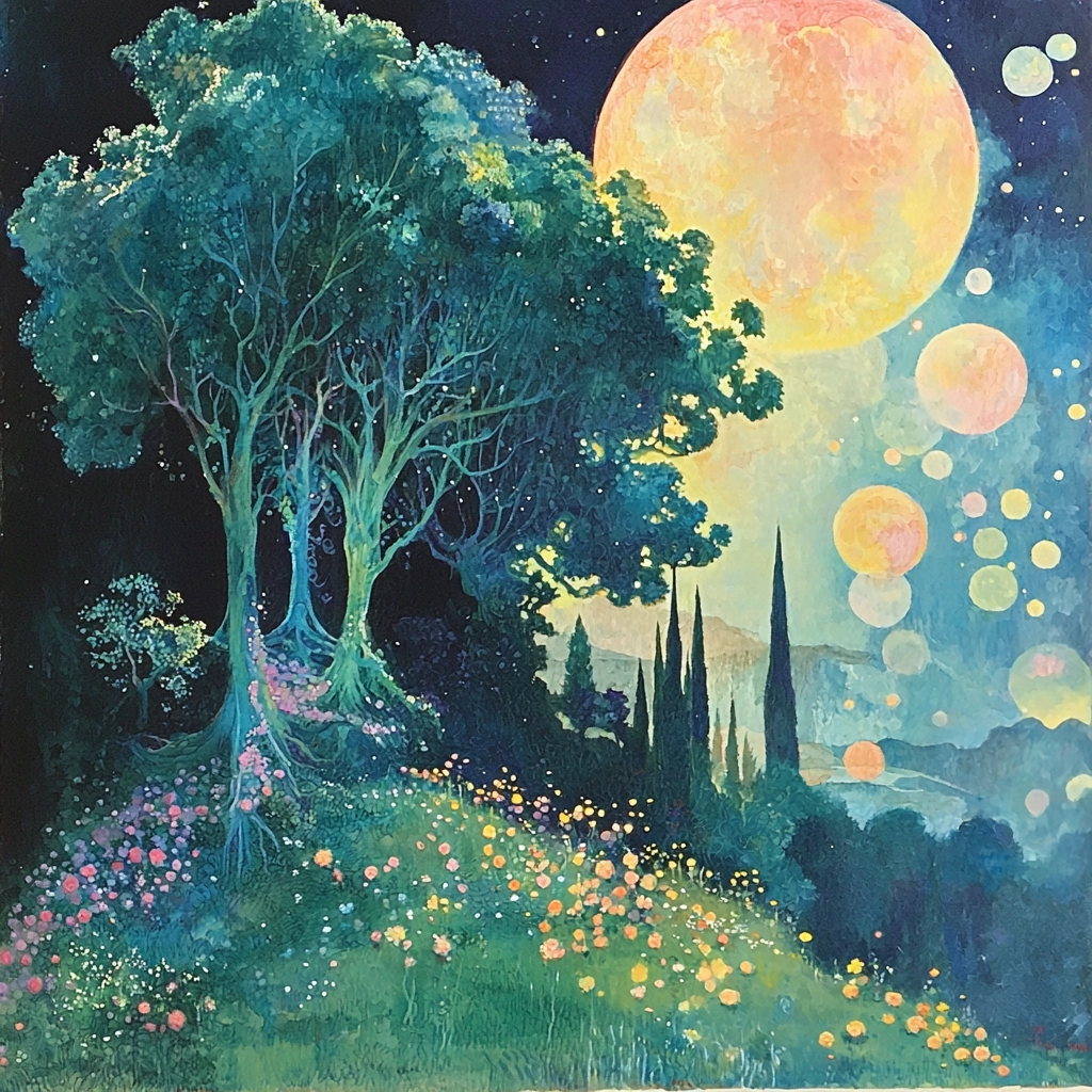 Dark blue and green contrast with luminous yellow creating a fantasy landscape.