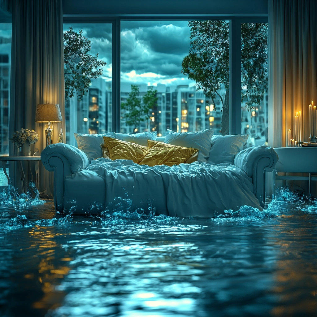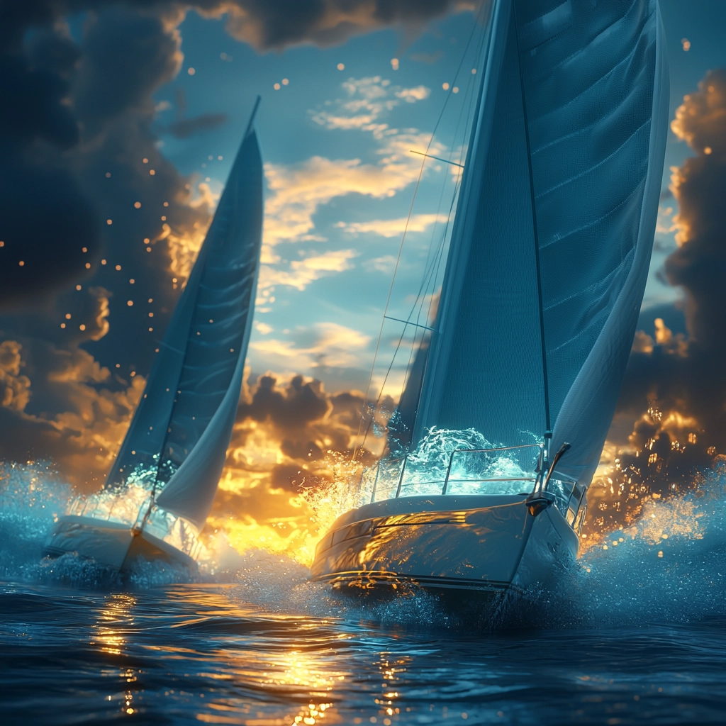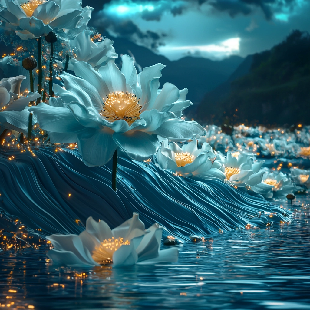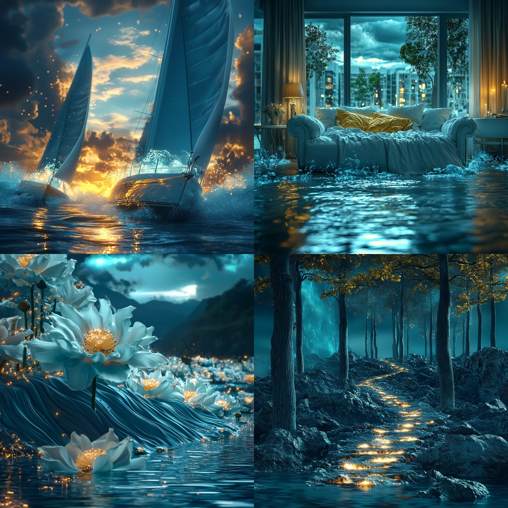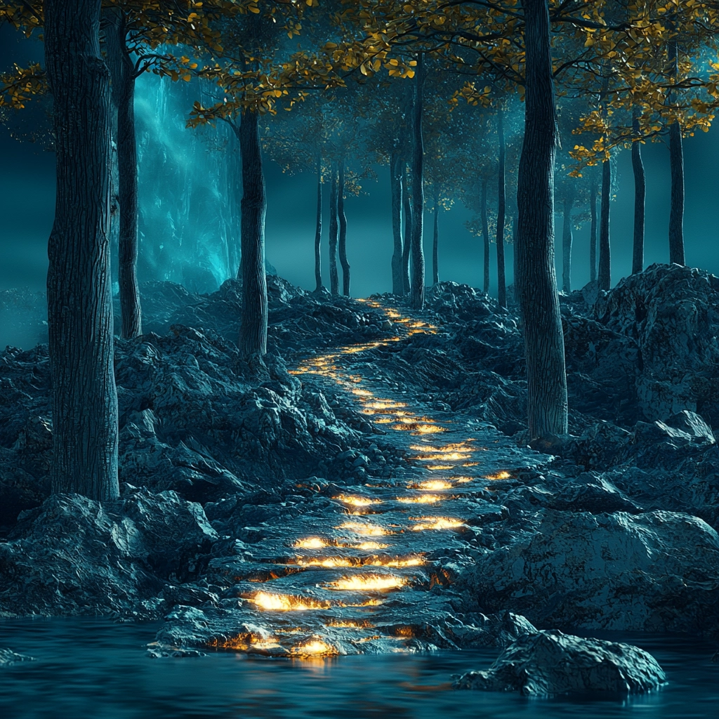 The lighting effects dramatically emphasize the contrast between the deep blue hues and the glowing golden highlights. The spatial sense is expanded carefully through balance, making the textures appear rich and detailed, evoking intensity and depth.