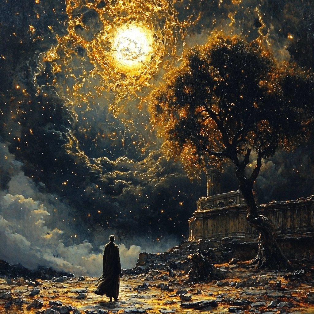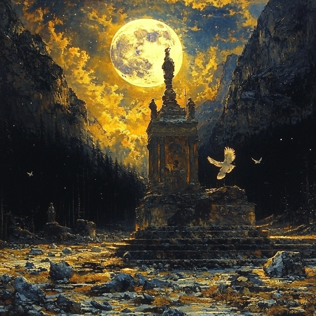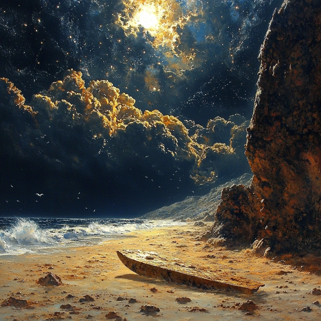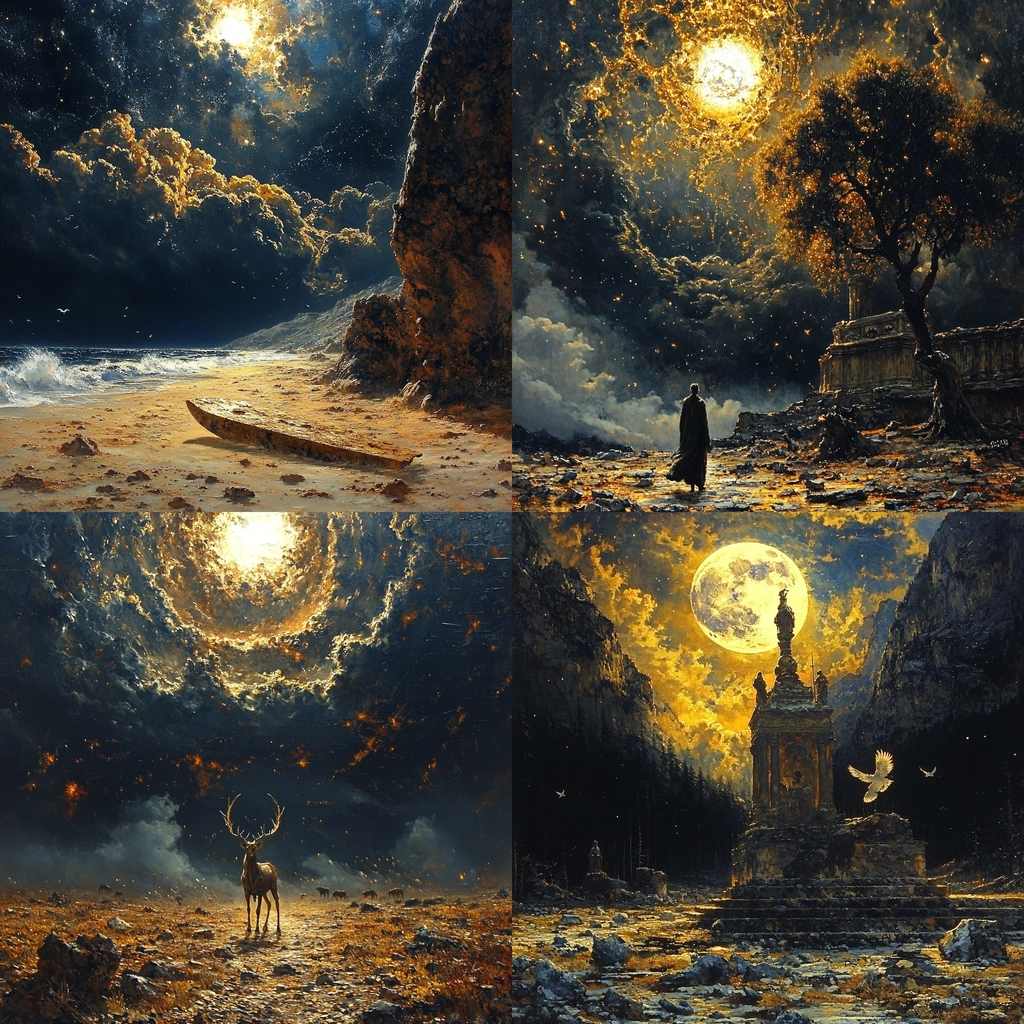 Lighting plays a crucial role, with radiant gold elements set against a deep dark blue background, emphasizing spatial depth. The texture is highly detailed, bringing out the roughness of the surfaces and adding to the visual complexity of the scenes.