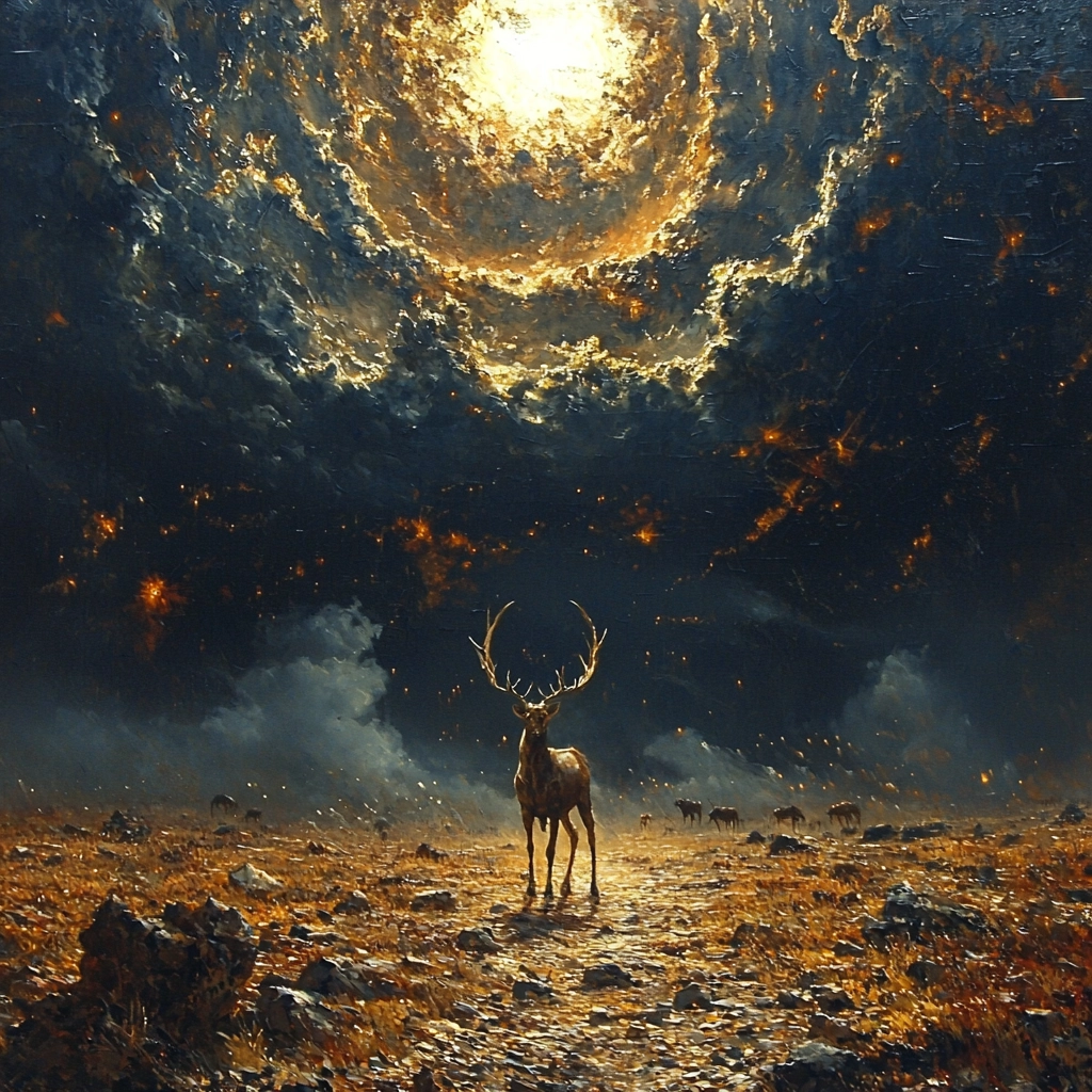 The use of dark colors contrasted with luminous gold highlights creates a dynamic composition with a rich texture.