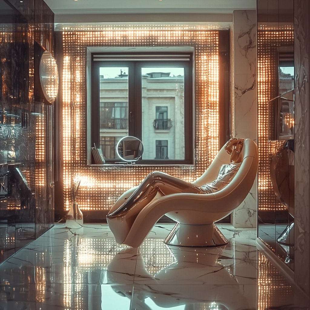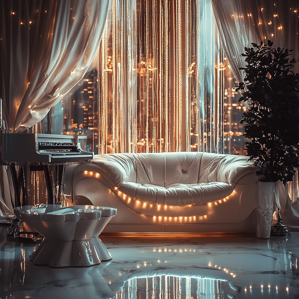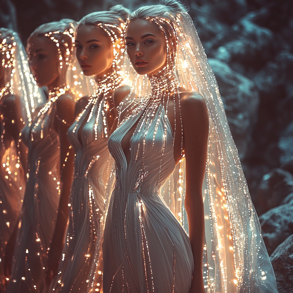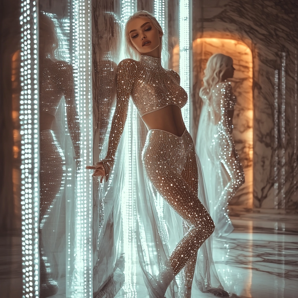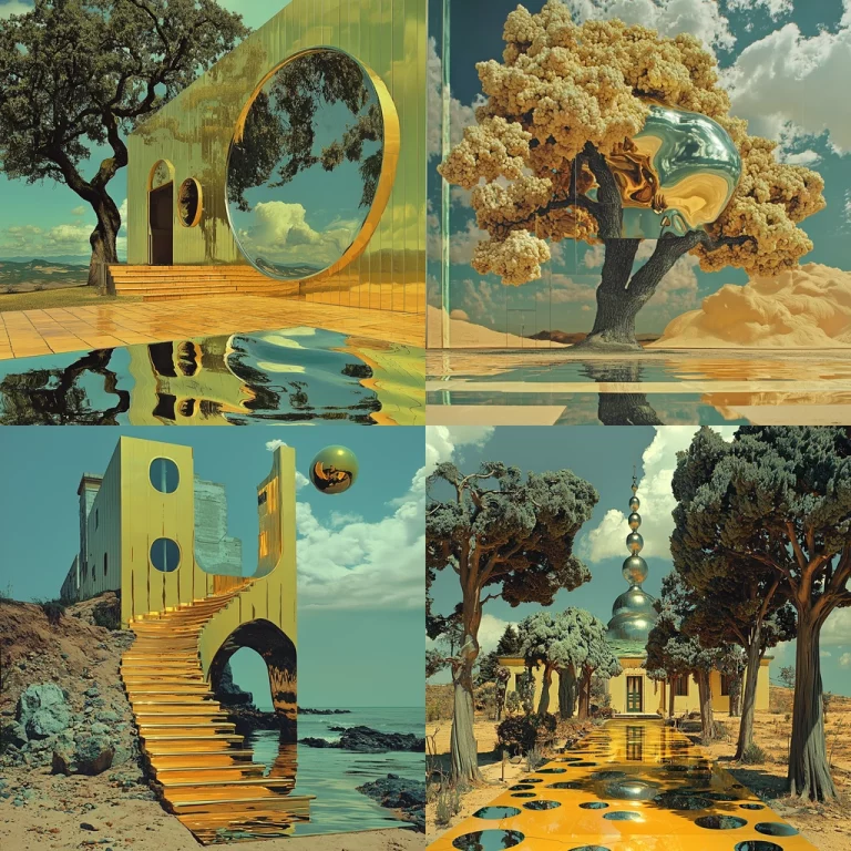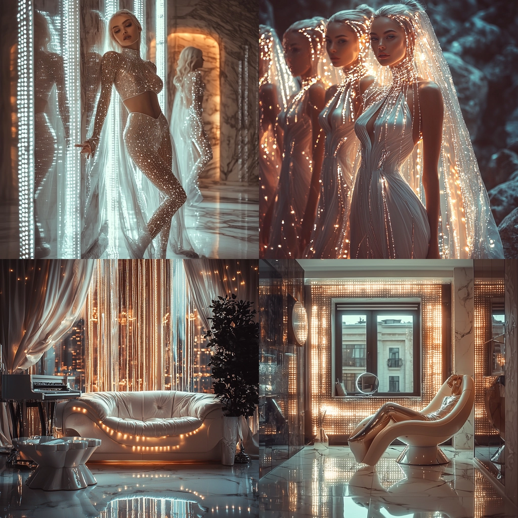 Lighting effects create a rich glow that highlights curves and contours, while reflective surfaces amplify luminosity. The use of gold gives an opulent feel, contrasted with deep blues that add depth. Textures range from smooth to shimmery, enhancing visual interest.