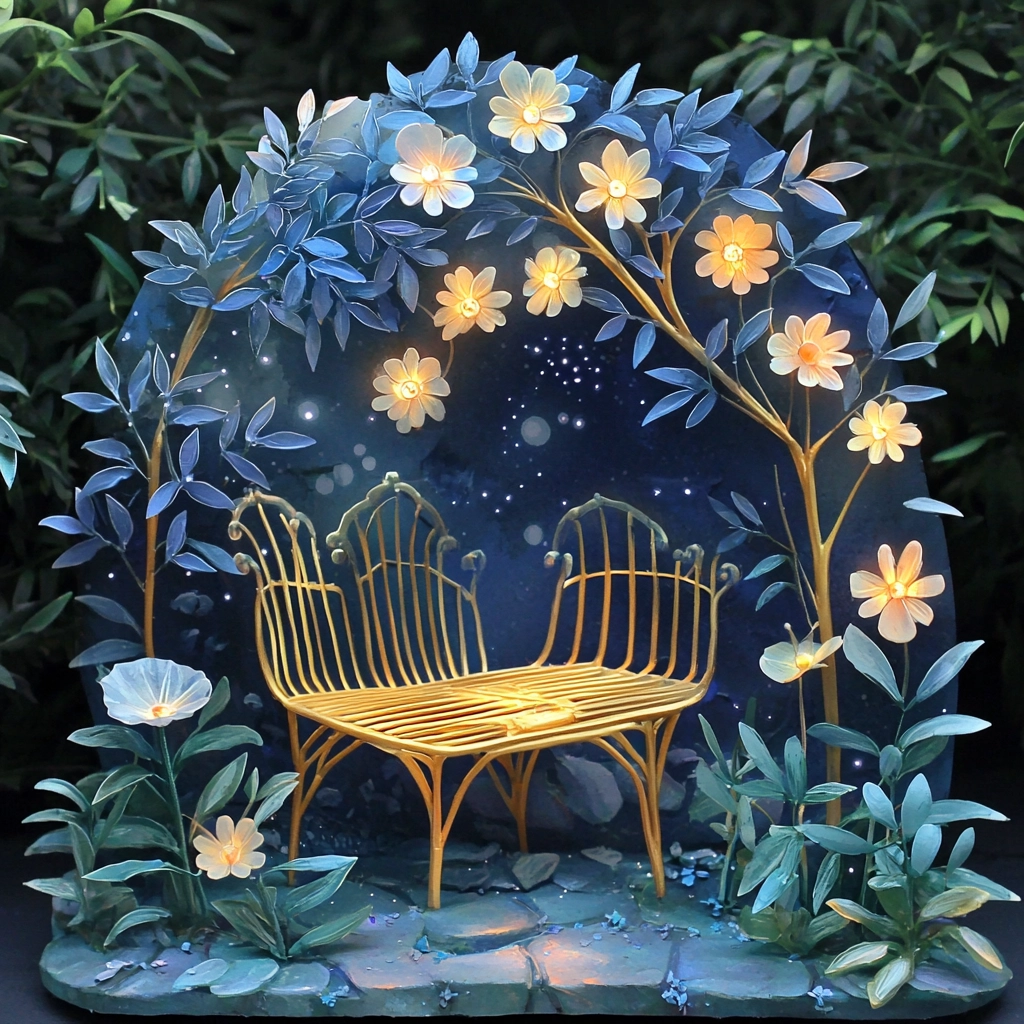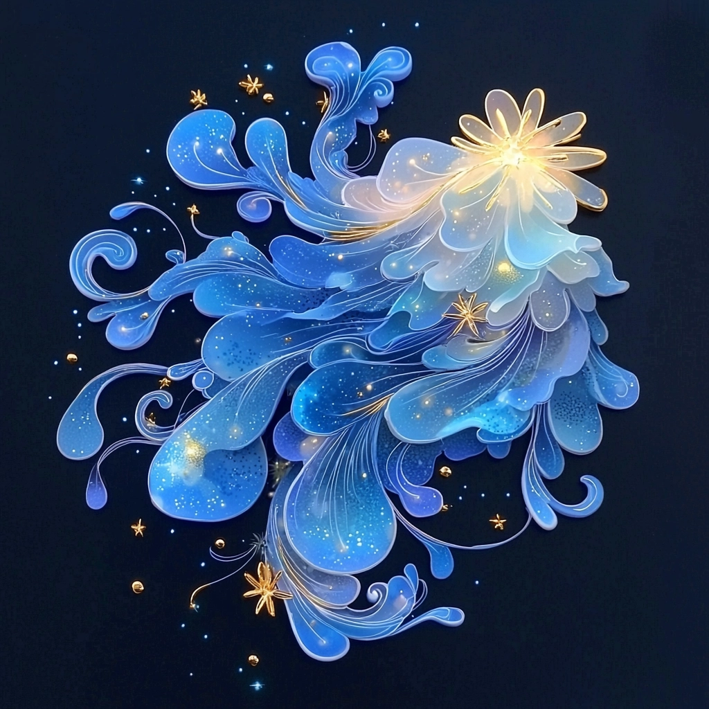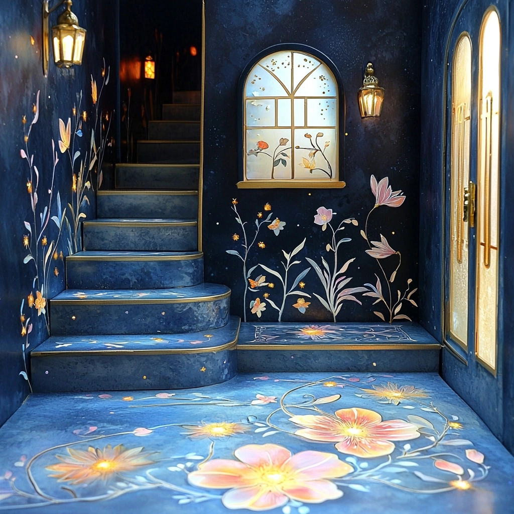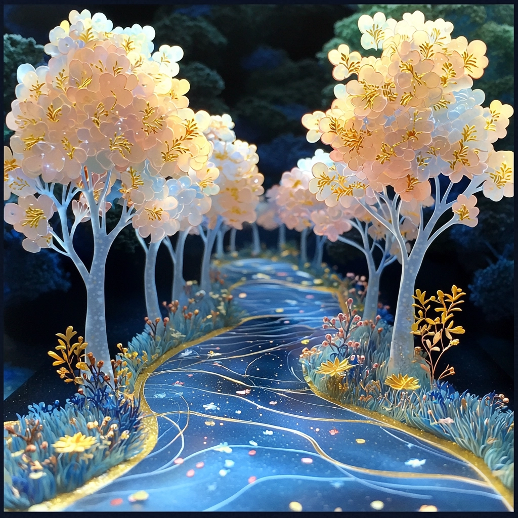 The interplay of lighting creates a soft glow that accentuates the detailed floral textures against a deep dark blue backdrop. Gold highlights enhance the spatial depth, giving a layered feel, while delicate brushwork provides an ethereal touch.