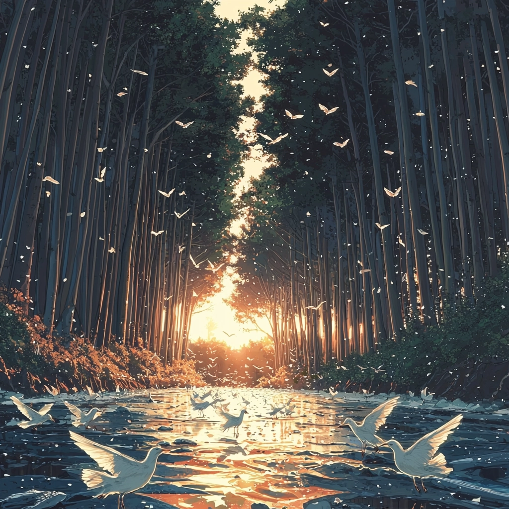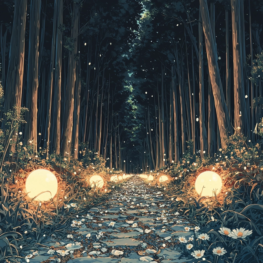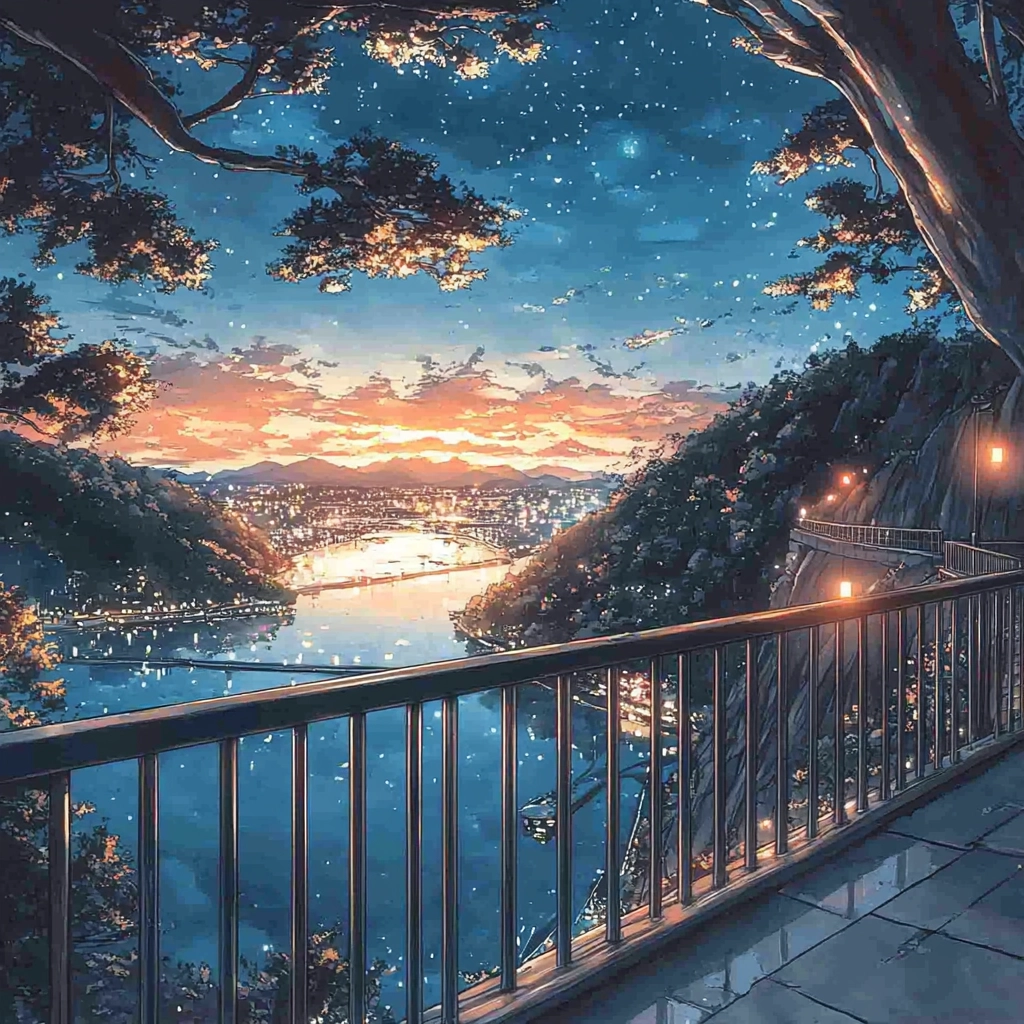 The use of golden lighting creates a warm glow, contrasted with cooler dark blue tones. The soft texture contributes to a sense of depth, with layered details giving a realistic and immersive spatial impression.