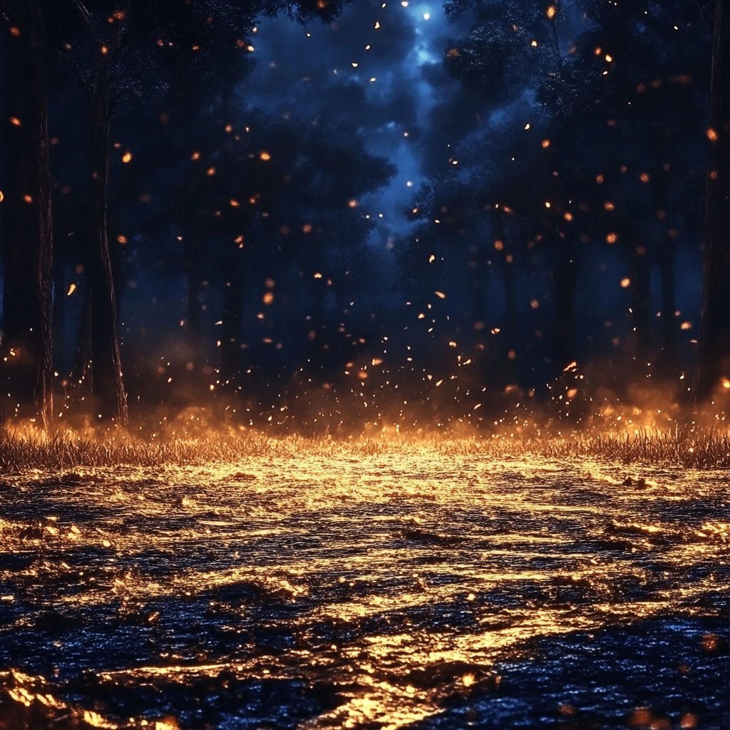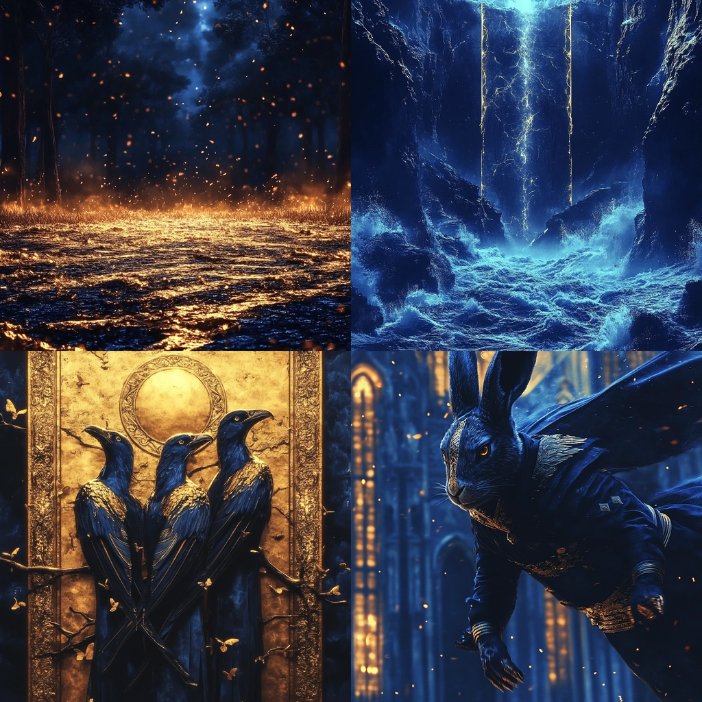 Dynamic lighting effects contrast warm gold with deep, cool blues, accentuating spatial depth and sharp textural precision. The interplay of reflective surfaces and intricate textures enhances the compositional clarity and dimensionality of the scenes.