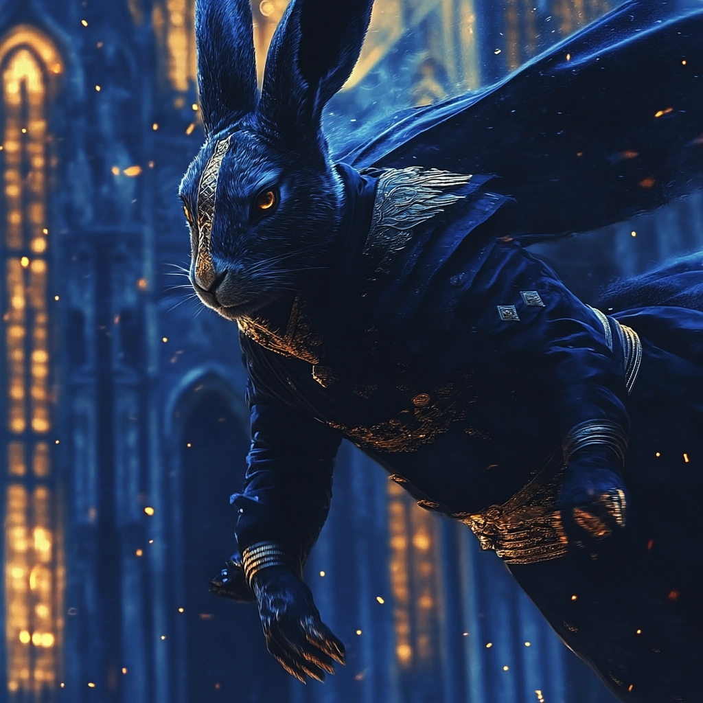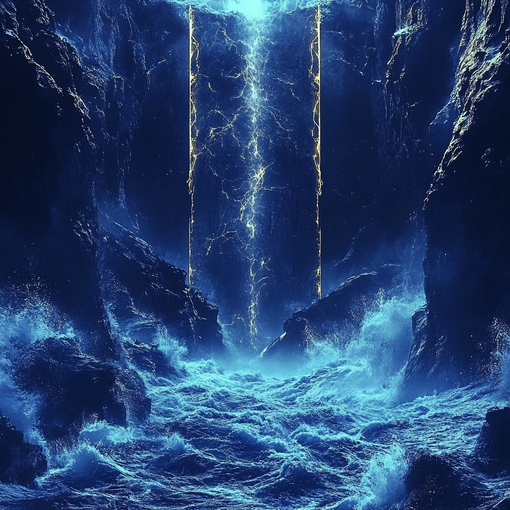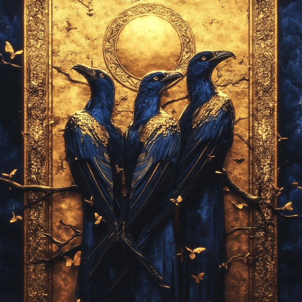 Rich contrasts between luminous gold and radiant dark blue create a stark, dramatic composition emphasizing intricate detail.