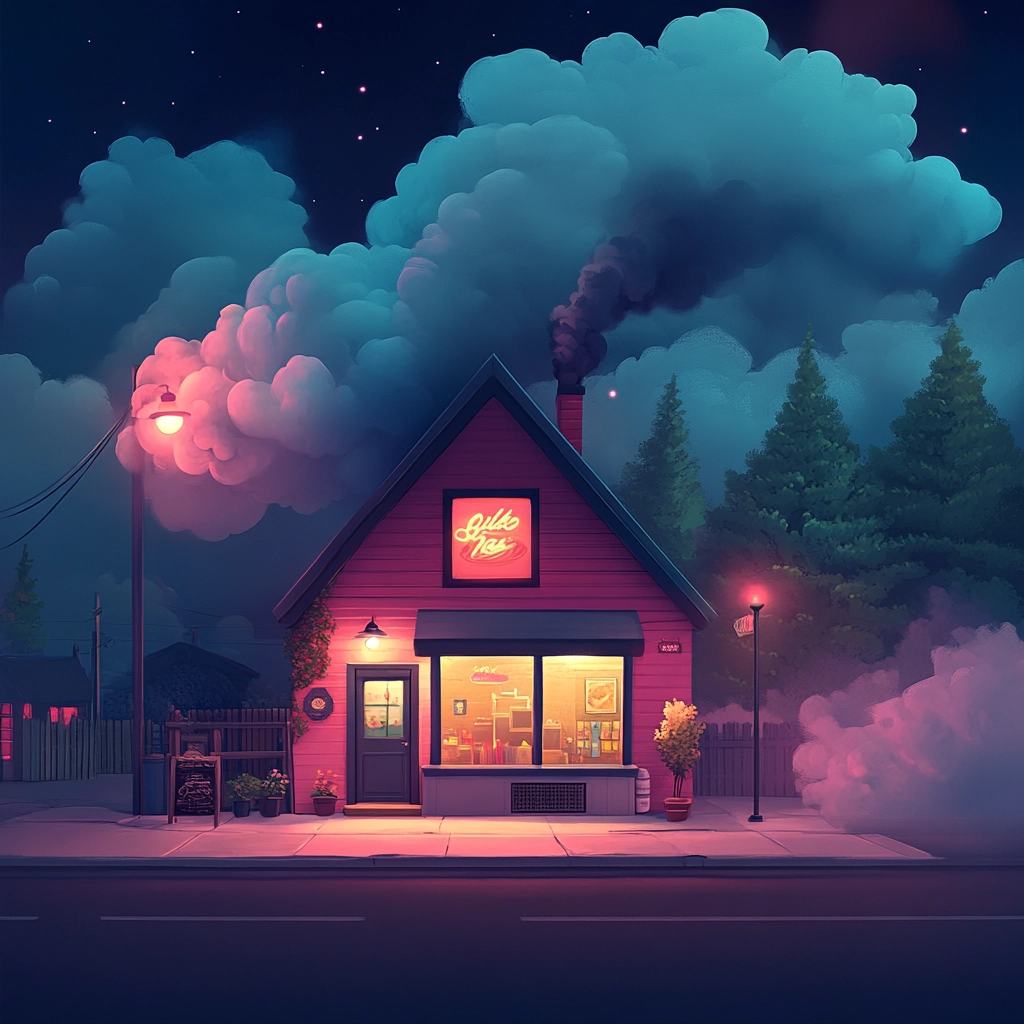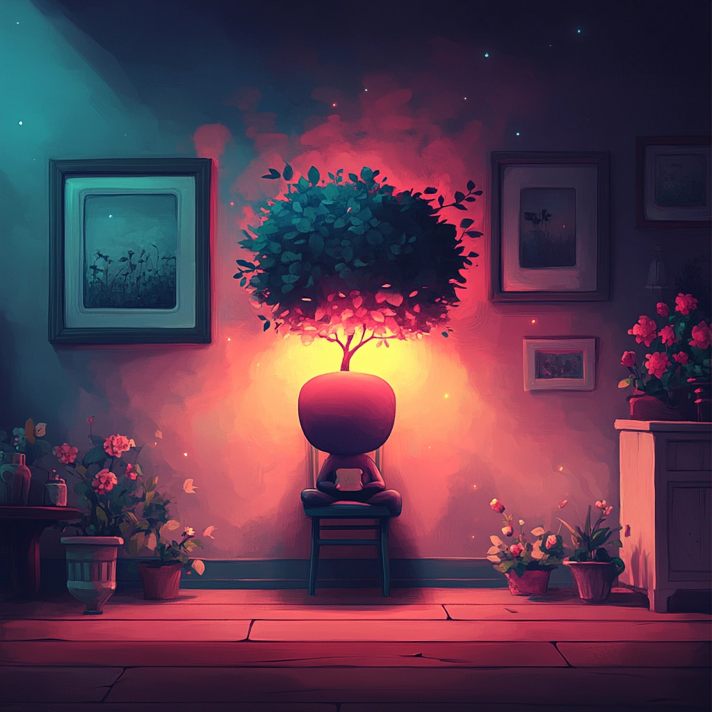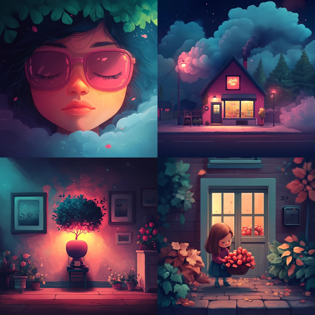 The artwork is defined by a striking use of atmospheric lighting, with deep blues contrasting against warm reds and greens. Textures are soft yet detailed, crafting a palpable depth that draws attention to each area. The spatial arrangement enhances the rich interplay of colors, enhancing the immersive quality of the scenes.