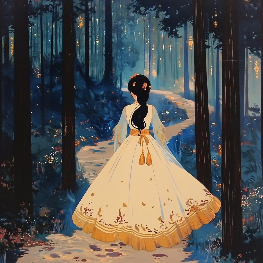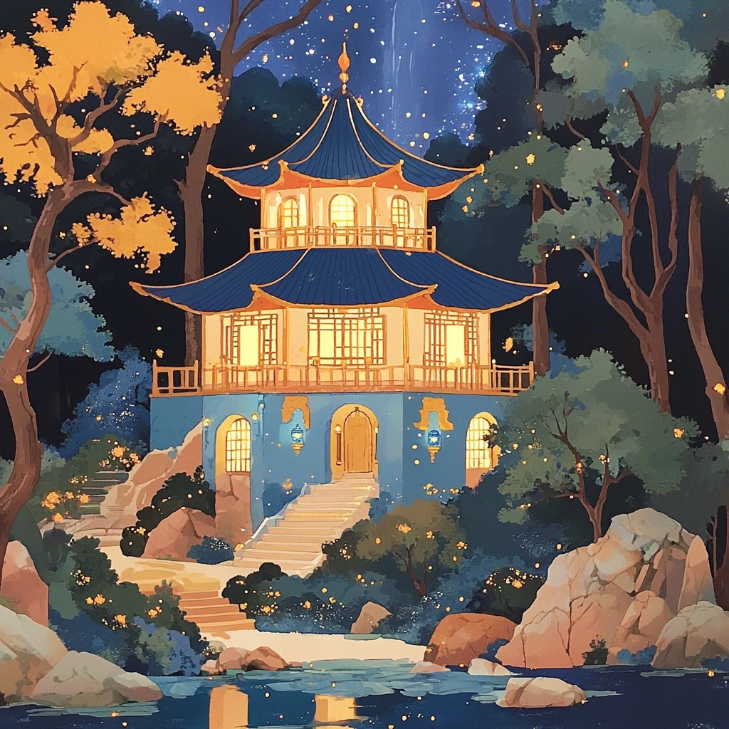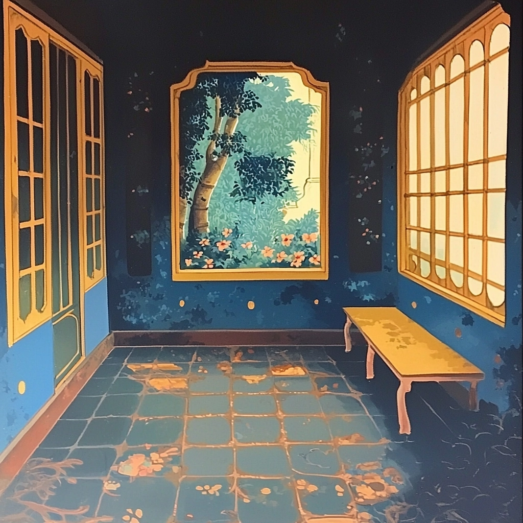 Lighting effects create a glimmering, illuminated ambiance highlighting the intricate textures and details. The use of dark blue and yellow contrasts add depth, while the spatial arrangement guides the viewer through the scenes seamlessly. The textures are delicate yet detailed, creating a harmonious dynamic throughout.