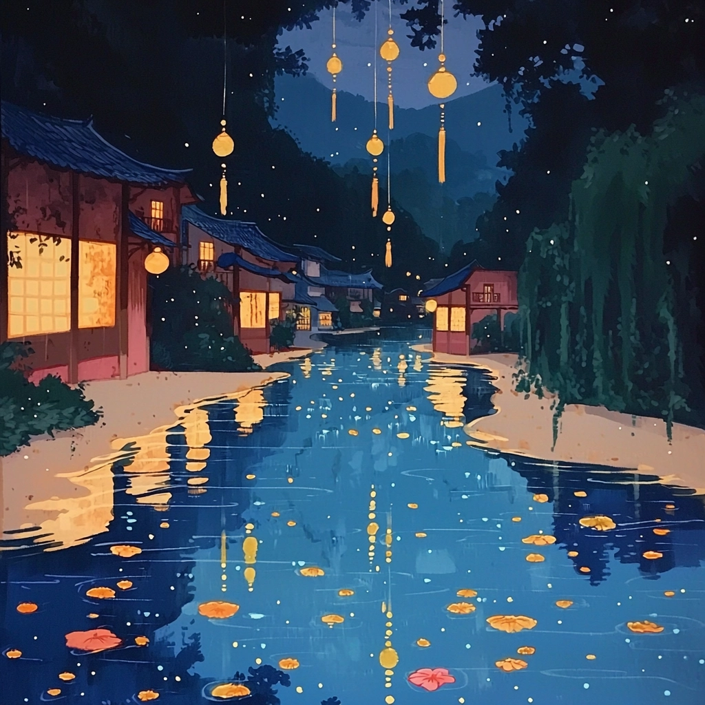 Dark blues and yellows dominate the night-time scenes with flowing compositions and intricate detailing.