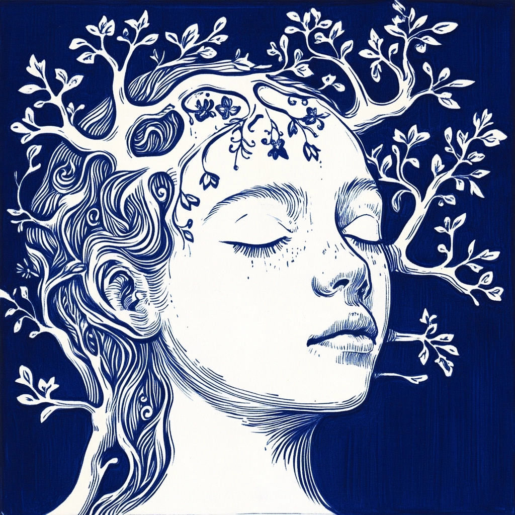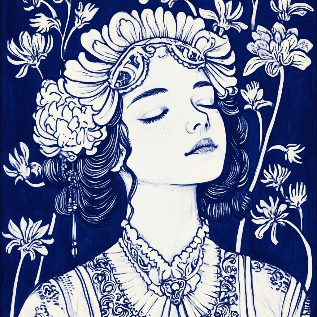The prominent use of indigo offers a striking contrast against the white background, enhancing the detail within the linework. The textures achieve a smooth finish, heightened by precise, clean lines that evoke a sense of depth.