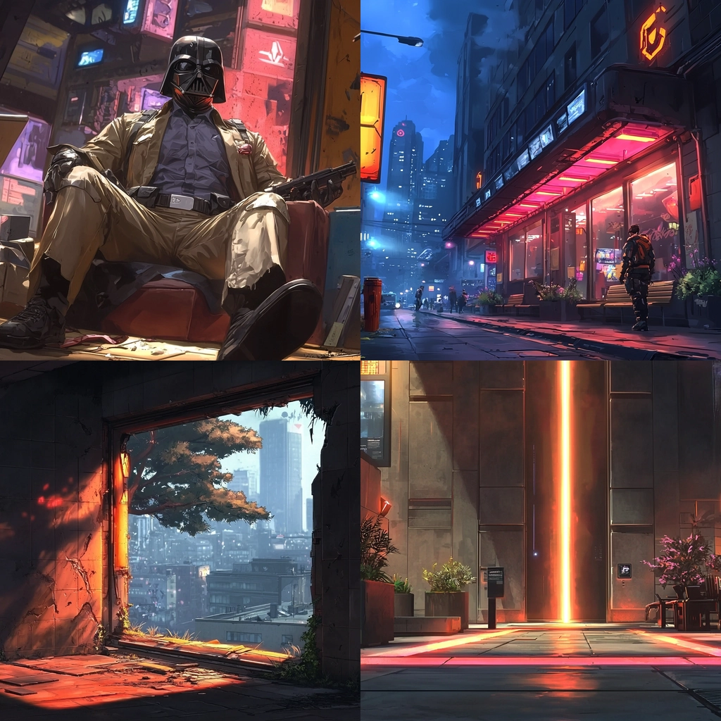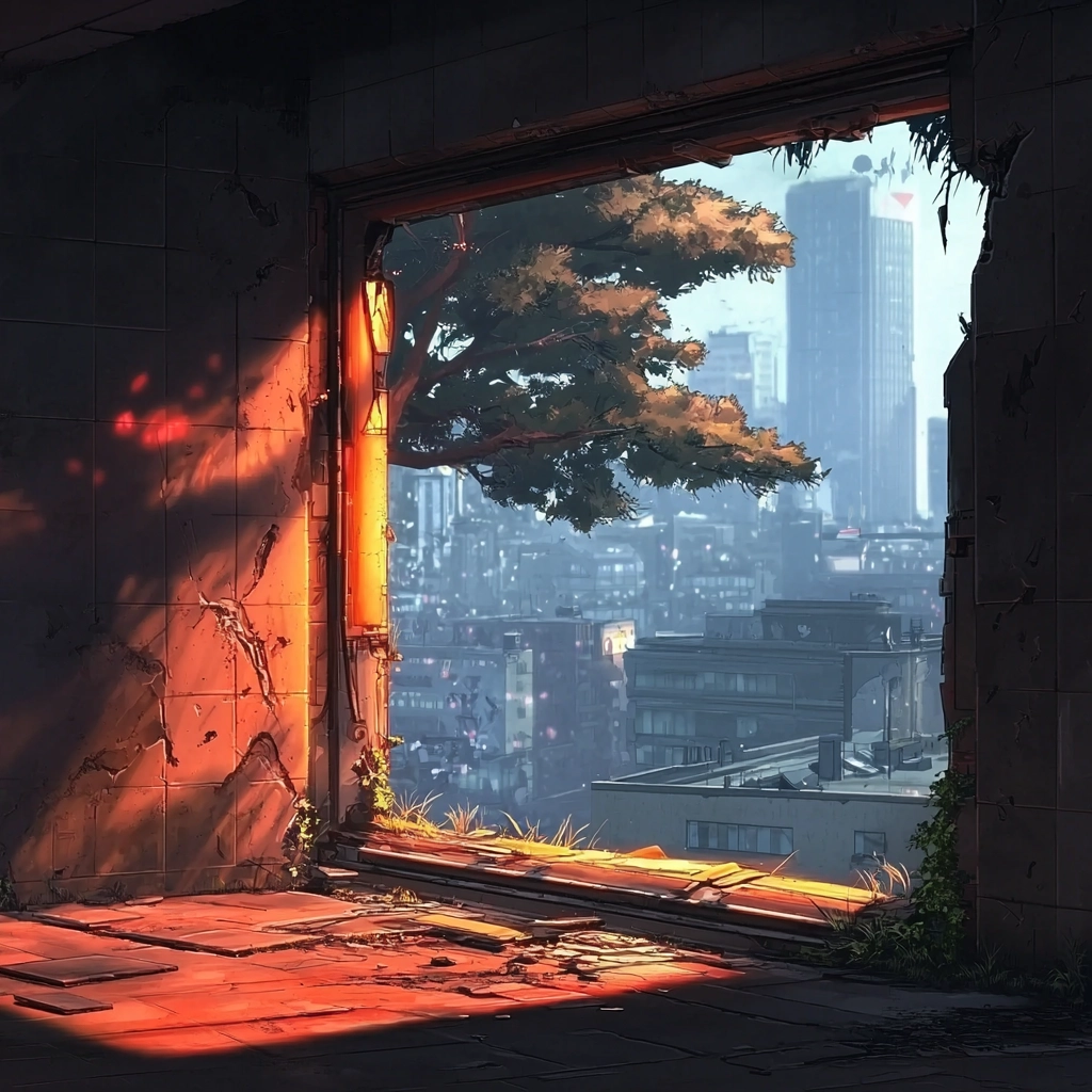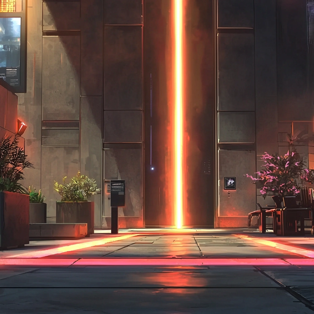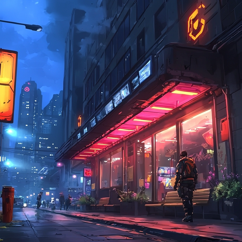 The artwork employs indigo and red tones to emphasize the depth of urban landscapes, with expert use of lighting creating stark contrasts that highlight architectural features against the evening sky. The textures reflect real-world materials enhanced by modern digital art techniques.