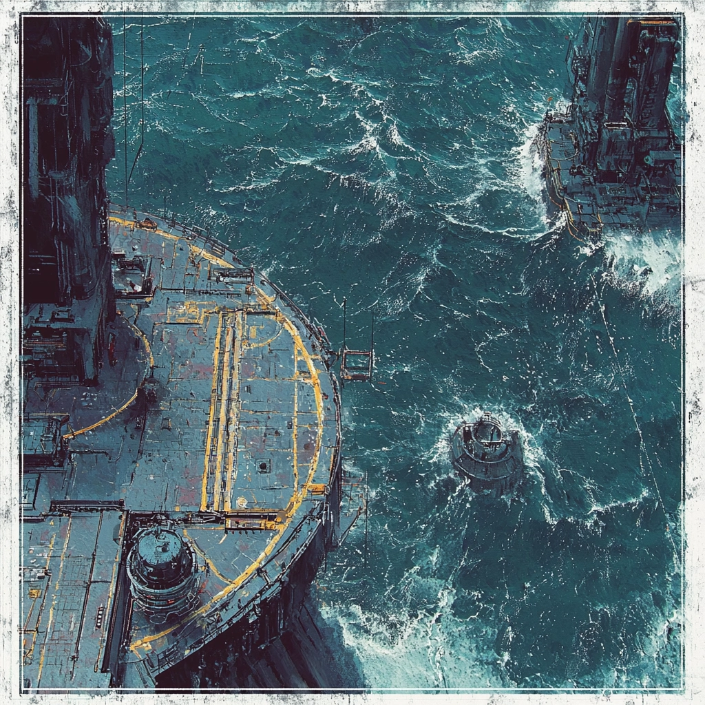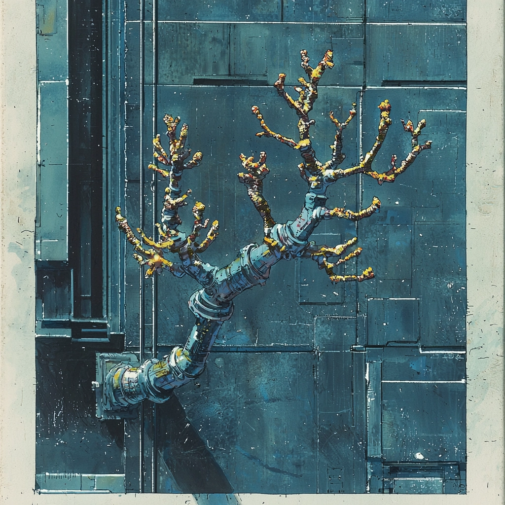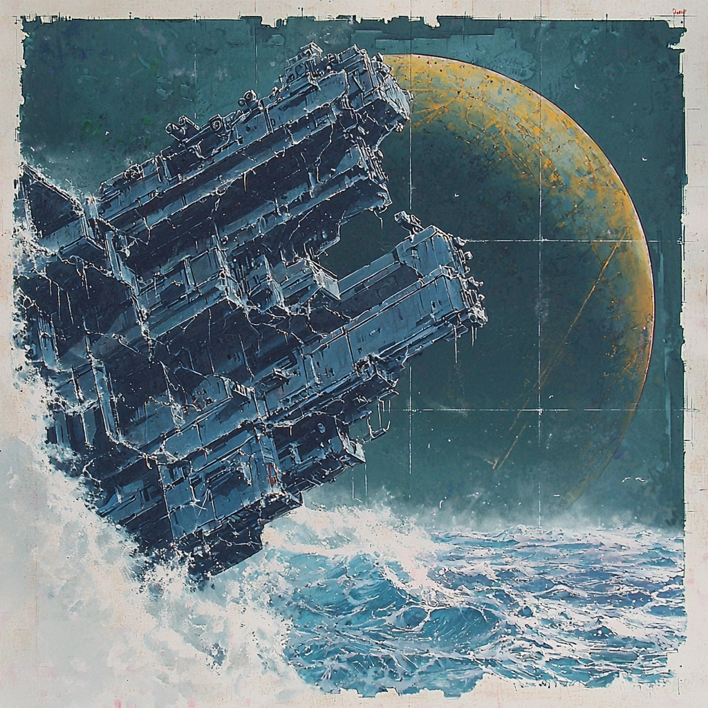 Natural and artificial lighting interplay creates dynamic contrasts, enhancing the metallic surfaces with cool blues and warm golden accents. The structural elements provide a sense of depth and solidity, while textures mimic metal and water, conveying a tactile yet industrial feel.