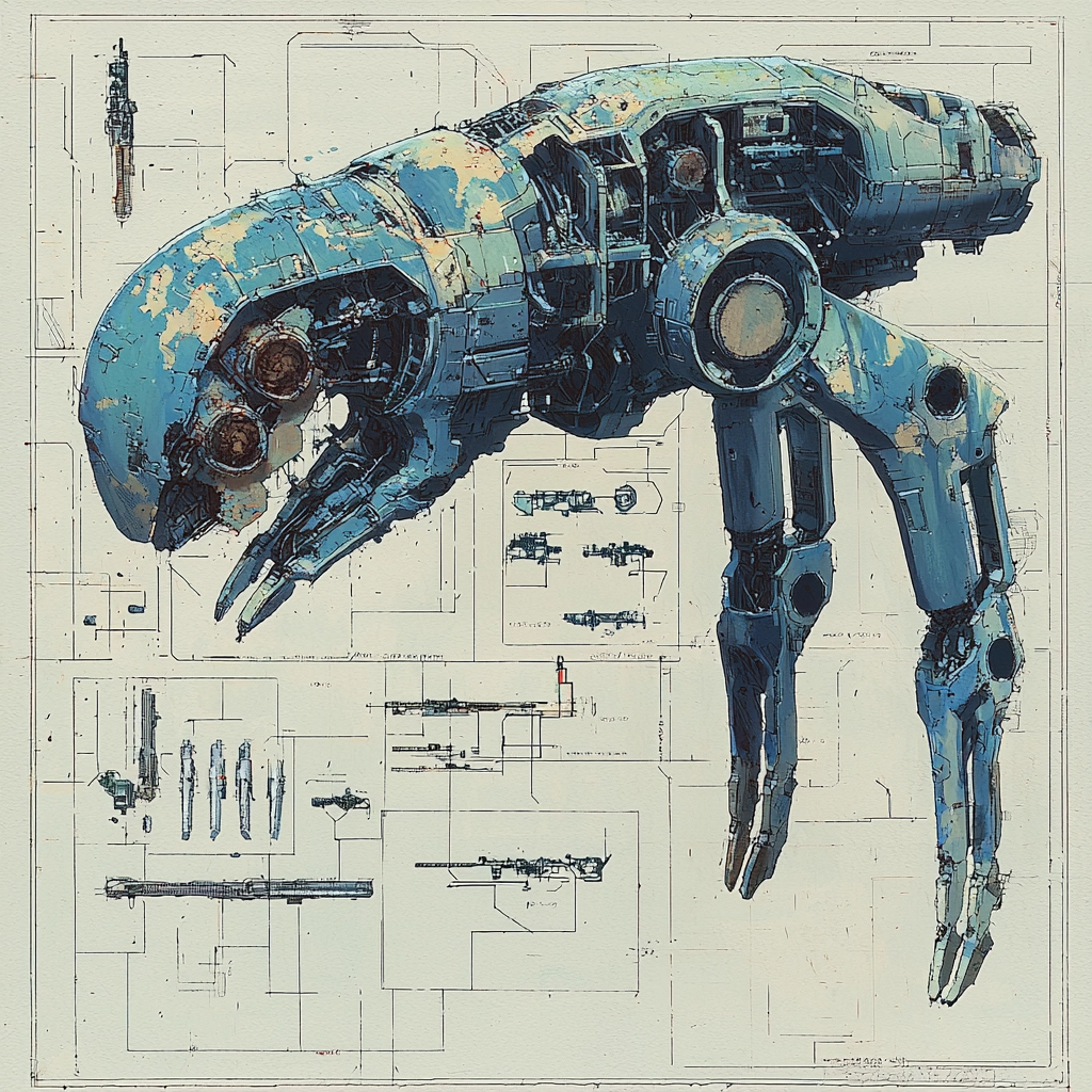 A complex composition highlighting metallic hues and structural forms within a futuristic setting.