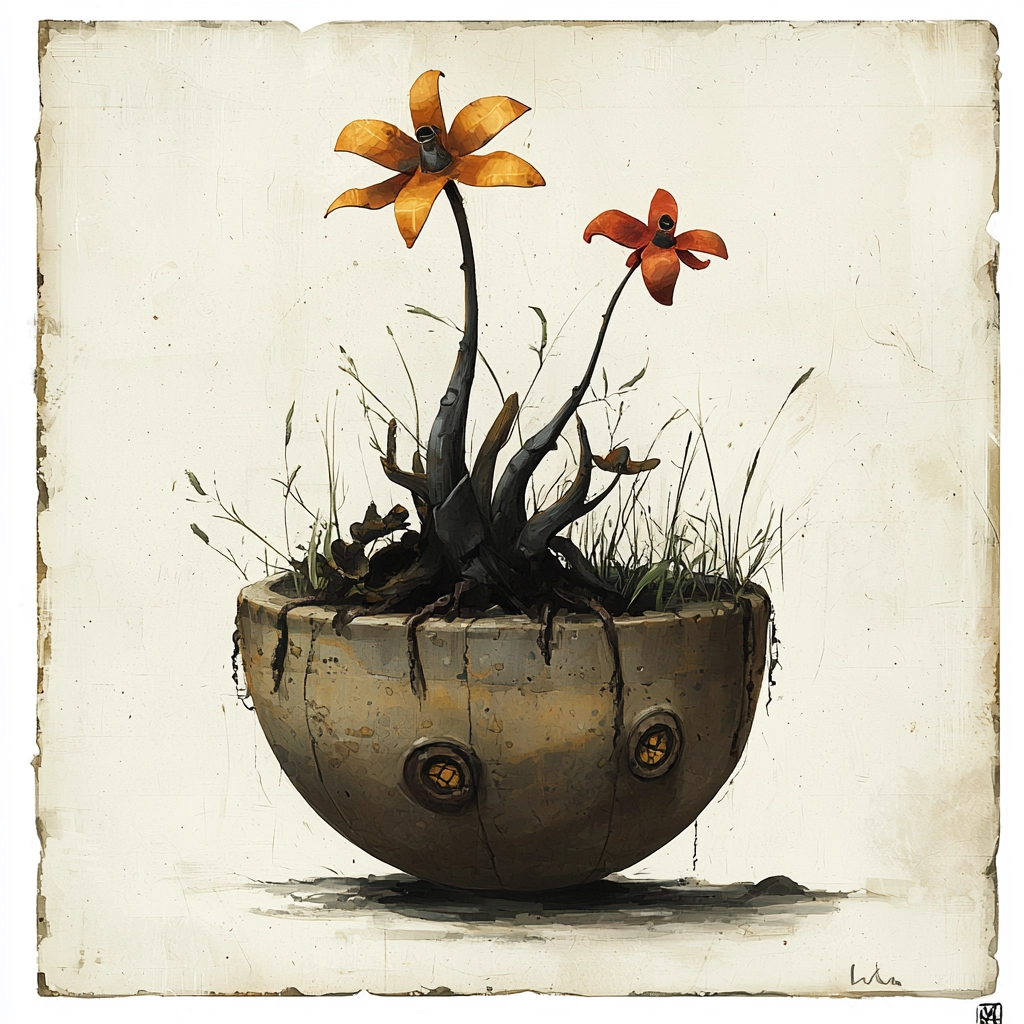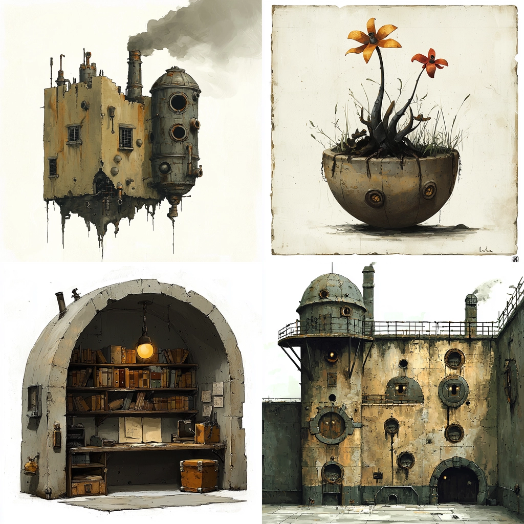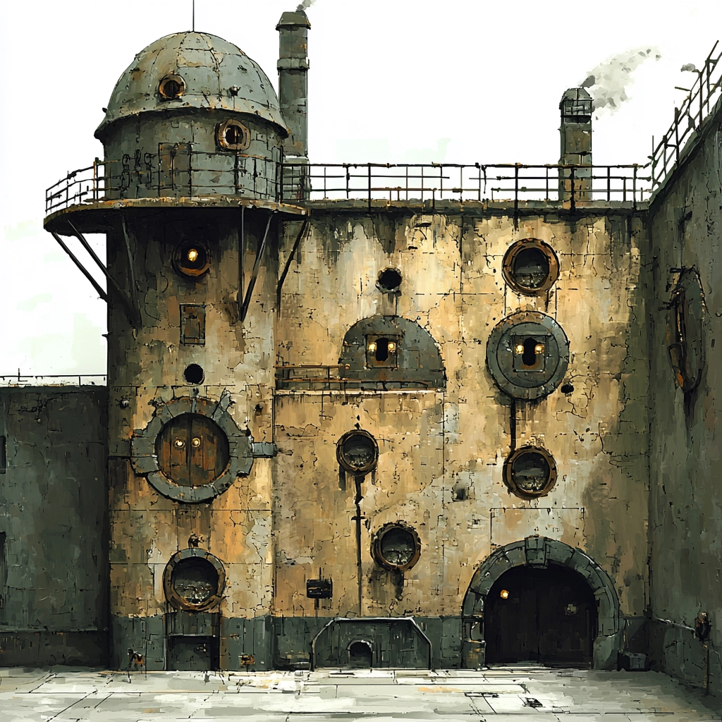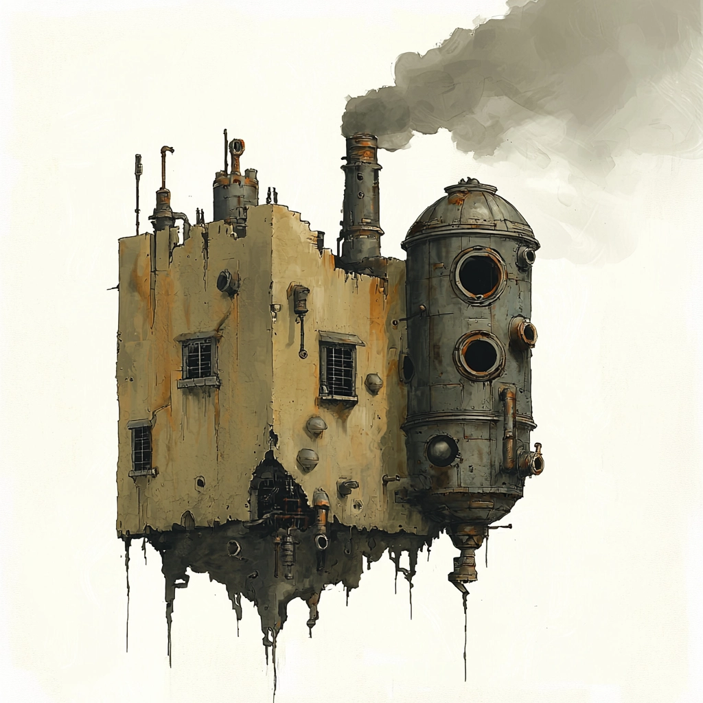 Muted tones and aged textures emphasize industrial design.