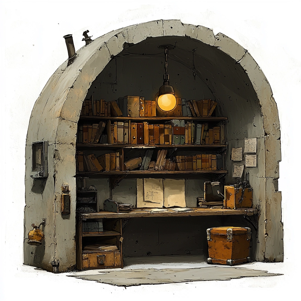 The muted beige and brown tones create a sense of wear and age, complemented by gray highlights. The lighting is soft, revealing detailed textures with an industrial robustness. The spatial composition uses balanced forms and depth to evoke utility.