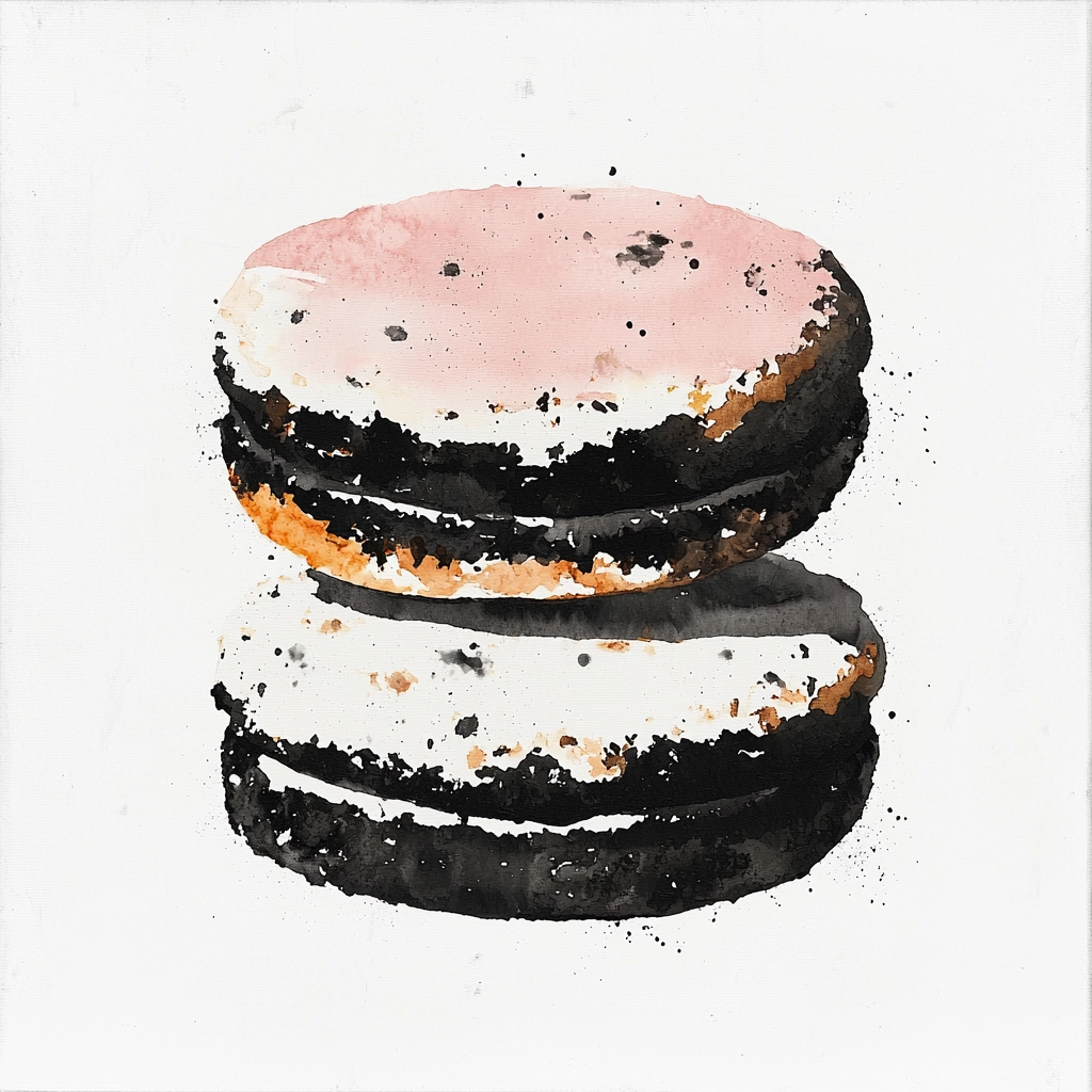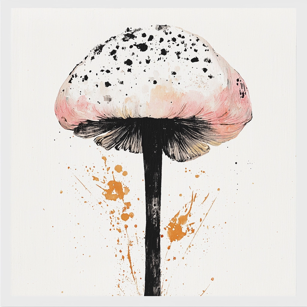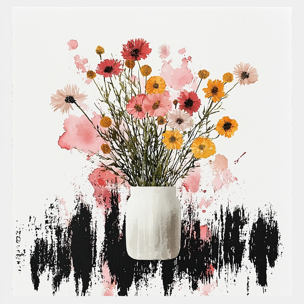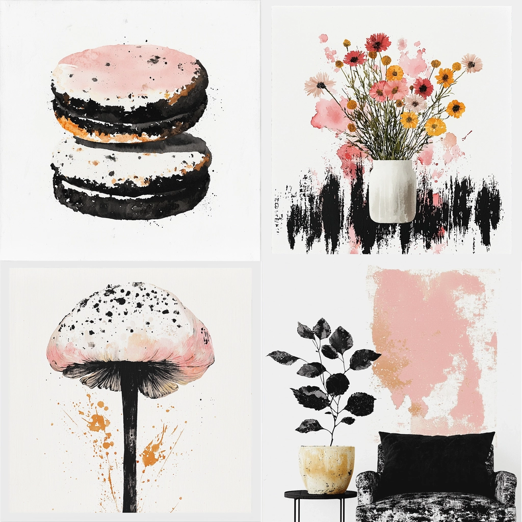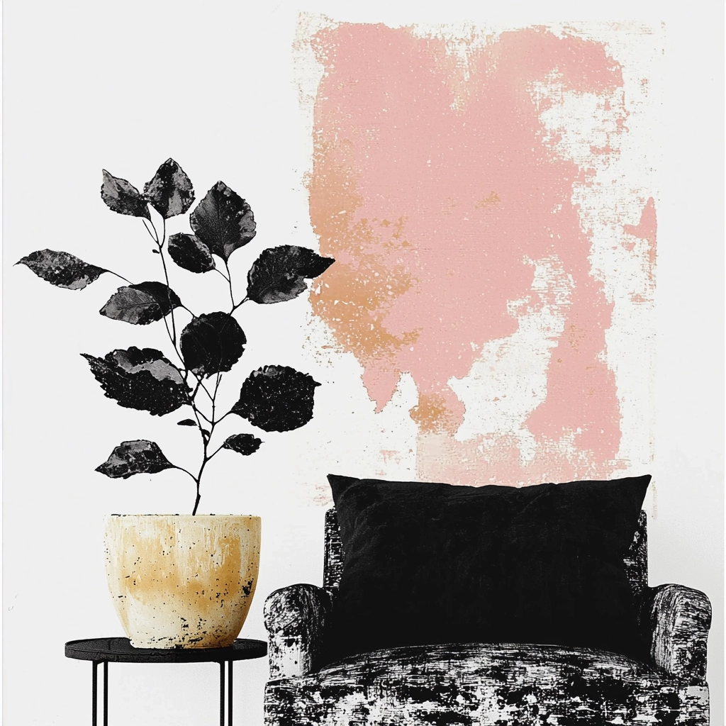The use of loose, brushy strokes creates dynamic black forms, softened by gentle washes of pink and orange. The expressive textures convey a sense of depth and movement, while maintaining an airy and open spatial composition.
