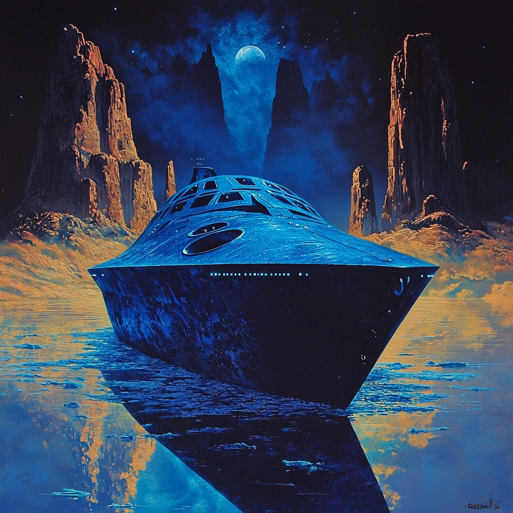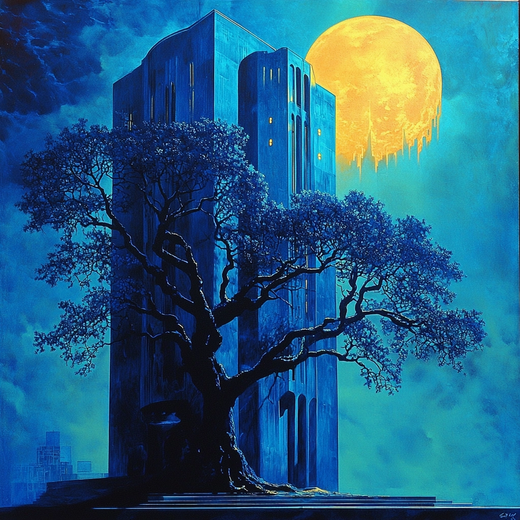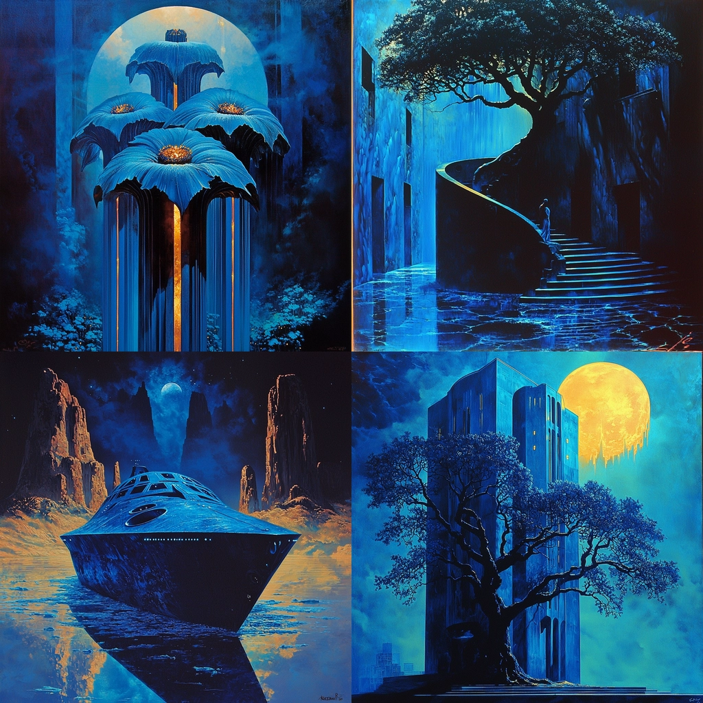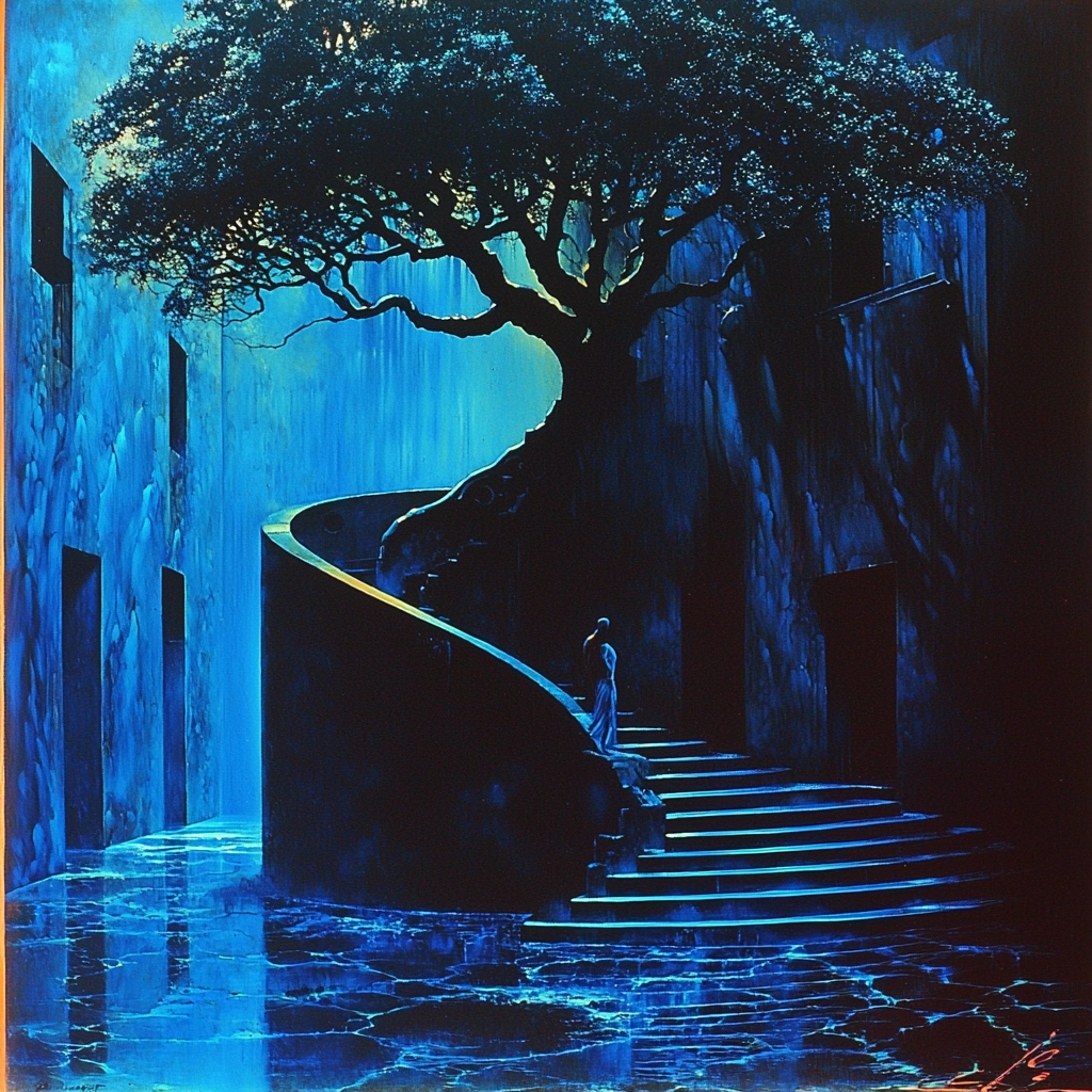 Rich blues dominate alongside high contrast elements, showcasing stark interplay between light and shade.