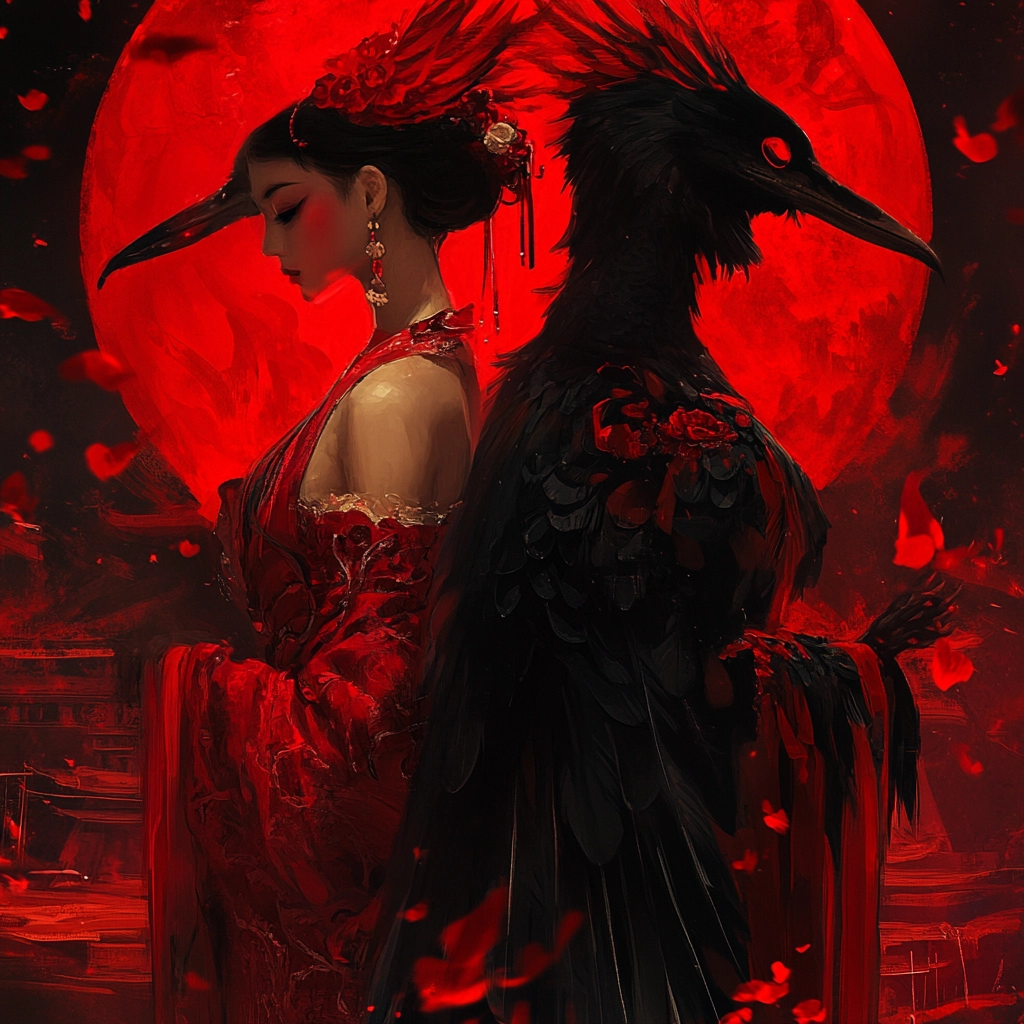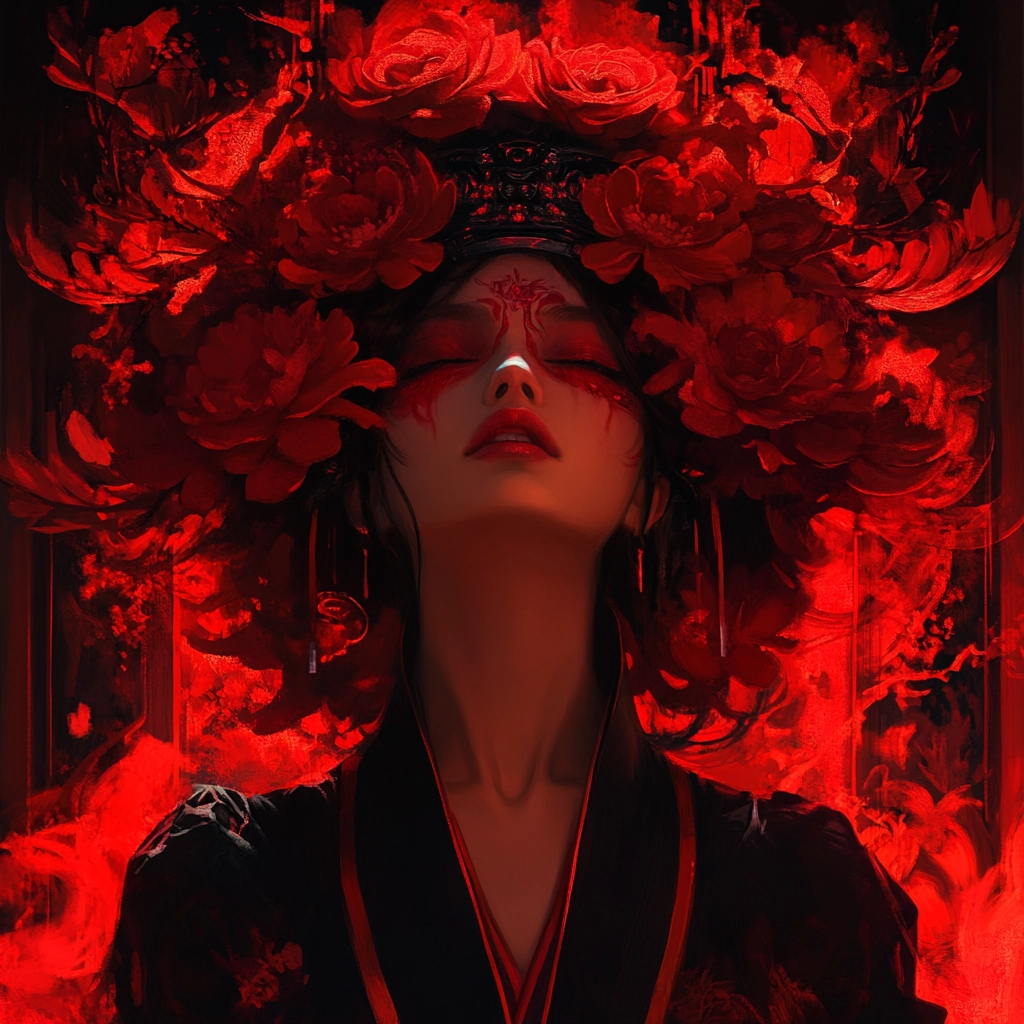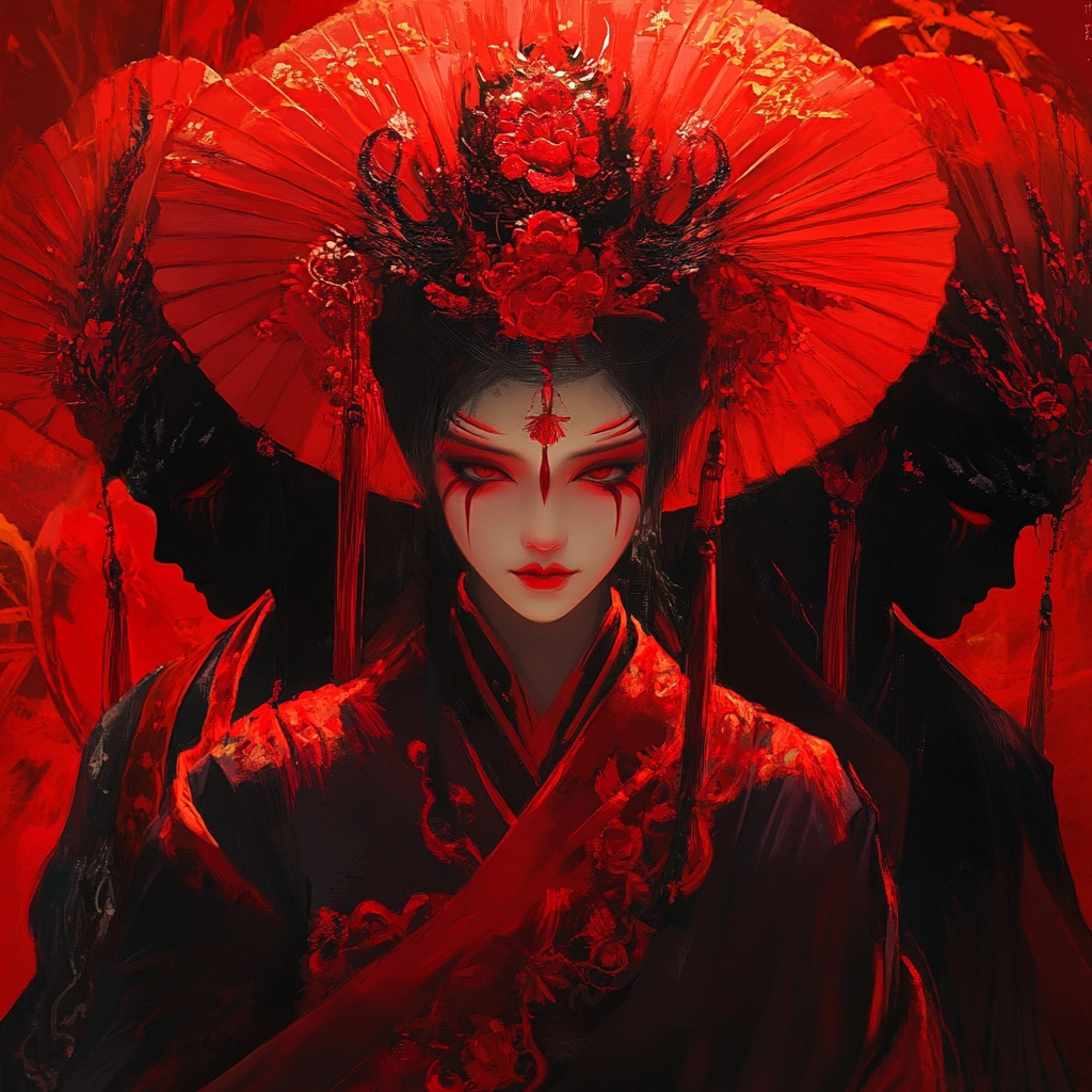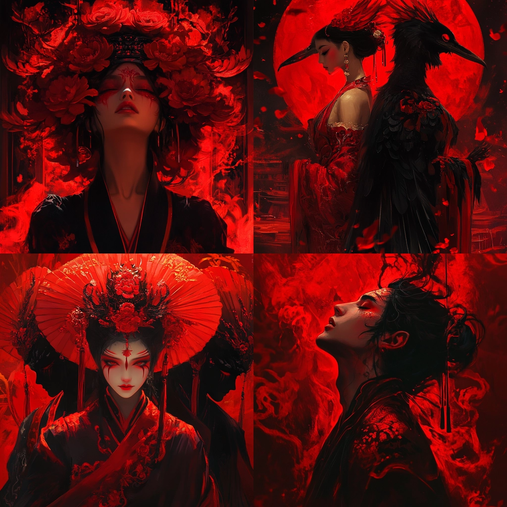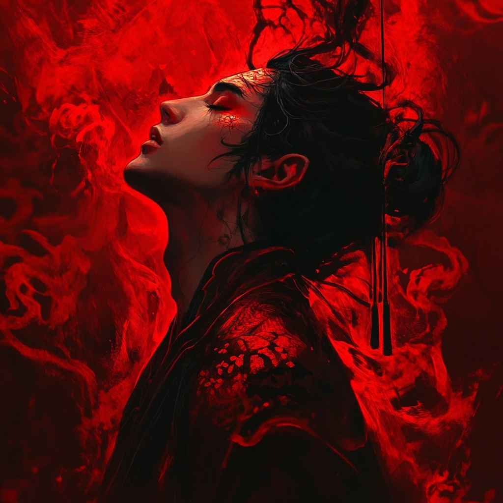 Rich reds and deep blacks dominate, creating dramatic visual impact.