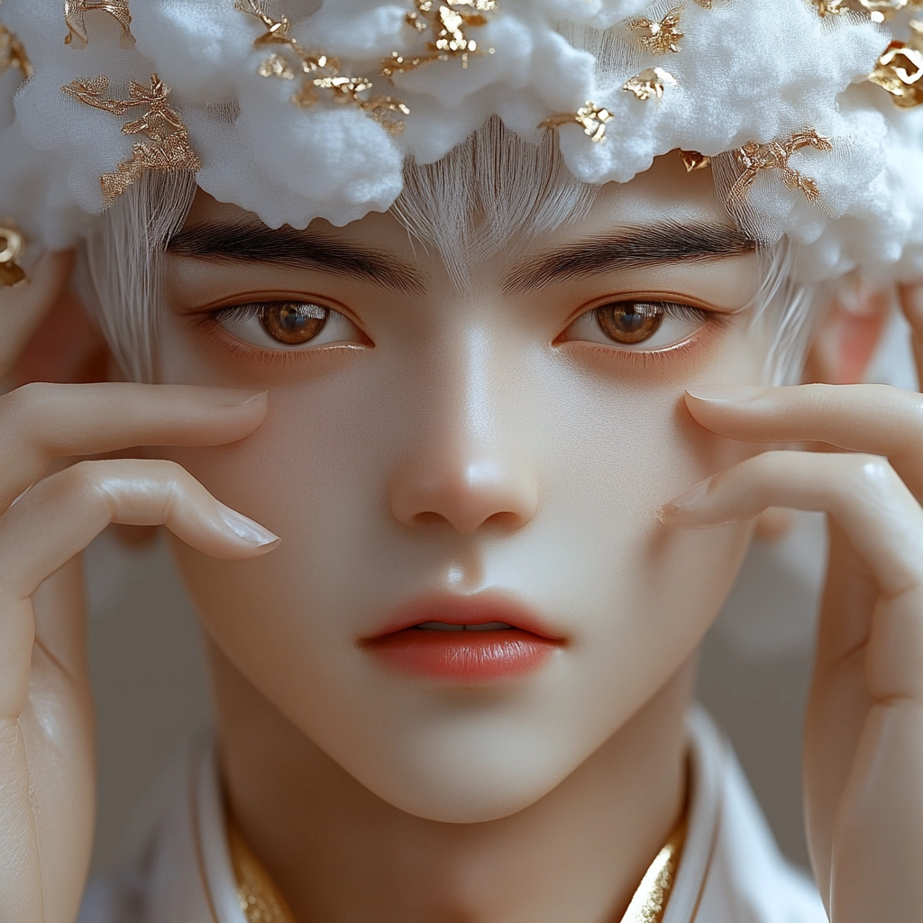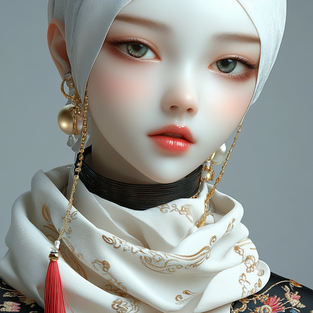 Rich textures with a focus on detailed fabric and ornate elements, creating a visually intricate presentation.