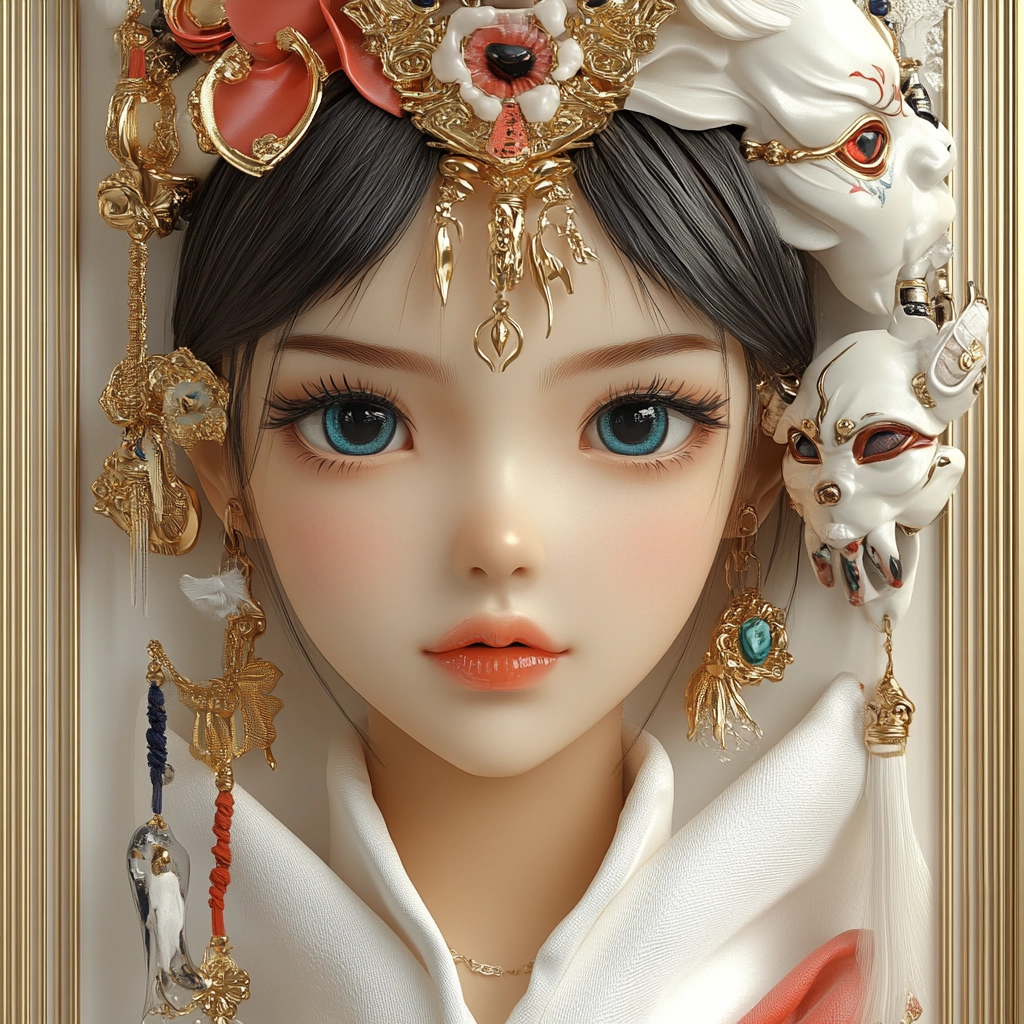 The artwork showcases a pristine use of white fabric, highlighted with gold threading and embellishments, exuding finesse. Subtle play of light enhances the depth of these textures, while the use of red provides a bold contrast. Elements are meticulously crafted, offering an illusion of tactile richness and spatial depth.
