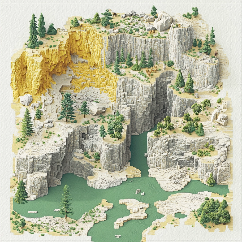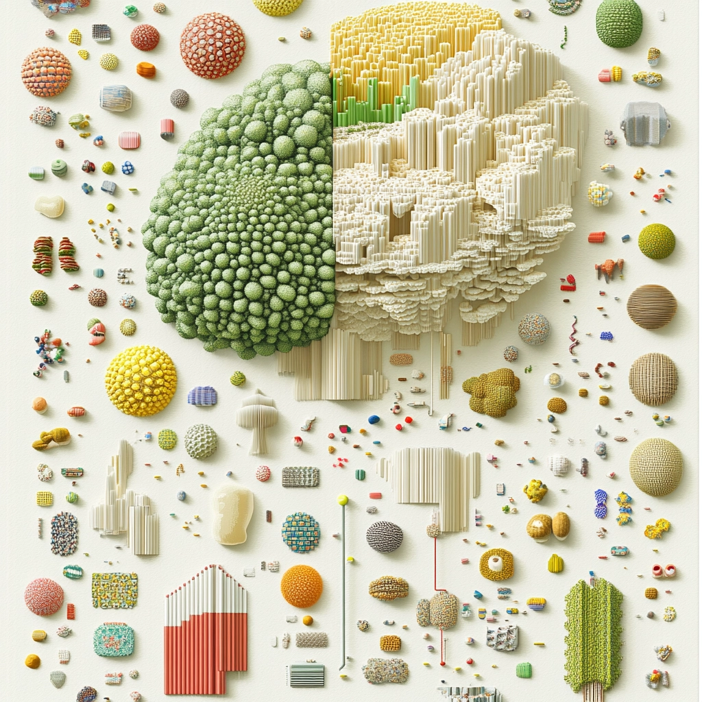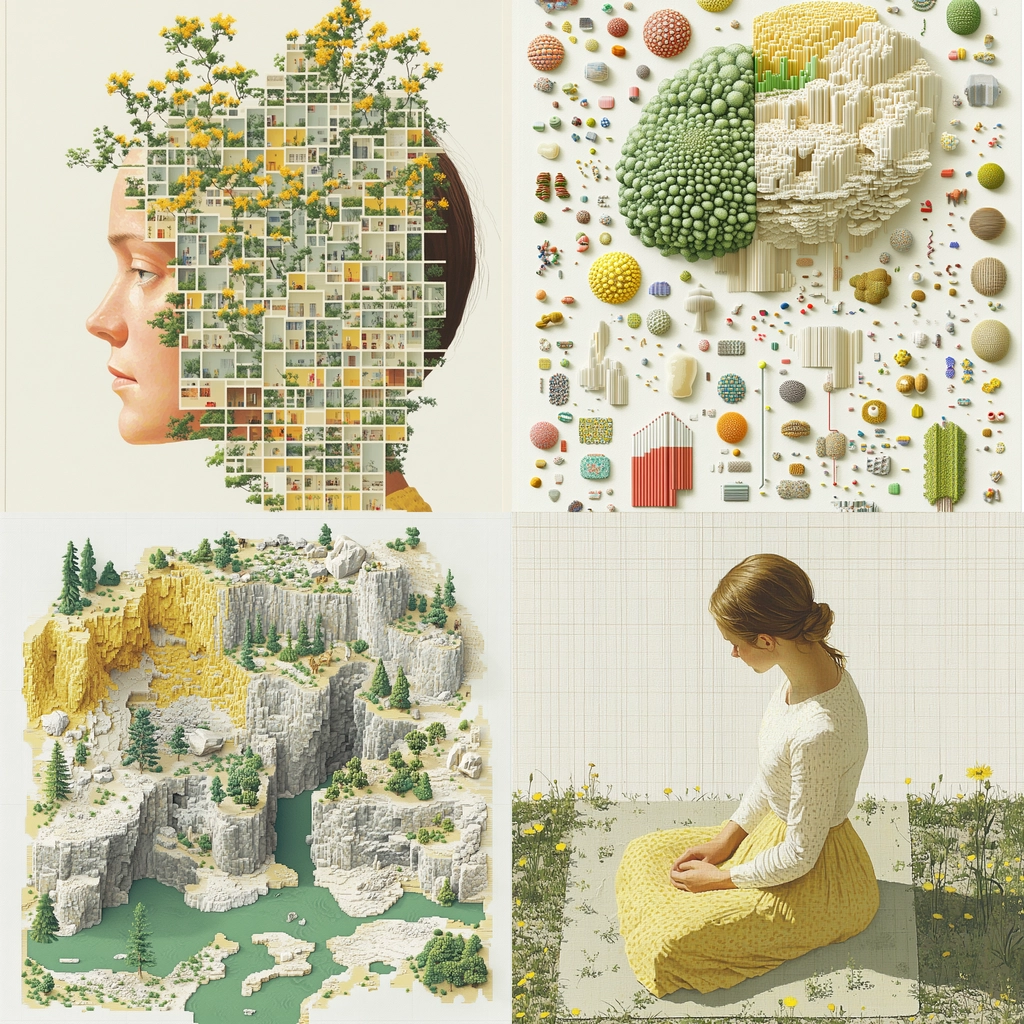 Delicate lighting enhances the fine details of each geometric structure, creating a sense of depth. The use of color alternates between muted tones and vivid spots, giving life to the textures of each element. Space is meticulously organized, and textures range from soft and porous to rigid and linear.