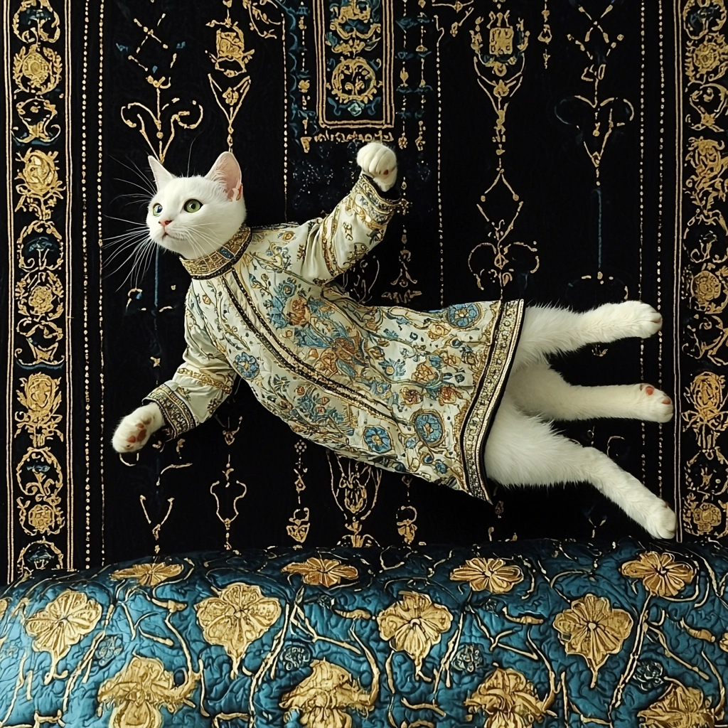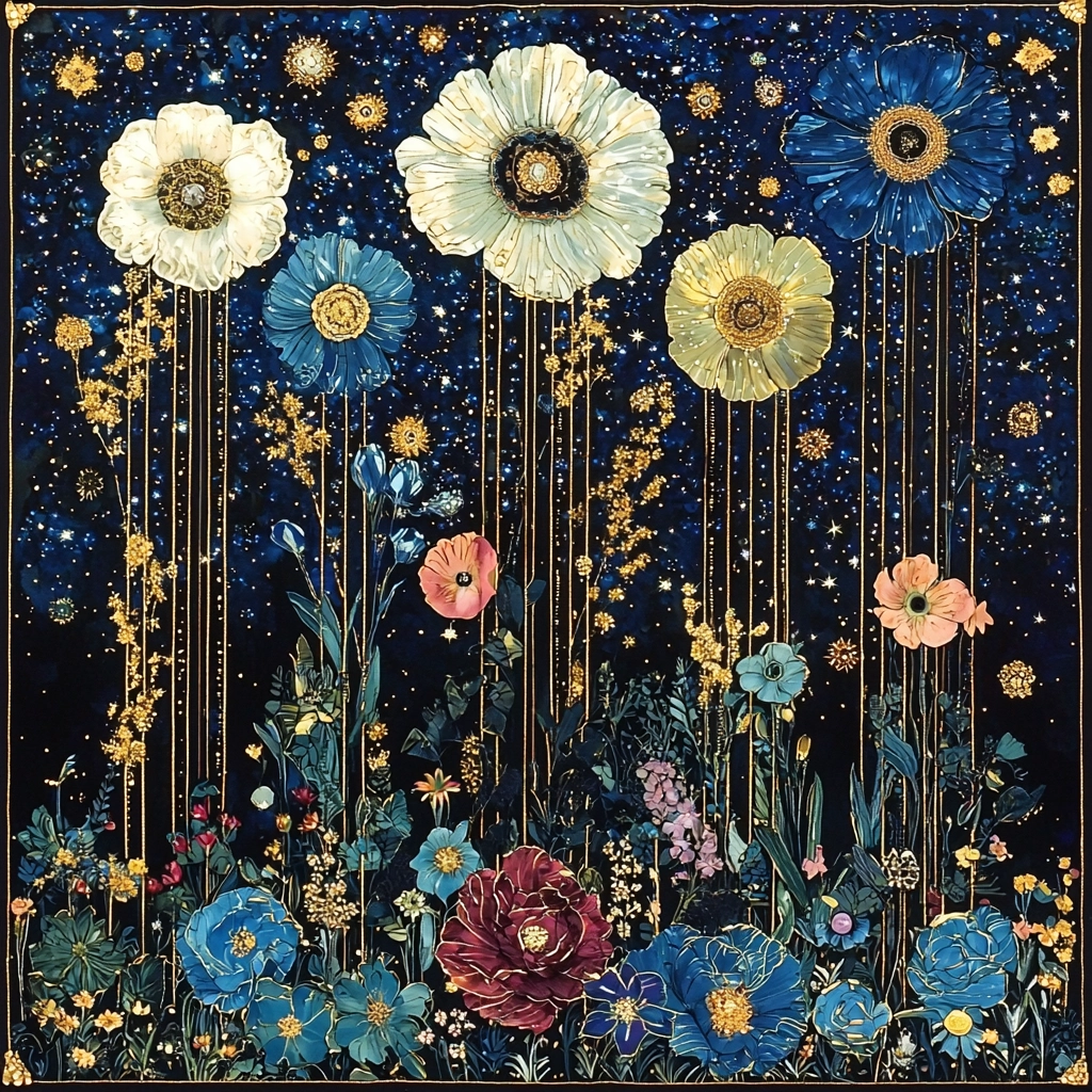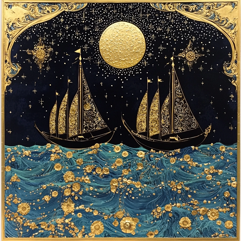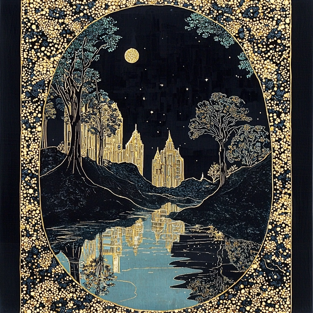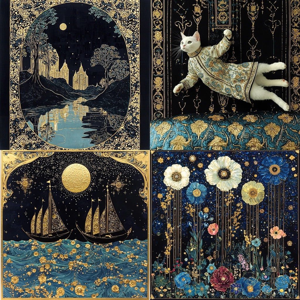 The use of dark blue provides a deep contrast to the luminous gold, imparting a sense of opulence. The detailed textures simulate woven fabrics and paint, creating a tactile sense. Lighting effects highlight ornate patterns and contribute to an elaborate spatial presence.